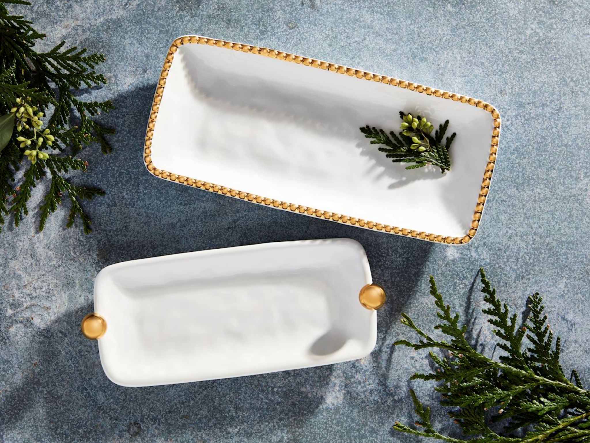 Nested set of two stoneware dishes with hand-painted gold bead rim and side handle detail.
