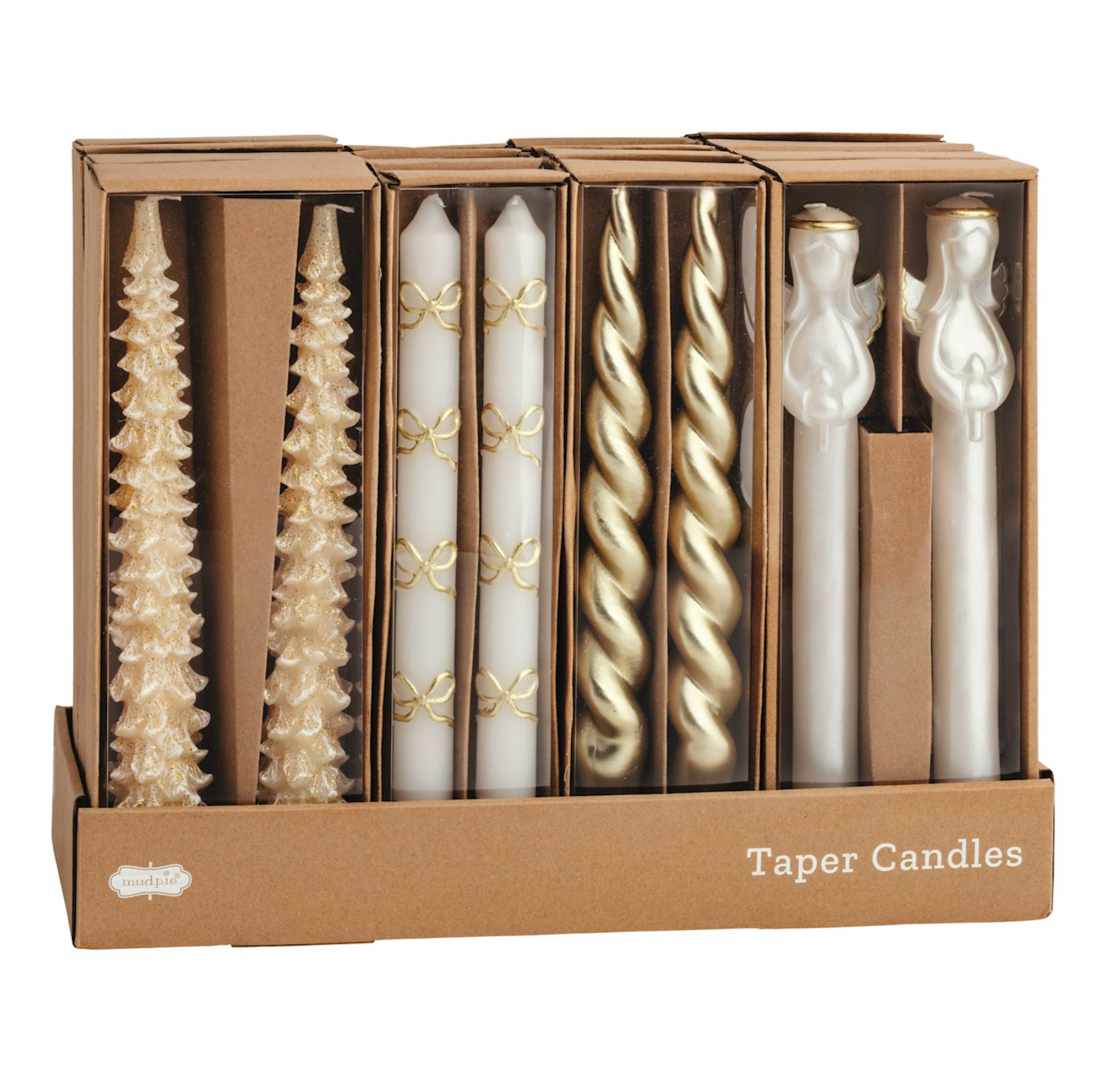 Set of two hand-painted wax taper candles. Comes gift boxed in kraft displayer.