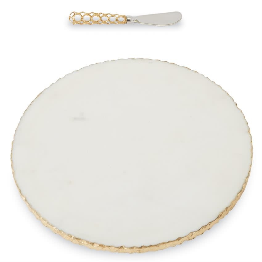2-piece set. Marble board features gold foiled textured raw edge and arrives tied with metal spreader with netted gold metal handle.