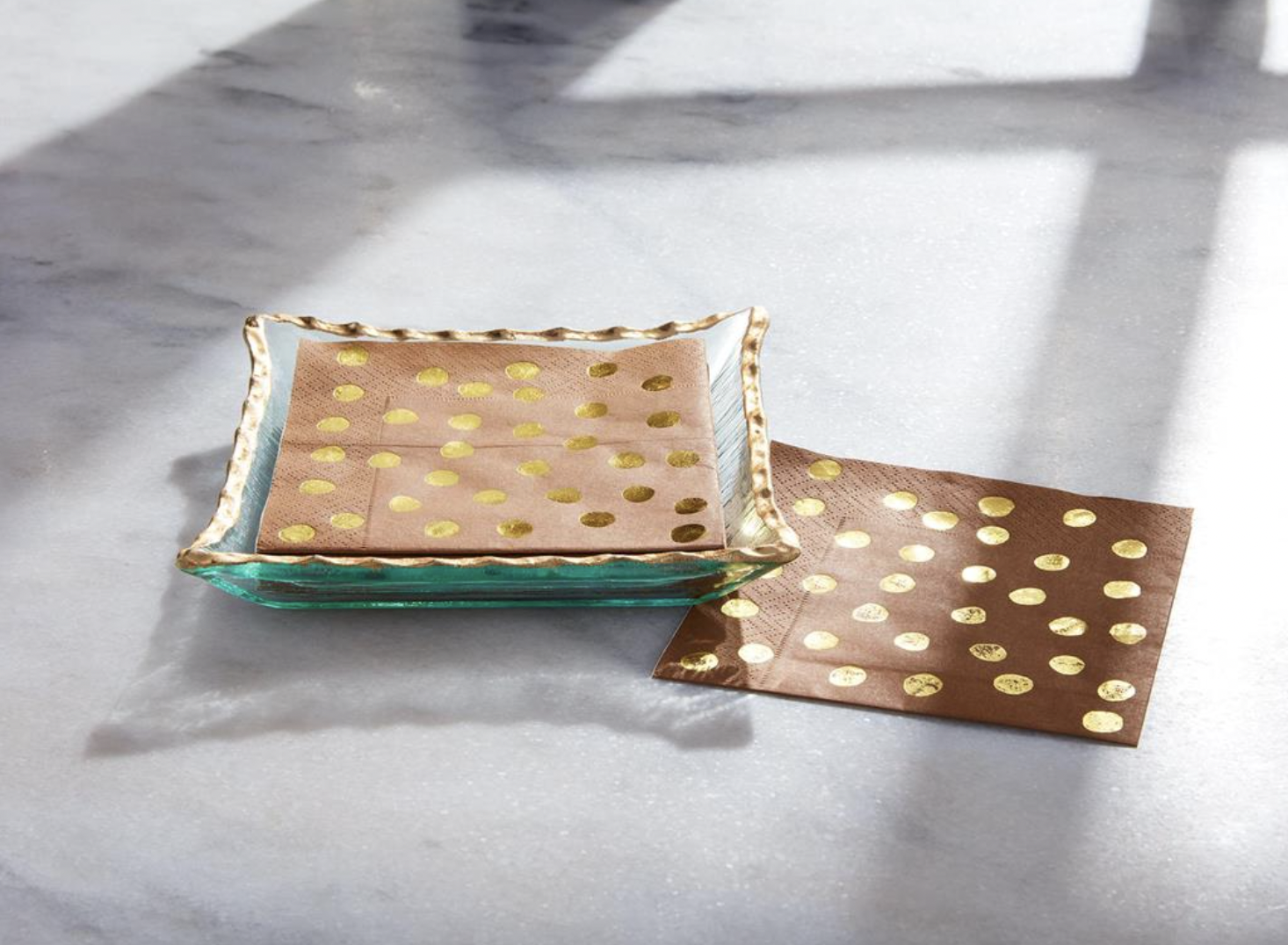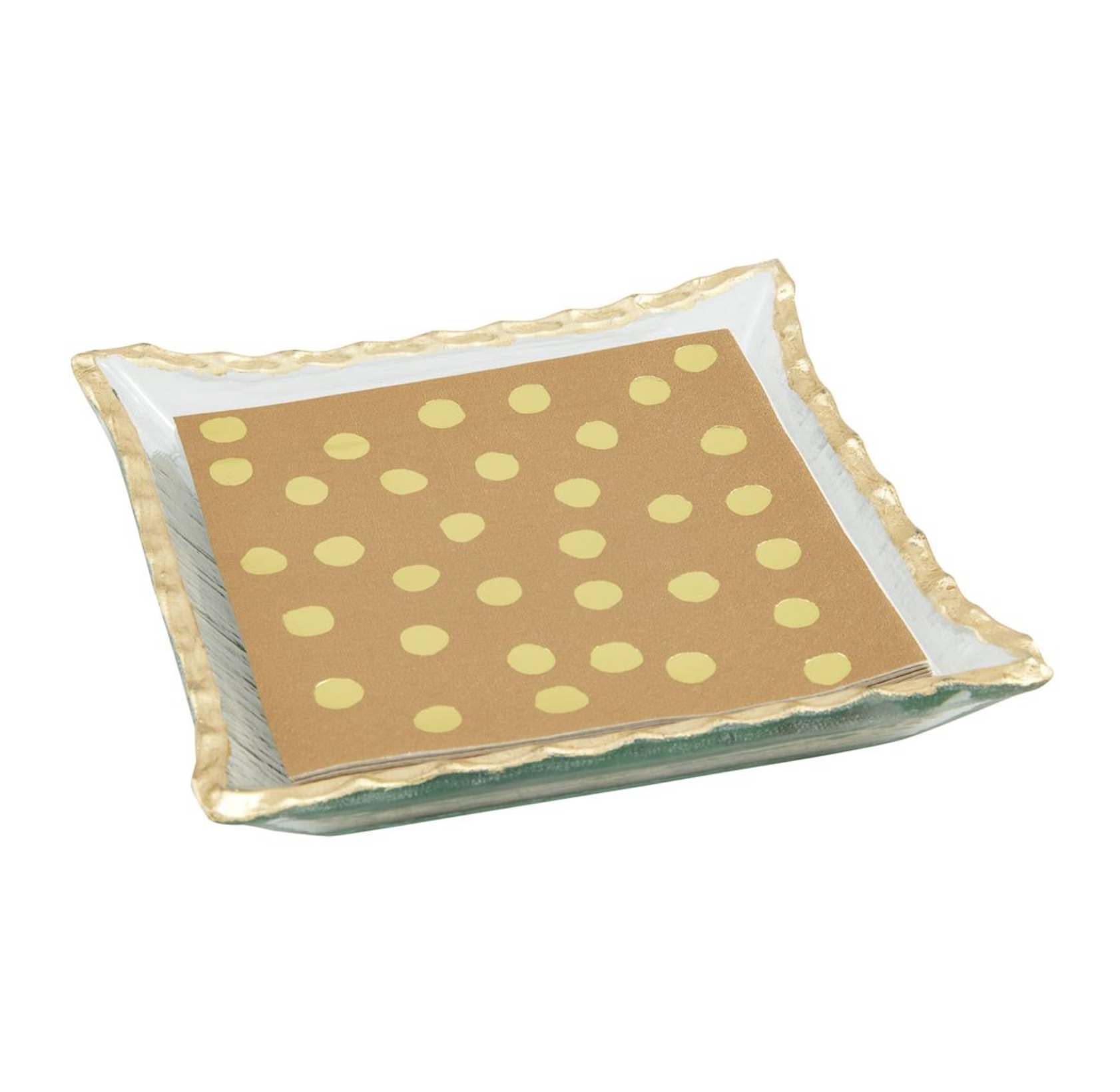 2-piece set. Glass napkin caddy with gold foil raw edge. Comes with pack of 12 foiled kraft napkins.
