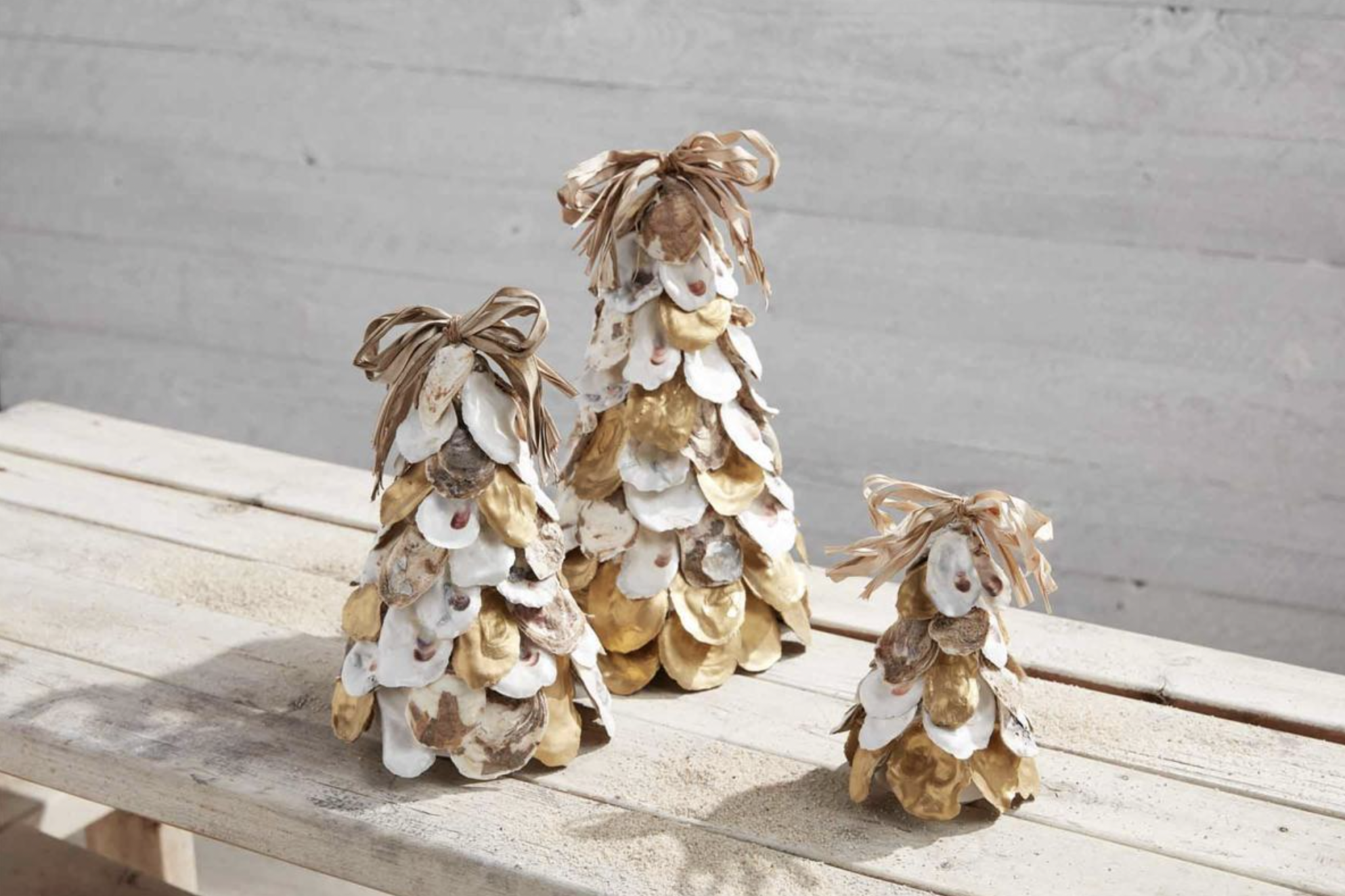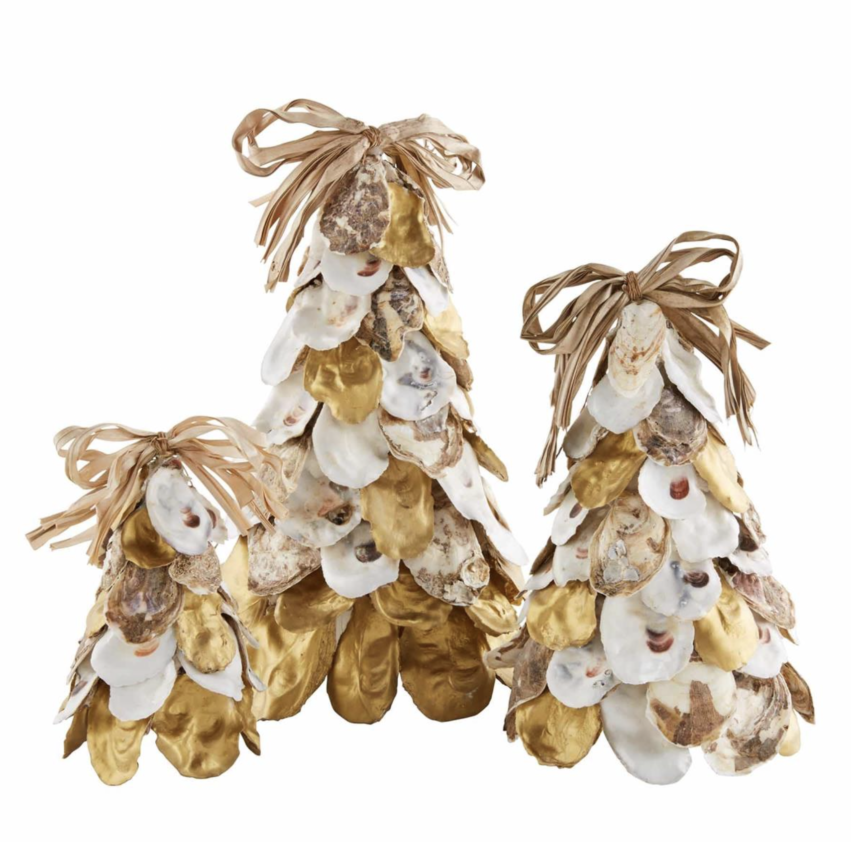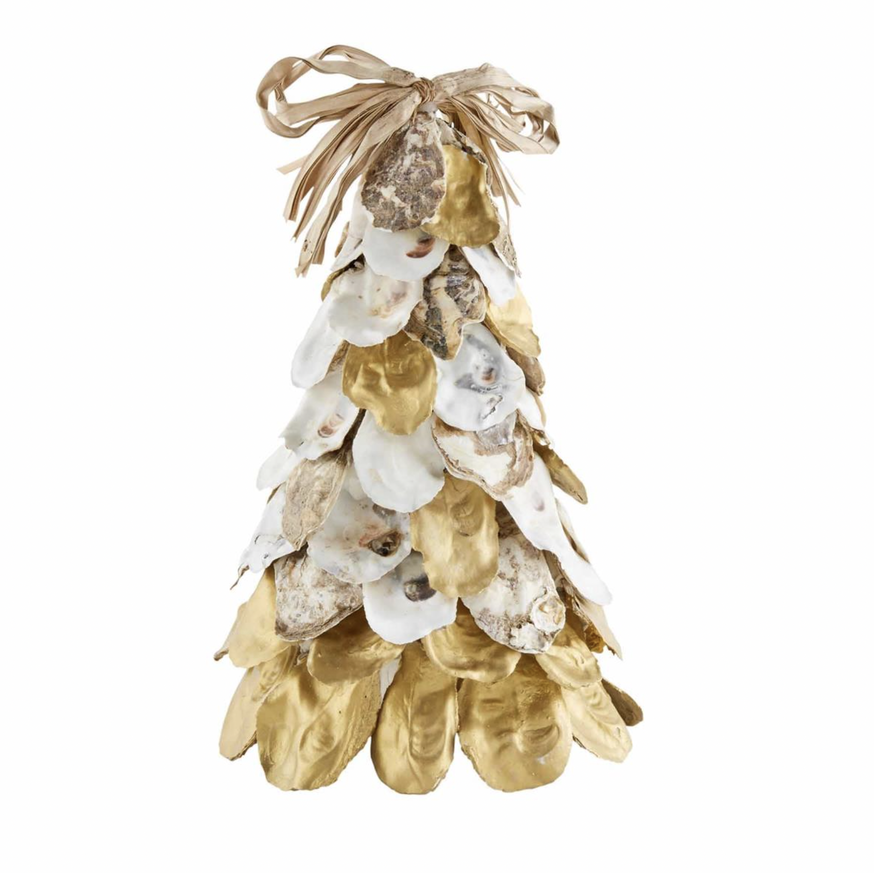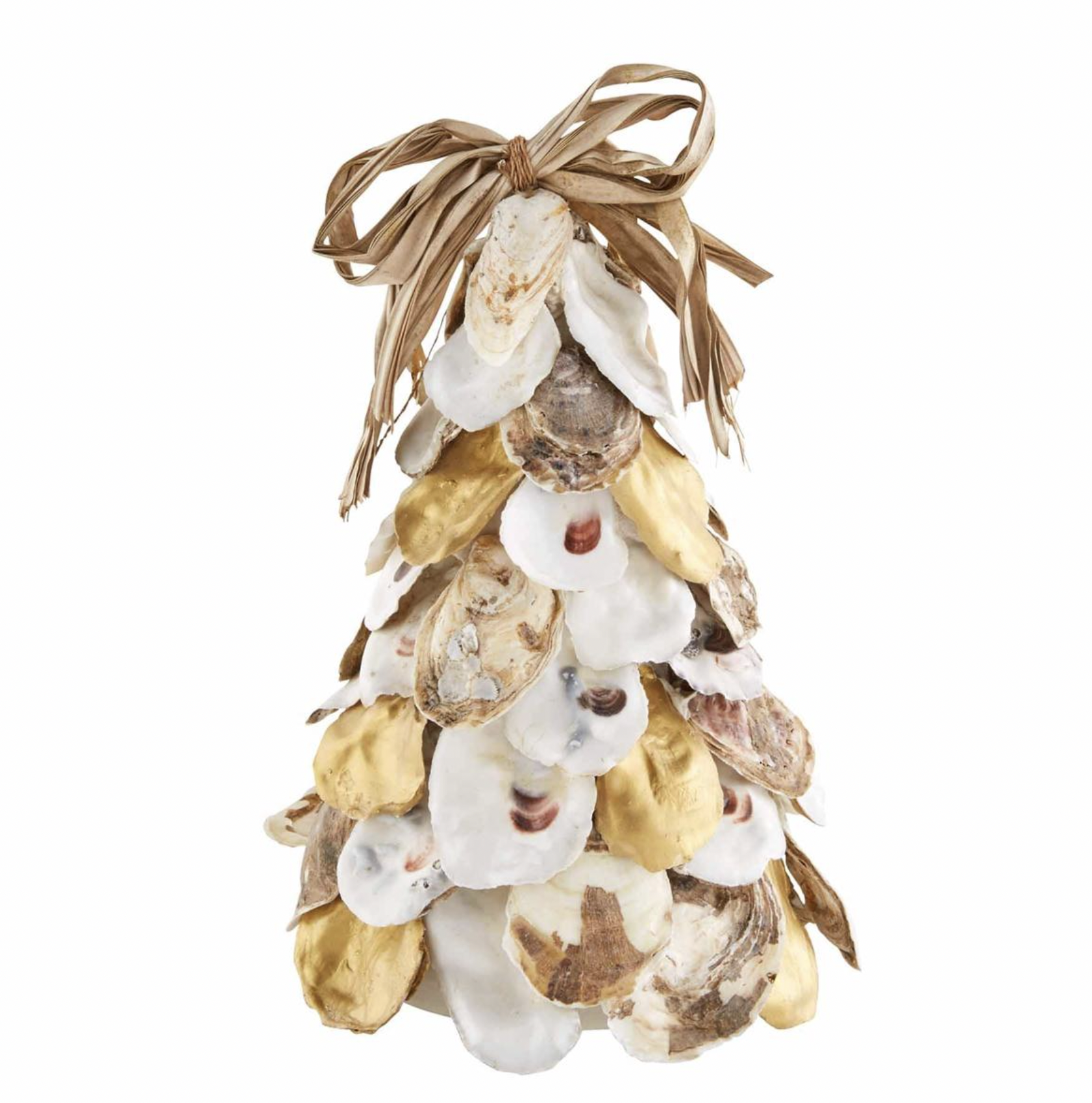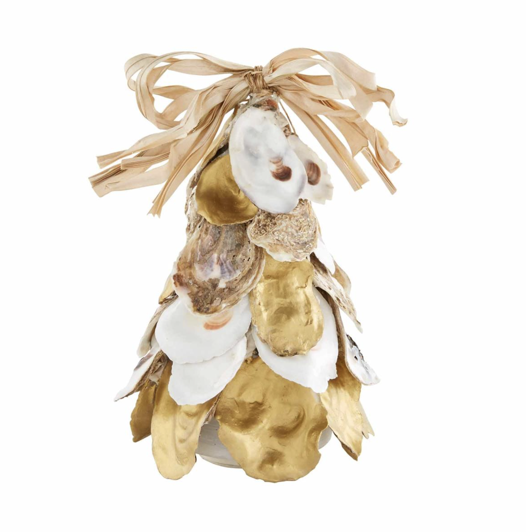 Natural and gold hand-painted oyster shell decorative tree sitter with raffia bow.