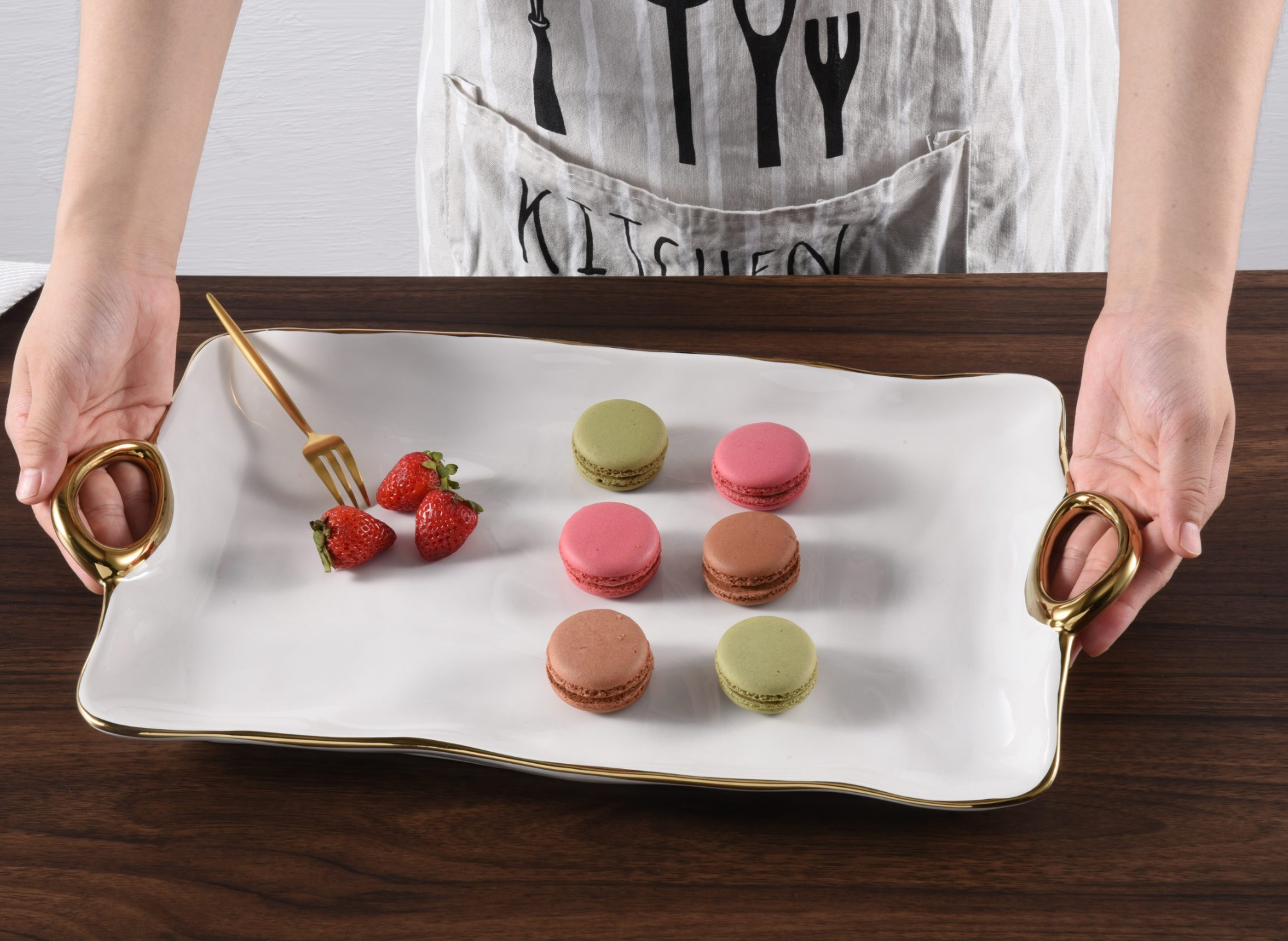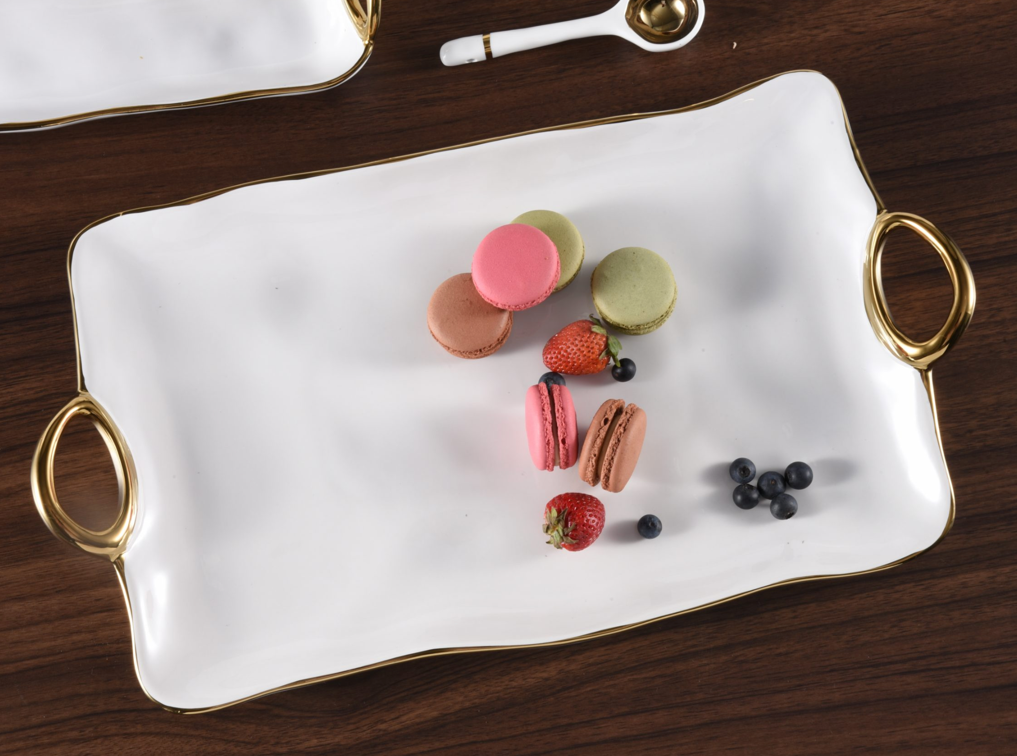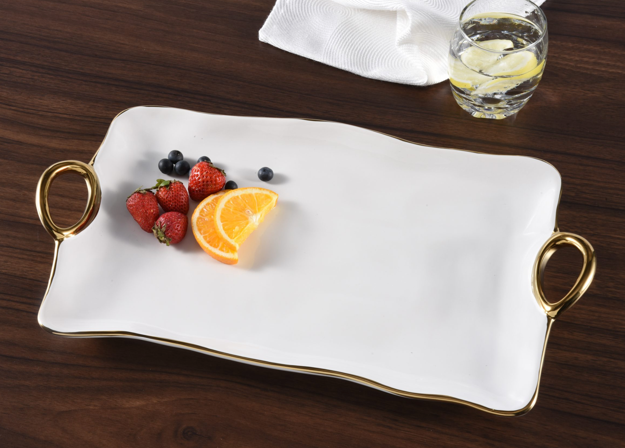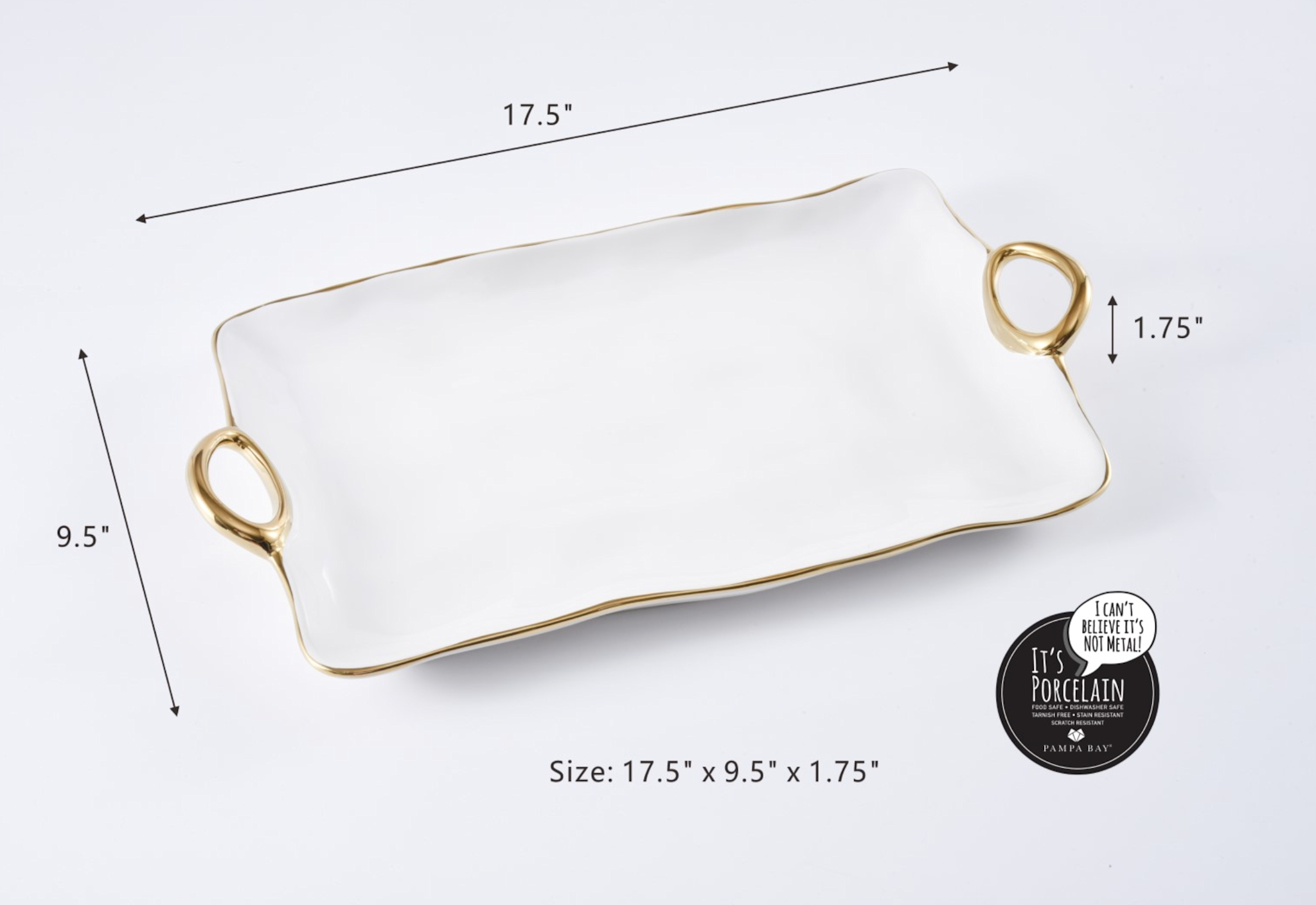Large Tray in Golden Handles. In casual and formal settings, this tray can be used to serve the main course, your favorite grilled vegetables or even dessert! Stunning white porcelain with smooth and fluent handles in gold titanium. Food safe, dishwasher safe, oven safe to 500°. Easy Care.