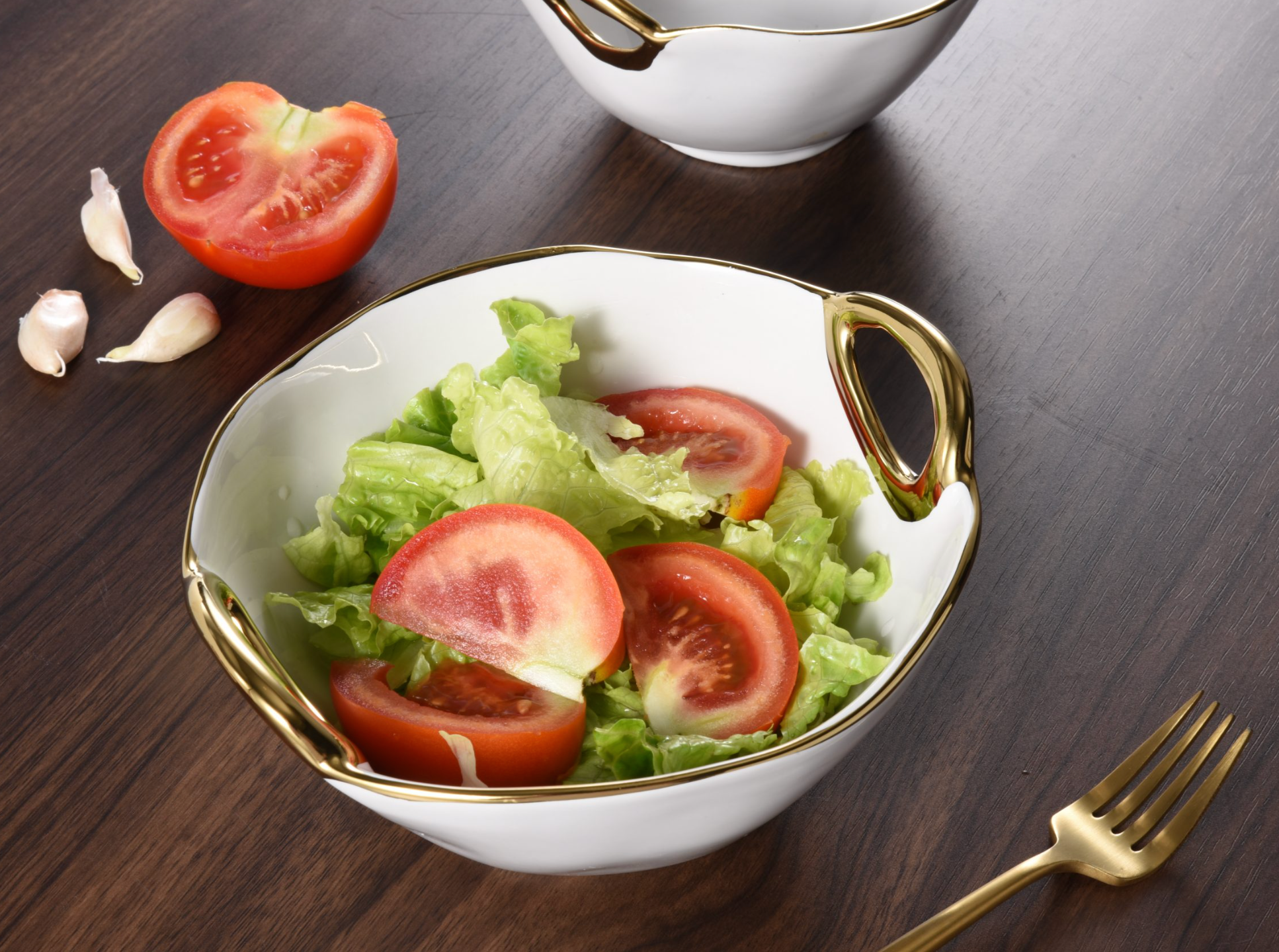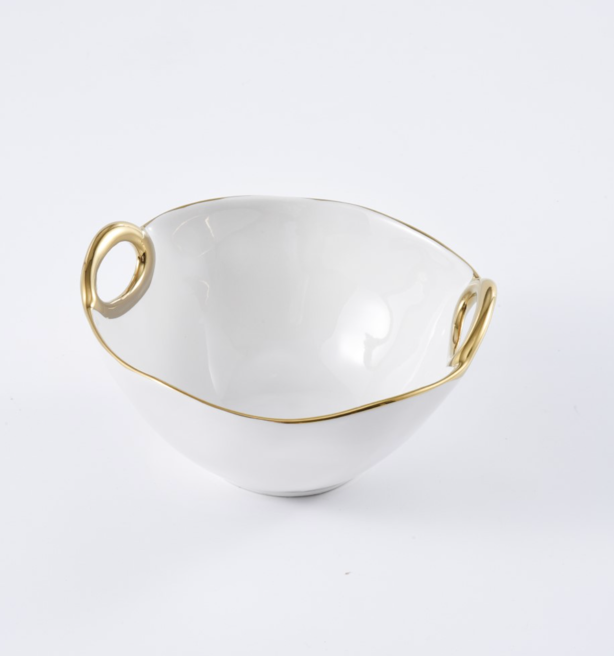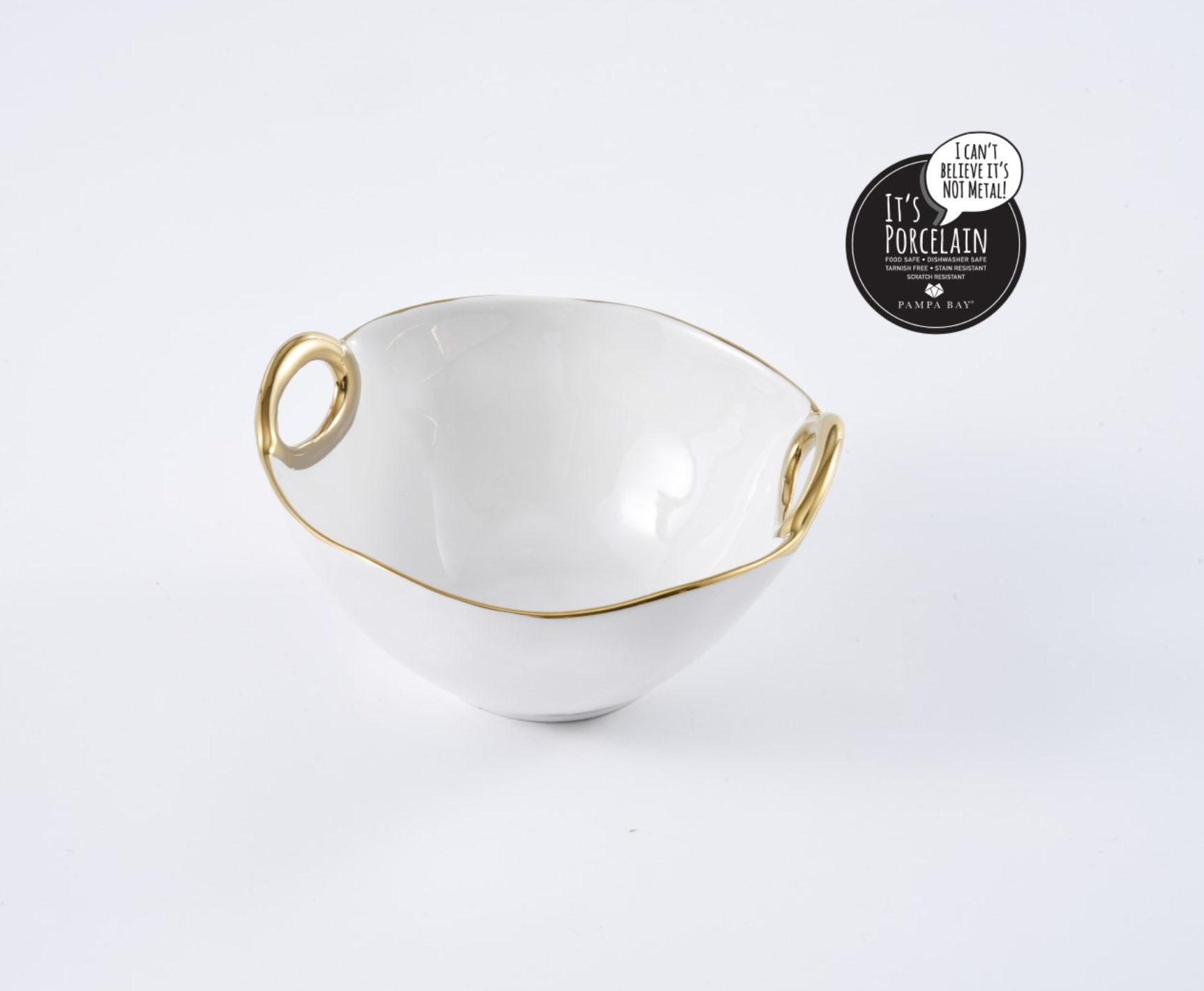 Medium Bowl in Golden Handles. Whatever you are serving, from salads to sides, they will look even more appetizing in this beautiful bowl. Stunning white porcelain with smooth and fluent handles in gold titanium. Food safe, dishwasher safe, oven safe to 500°. Easy Care.