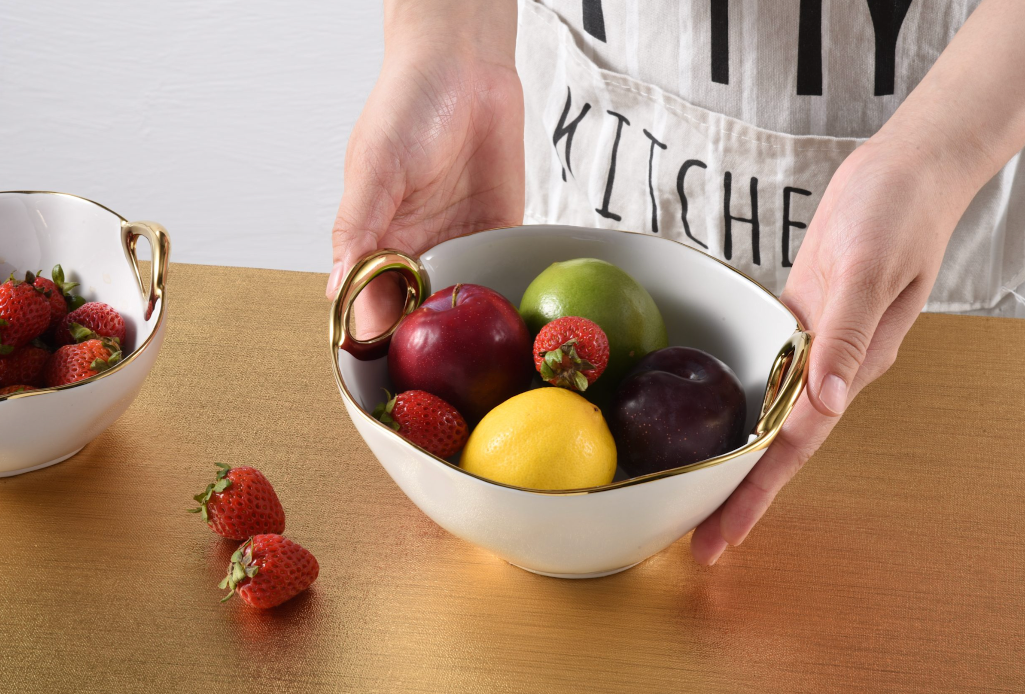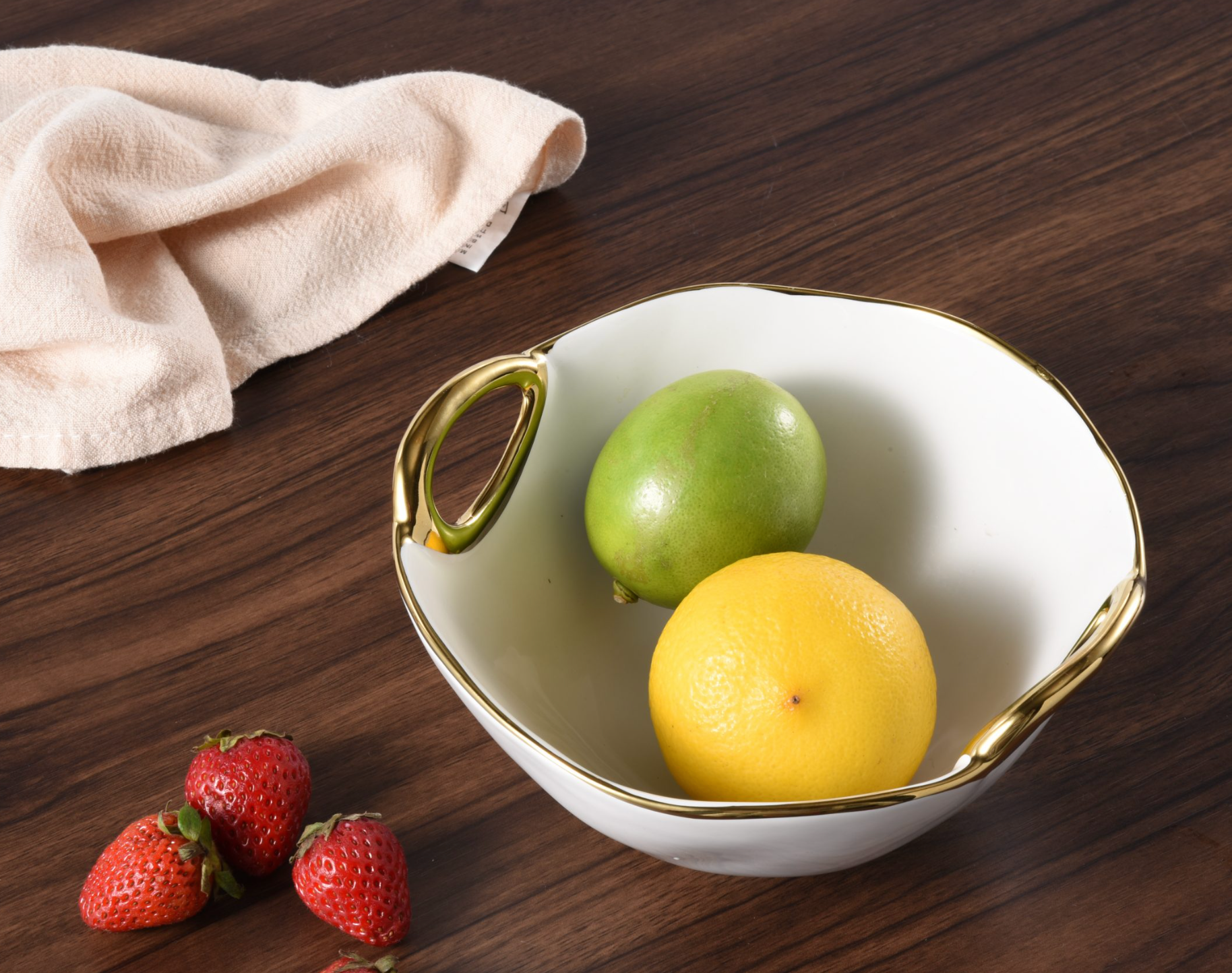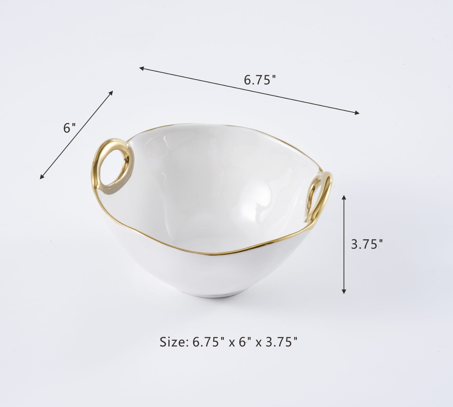 Medium Bowl in Golden Handles. Whatever you are serving, from salads to sides, they will look even more appetizing in this beautiful bowl. Stunning white porcelain with smooth and fluent handles in gold titanium. Food safe, dishwasher safe, oven safe to 500°. Easy Care.