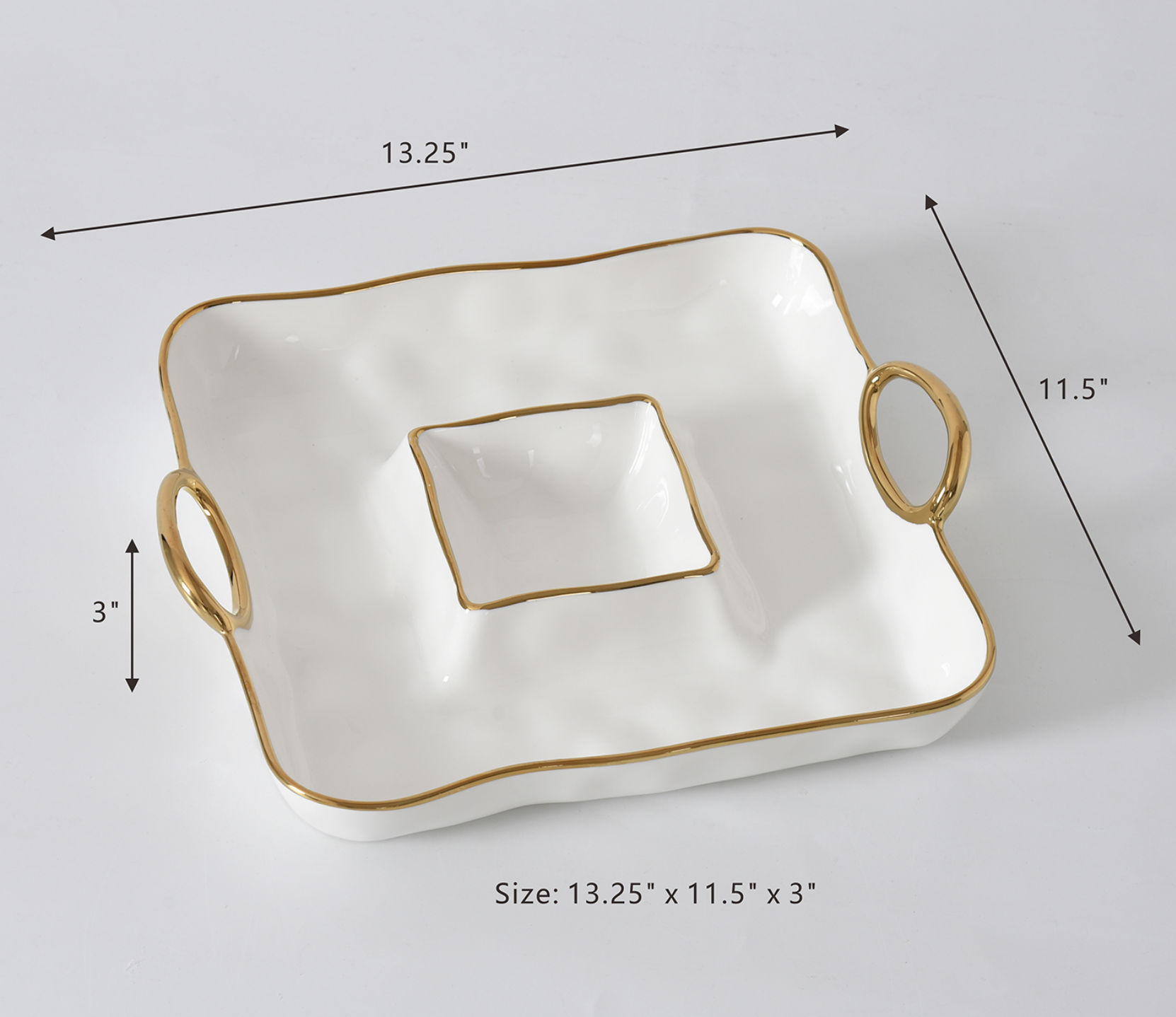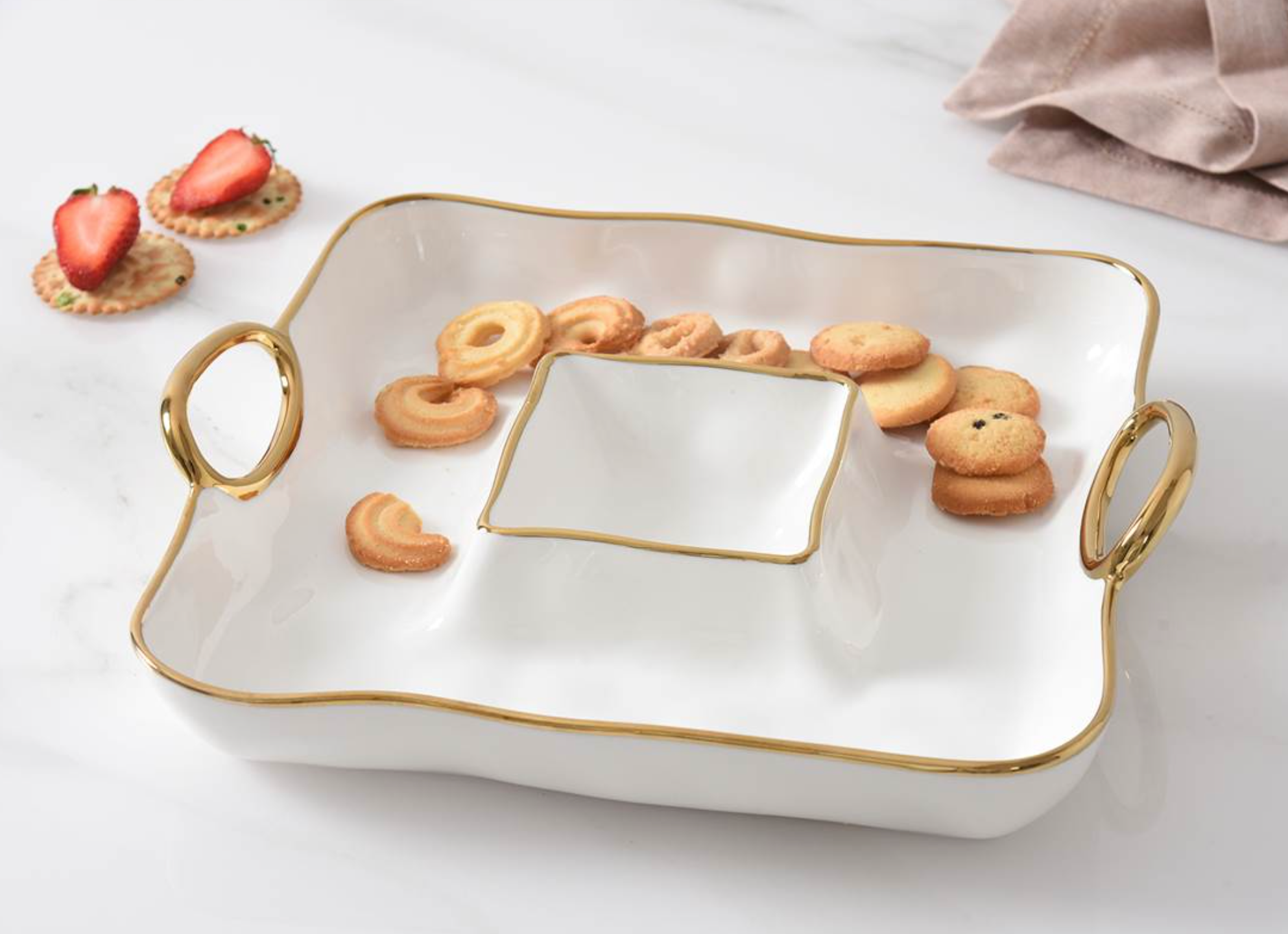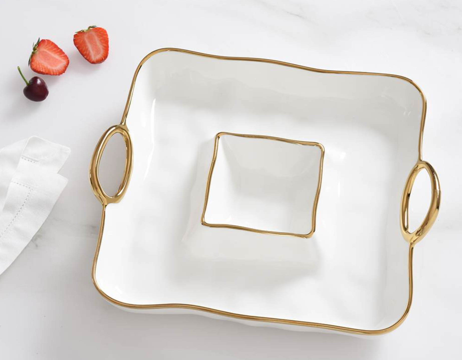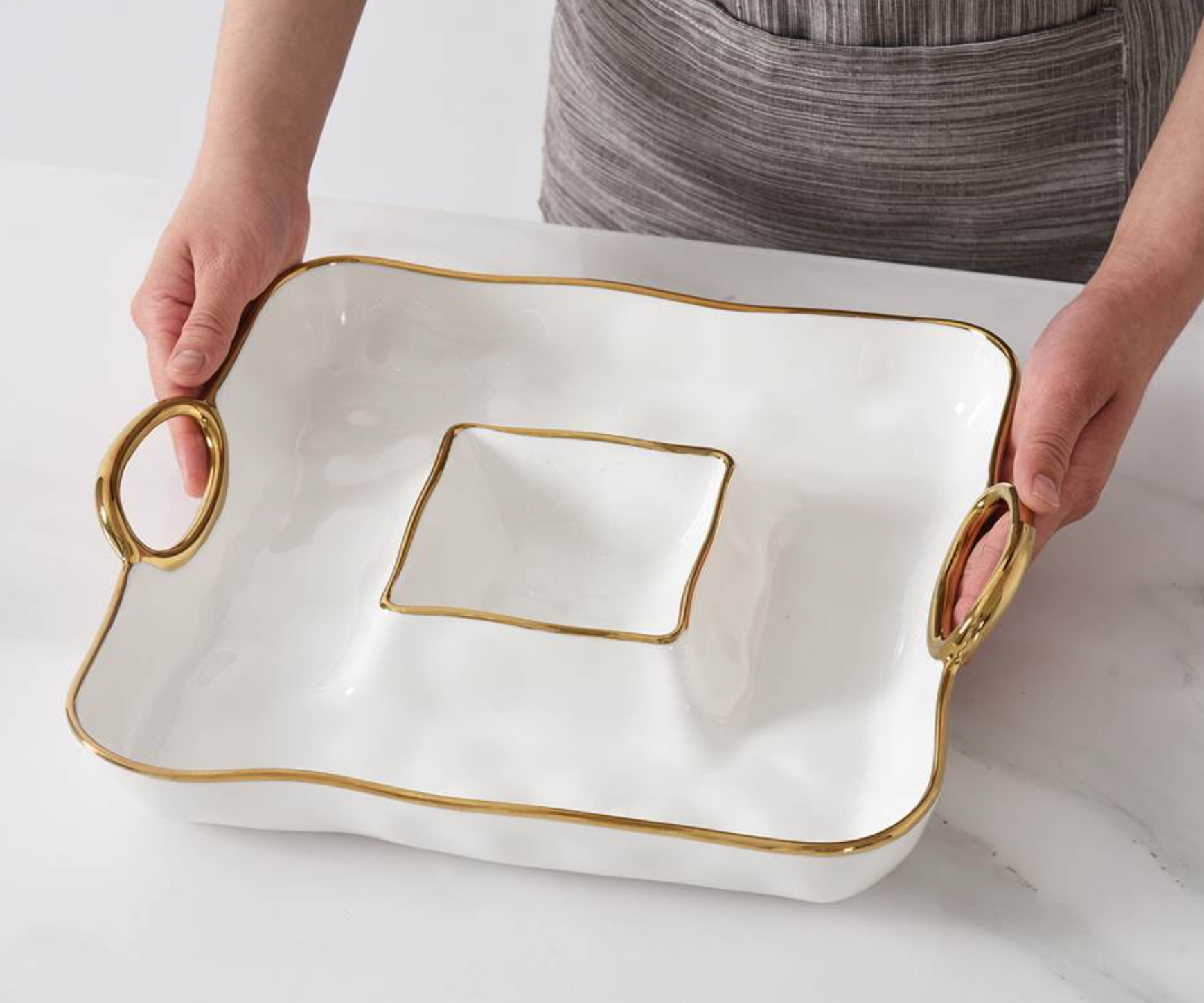 Golden Handles Square Chip & Dip. Perfect for any dip combo : hummus and pita, salsa and tortilla chips, veggies and ranch or our favorite berries and whipped cream! Gleaming white porcelain with smooth and graceful rim and handles in gold. Food safe. Dishwasher safe. Oven safe to 500°F. Easy Care.