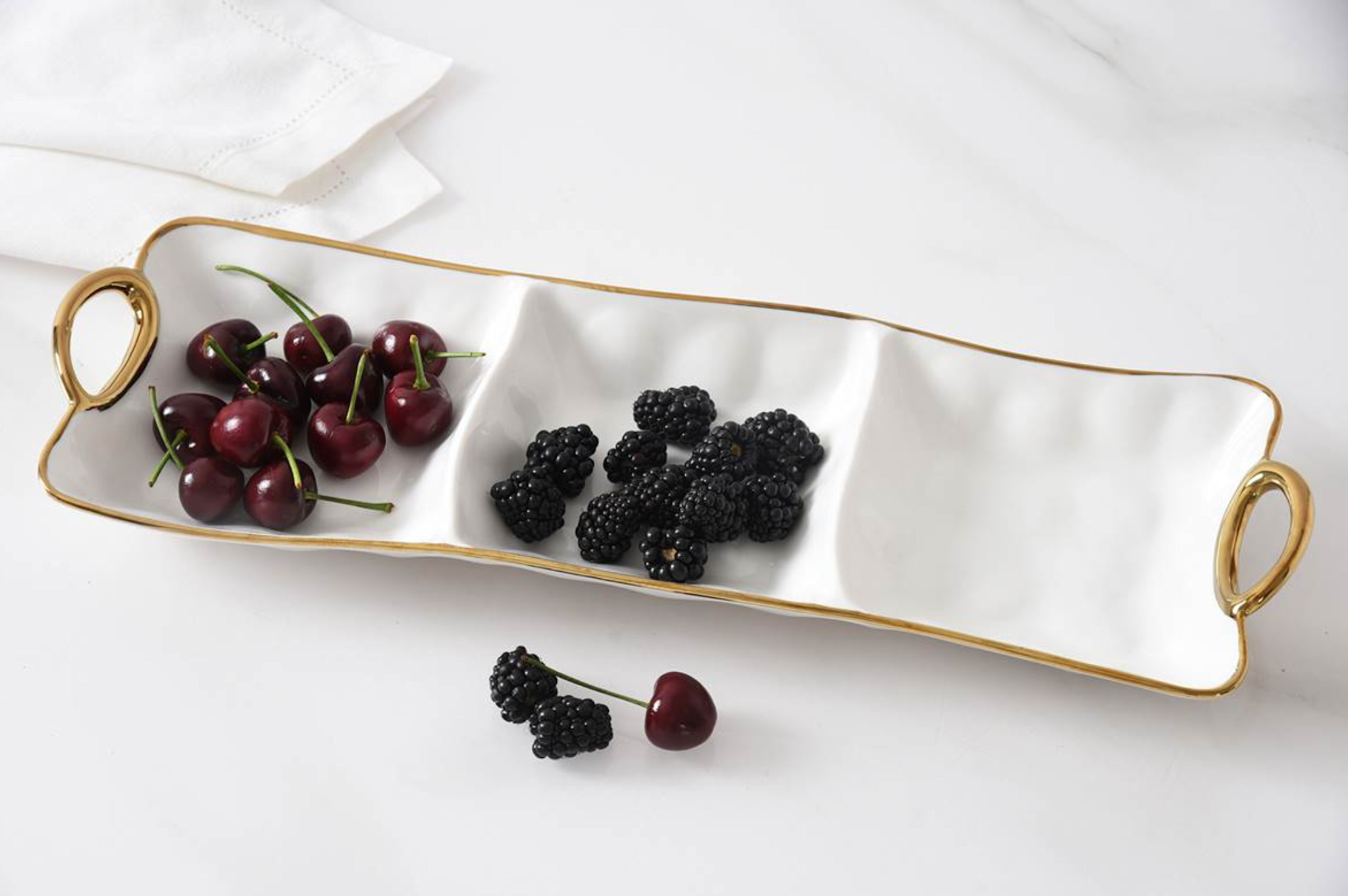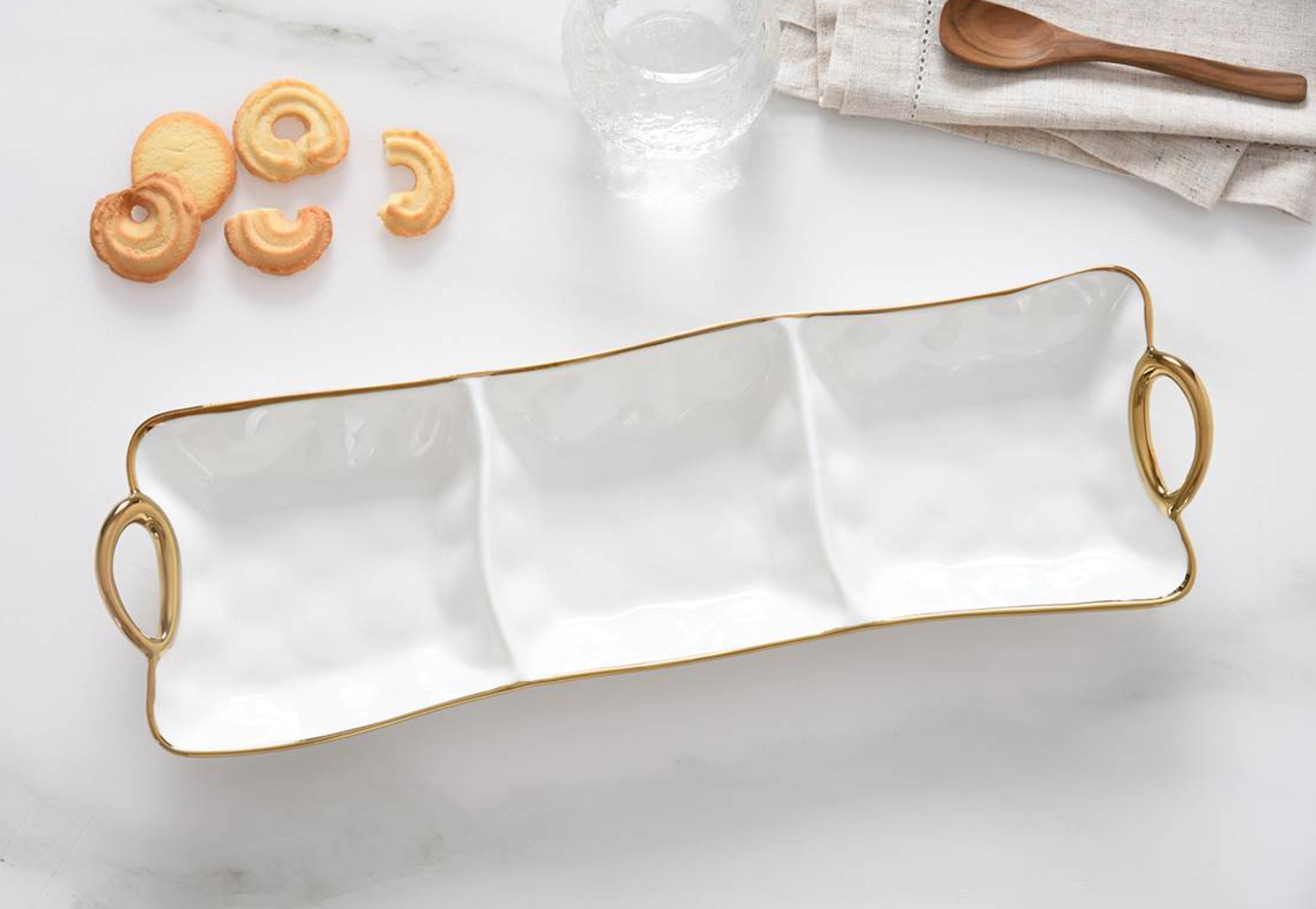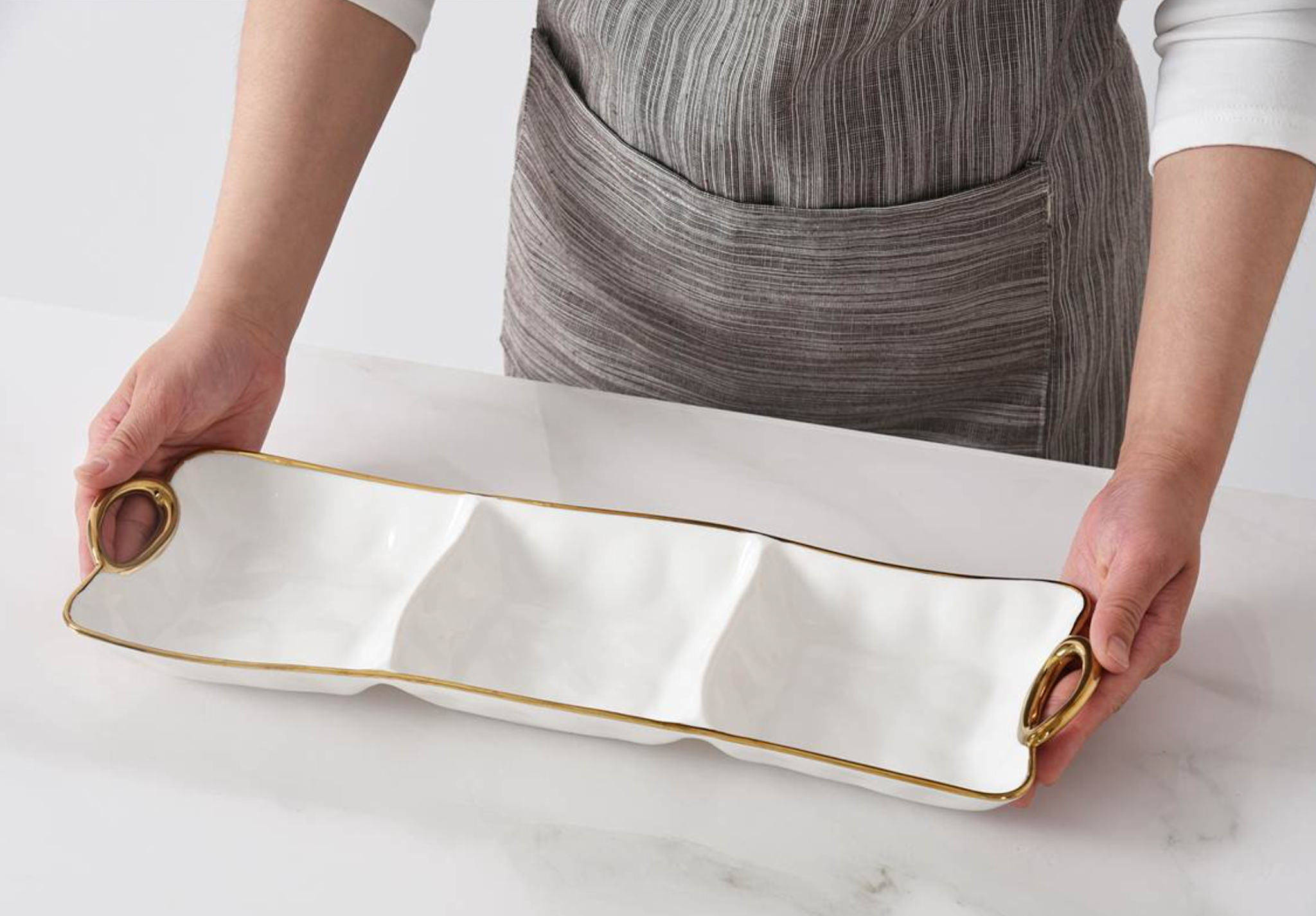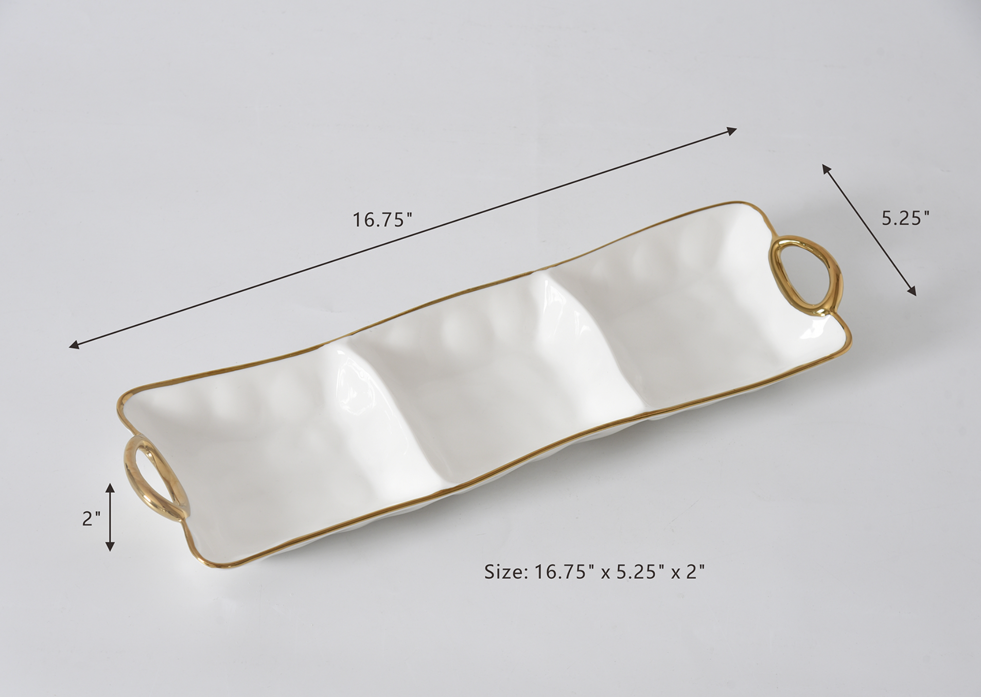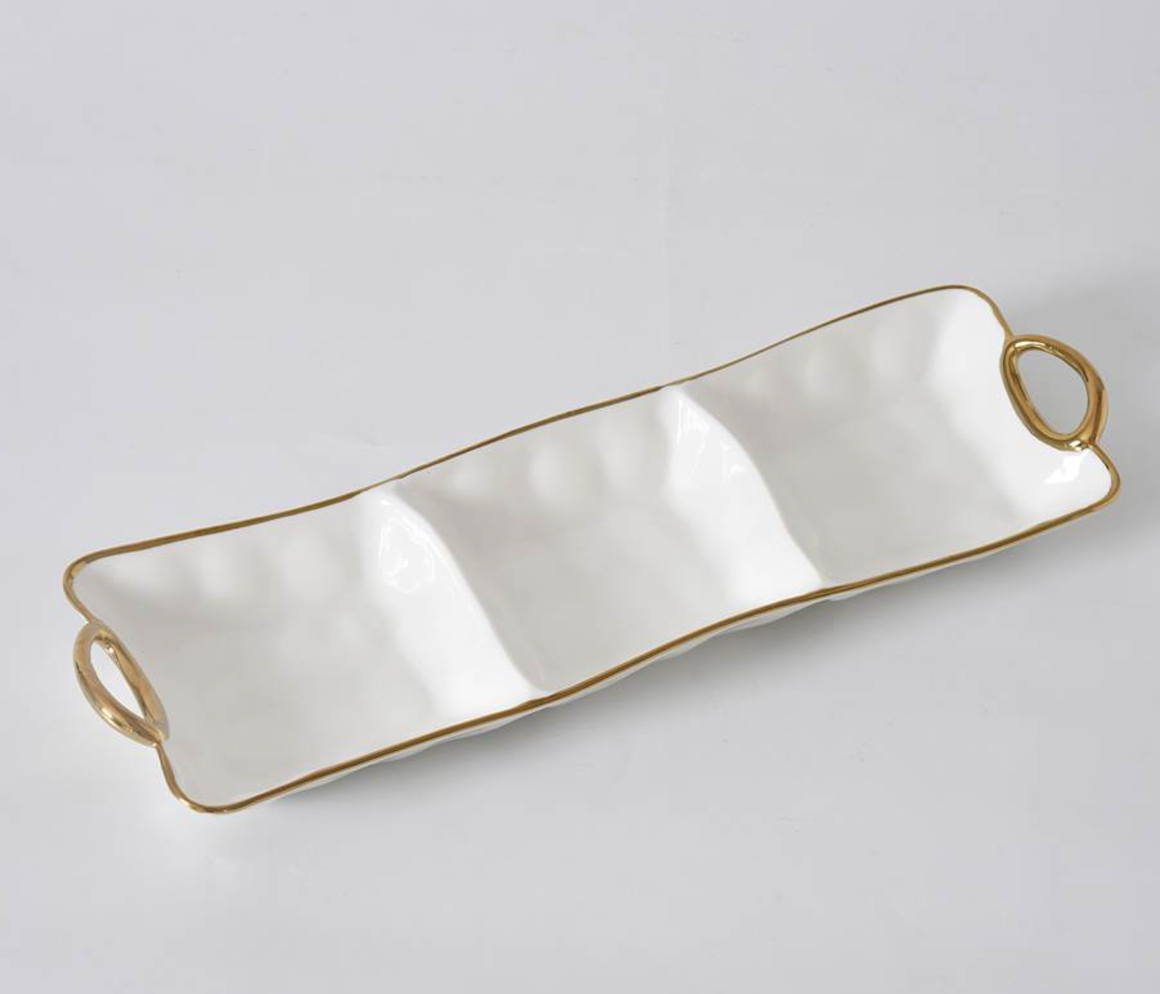 3 Section Server from Golden Handles. Get creative! This piece is great for serving different combinations of snacks, dips and vegetables or all your Tex-Mex needs like guacamole, sour cream and pico de gallo. Gleaming white porcelain with smooth and graceful rim and handles in gold. Food safe. Dishwasher safe. Oven safe to 500°F. Easy Care.