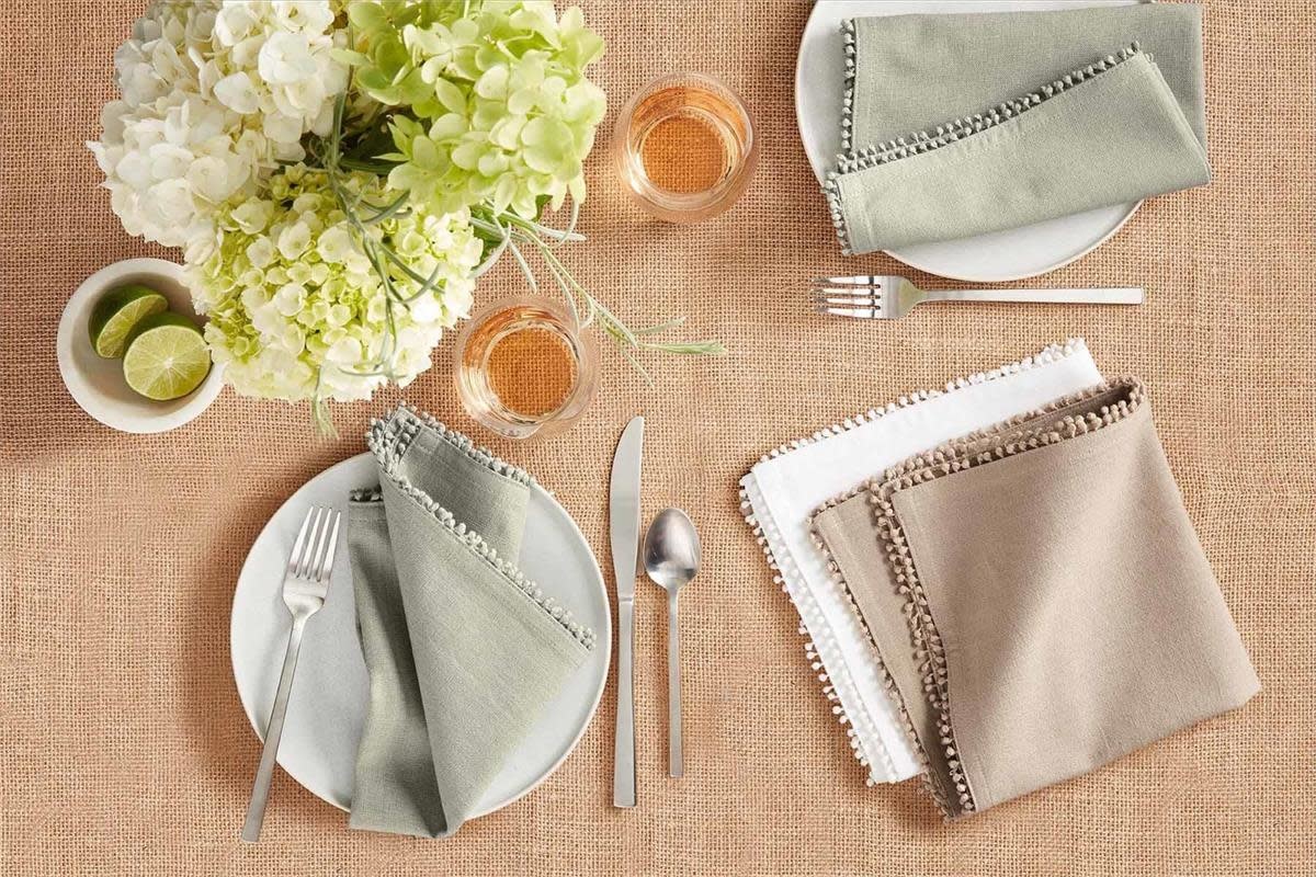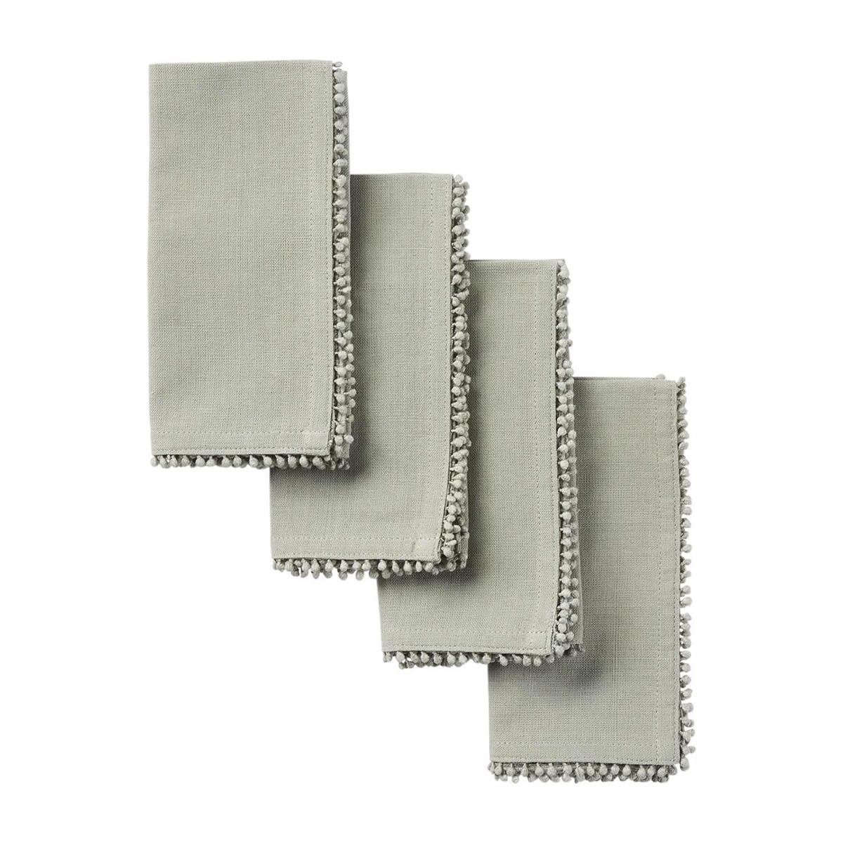 Set of four cotton dinner napkins with delicate pom trim.