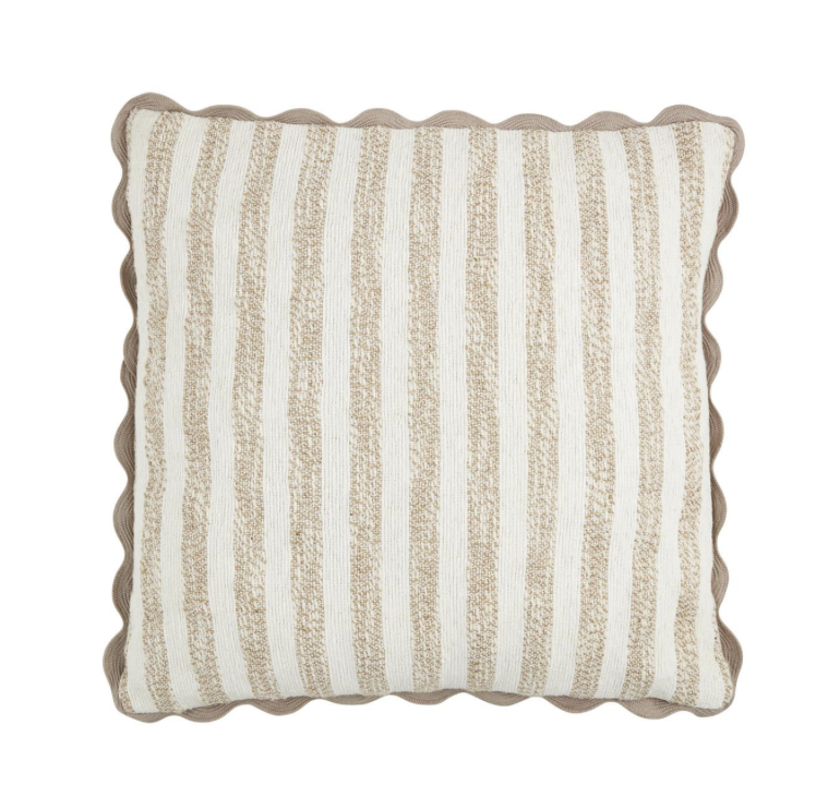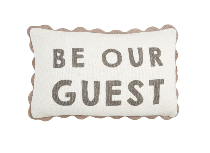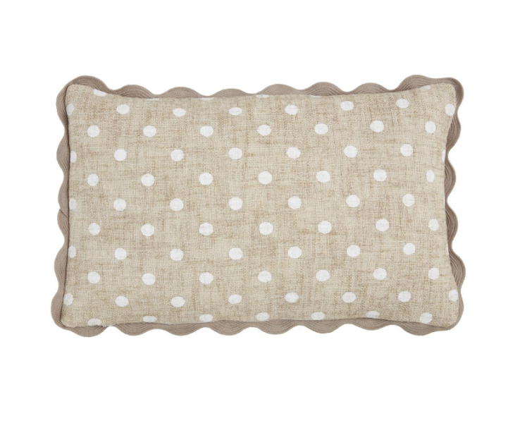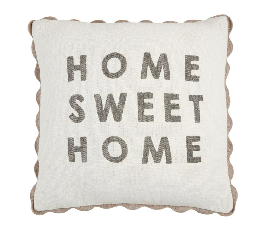 Cotton sentiment pillow with ric-rac trim. Reverse side features polka dot or stripe pattern.