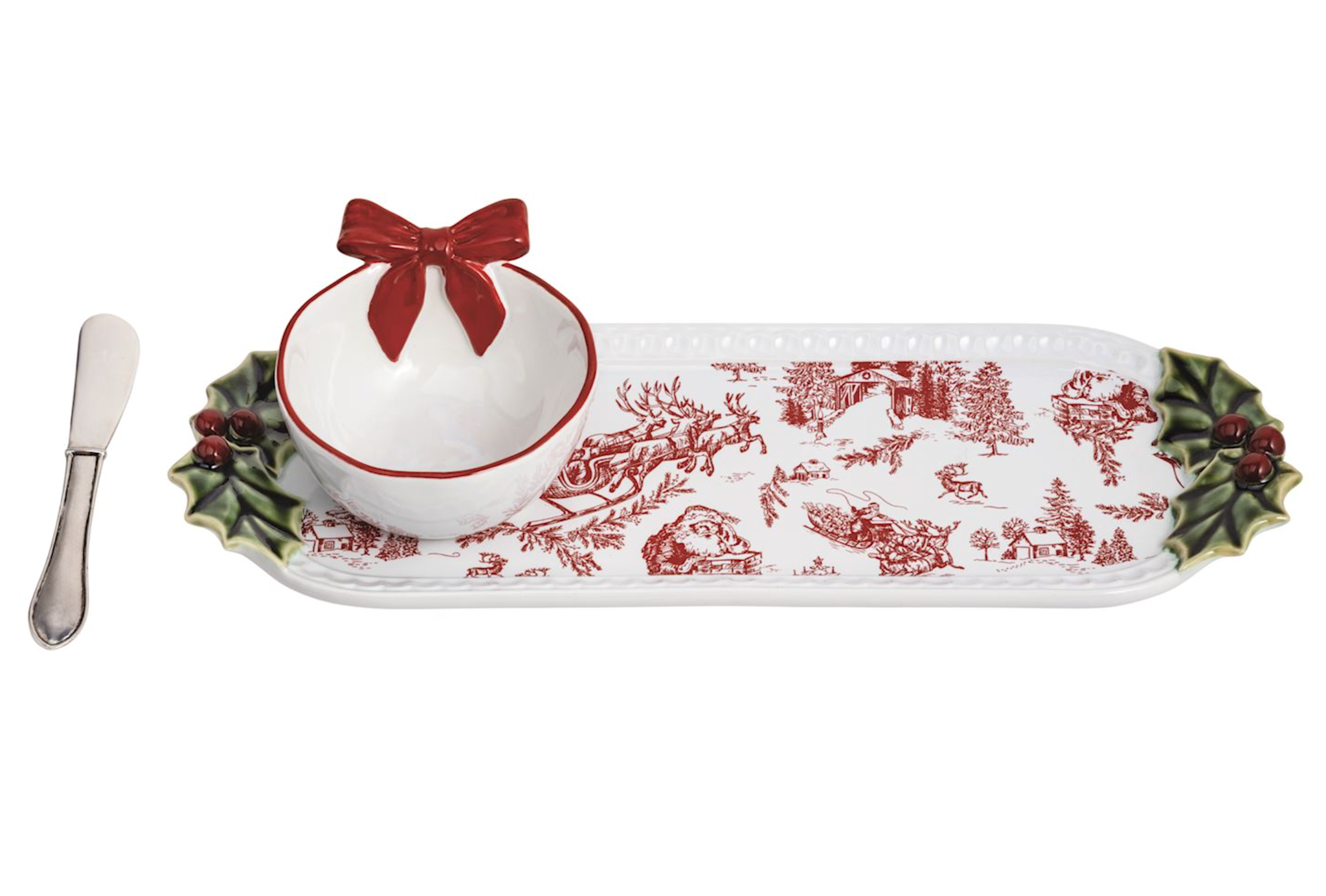 3-piece set. Stoneware tray features hand-painted holly side handles. Comes with stoneware bow bowl and silverplate spreader.