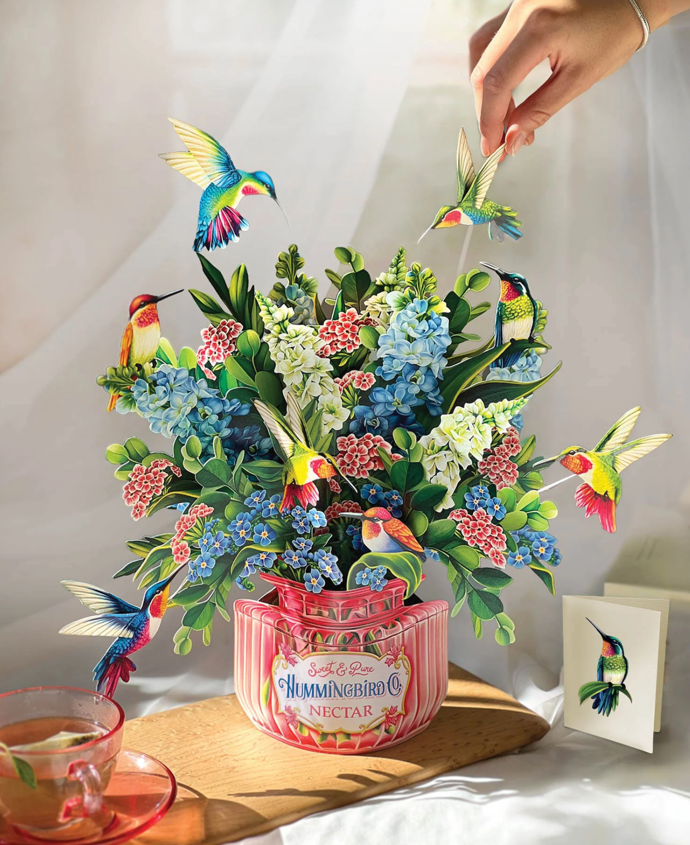 Buzzing with joy, six sky-bound hummingbirds flutter gracefully in vivid hues, brought to life by FreshCut Paper’s innovative wire design, which creates a stunning hovering effect.