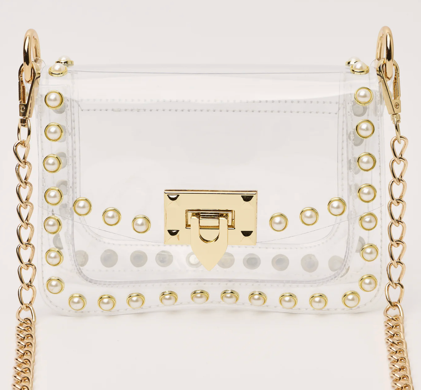 Score with the biggest winner in the clear handbag playbook - The Jackie! The Jackie changed the handbag game by proving clear handbags could be both functional and chic. This style includes pearl metal studs and a gold chain. The Jackie is NCAA and NFL compliant and the ideal size to hold your wallet, phone, keys, lip gloss and a few other small items.