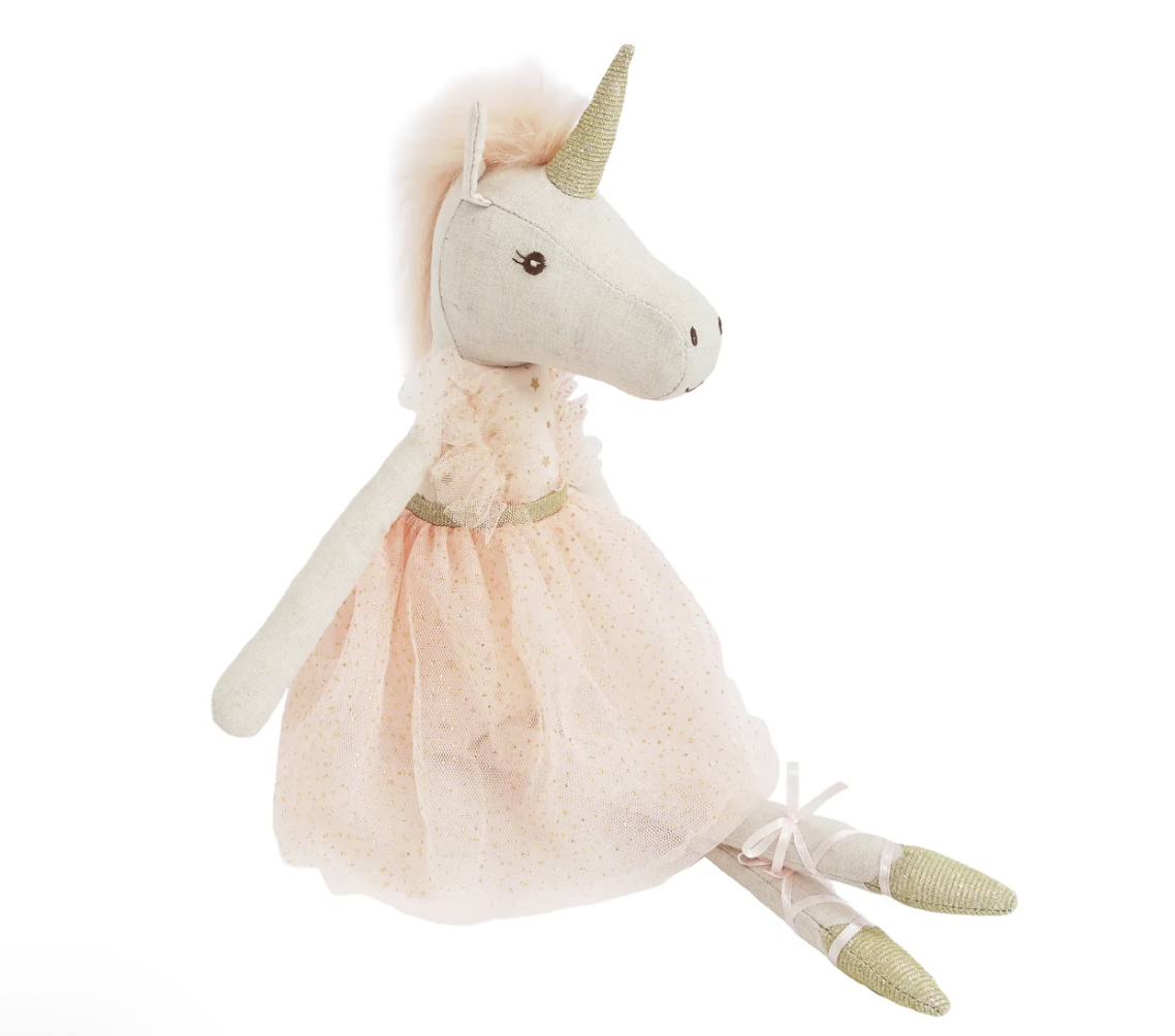 She’s a magical unicorn AND a prima ballerina. The Jolie Unicorn Ballerina Doll will instantly pirouette into a child’s heart with her ethereal pale pink dress and golden slippers. Plush and cuddle-perfect, this unicorn doll boasts an enchanted horn and lustrous mane that bring a fairy tale vibe to any room. Any little dancer will love this charming twist on the typical ballerina doll who twirls from playtime to naptime. Ideal for a birthday, holiday or just because gift, our Unicorn Ballerina Doll is sure to sweeten any occasion.