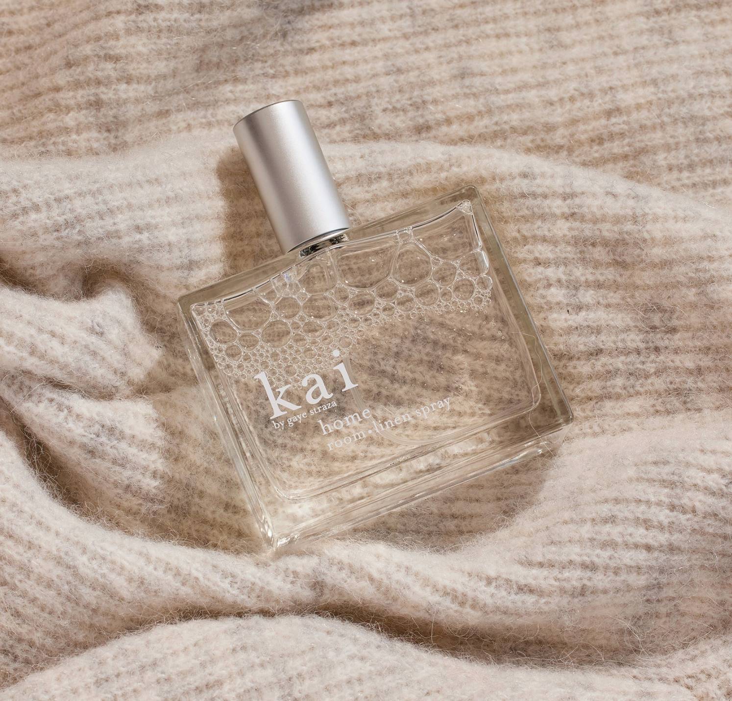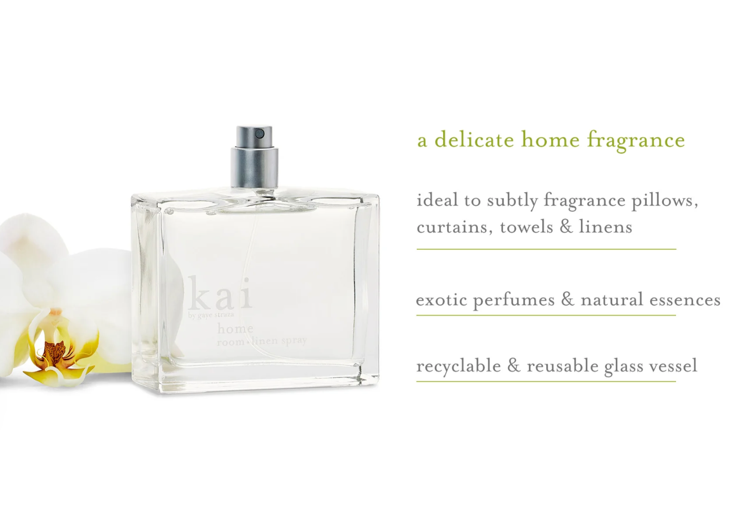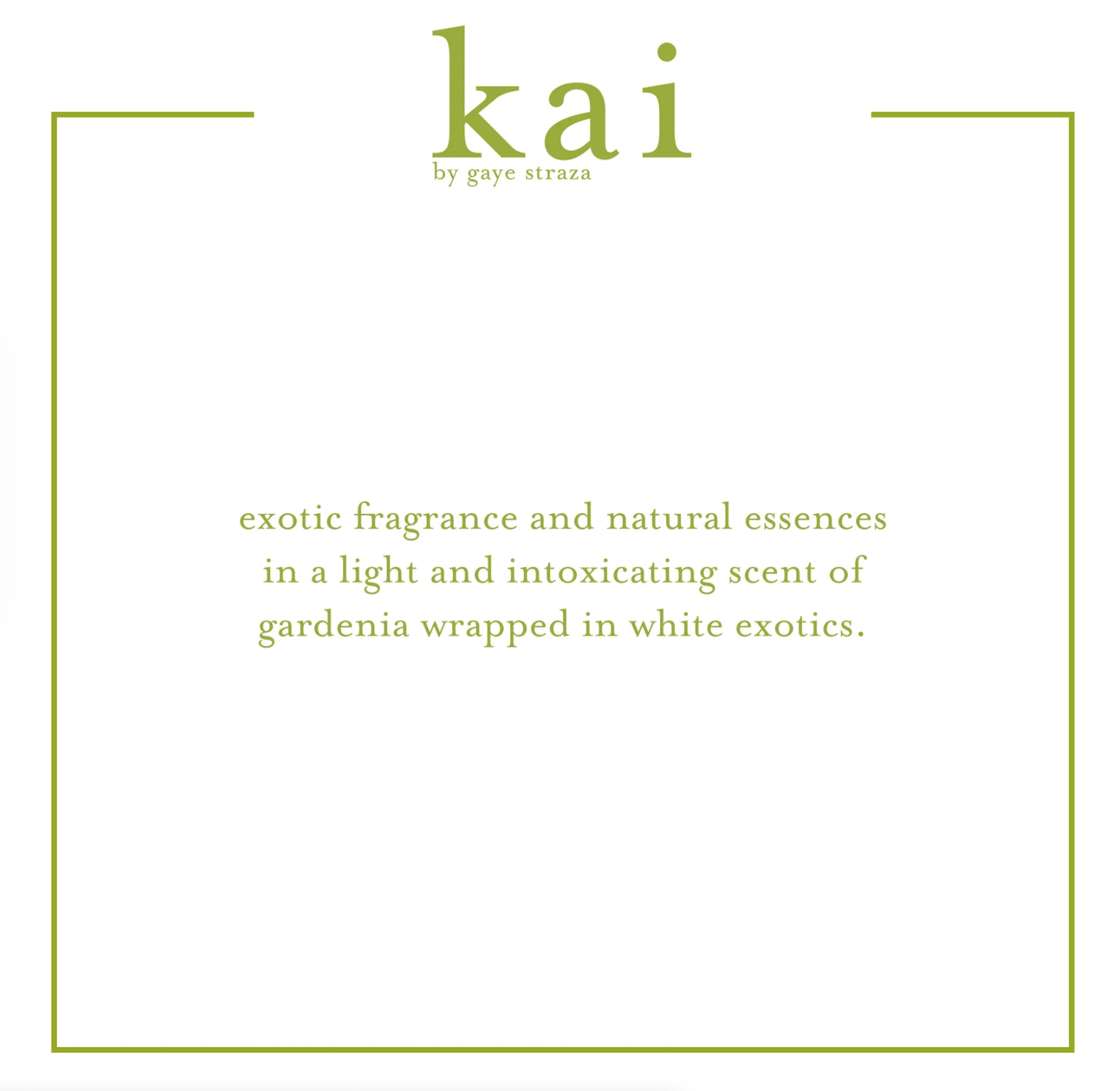 the exotic scent of kai delicately blended into a home fragrance. fills your surroundings with kai's light and intoxicating blend of gardenia wrapped in white exotics. use in any room or spray your sheets at bedtime for sweet dreams.
