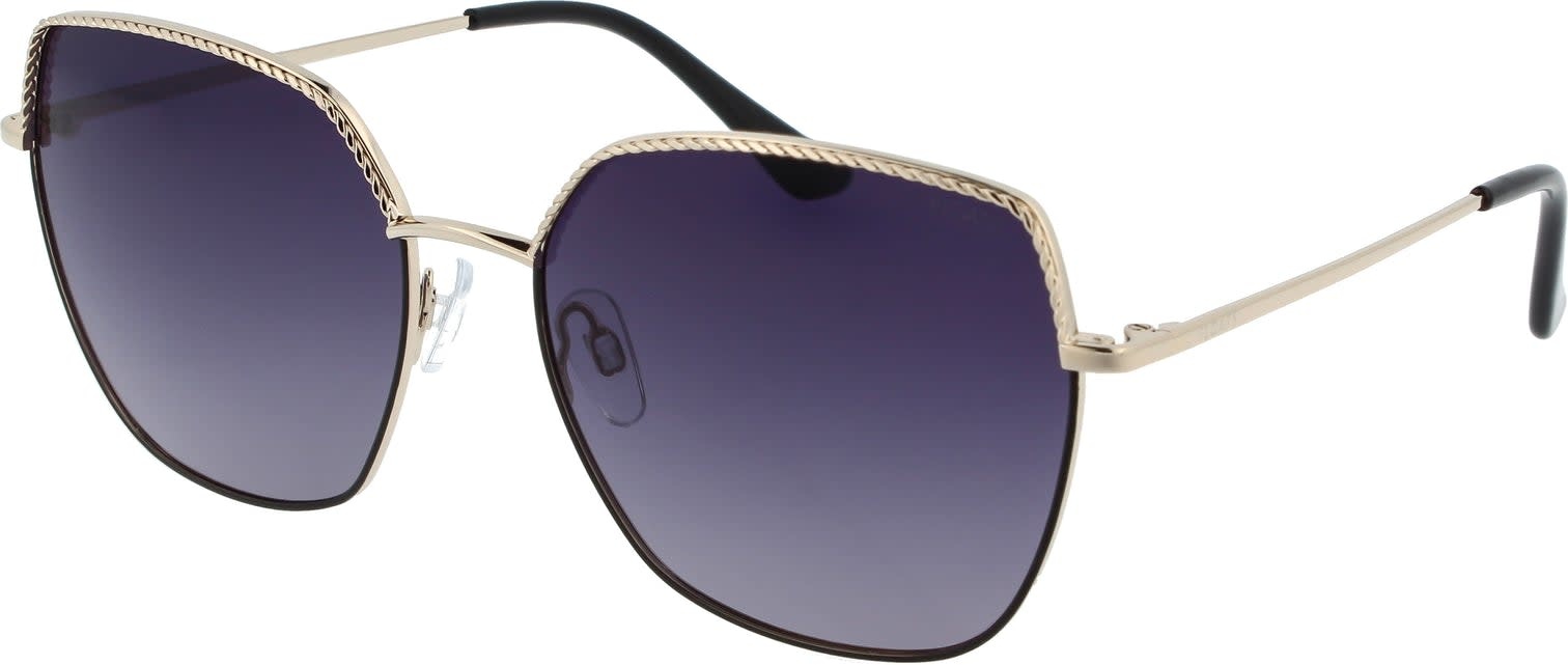 Semi-round cat-eyed frame, with colored lens and adjustable nose-pads and polarized lens.