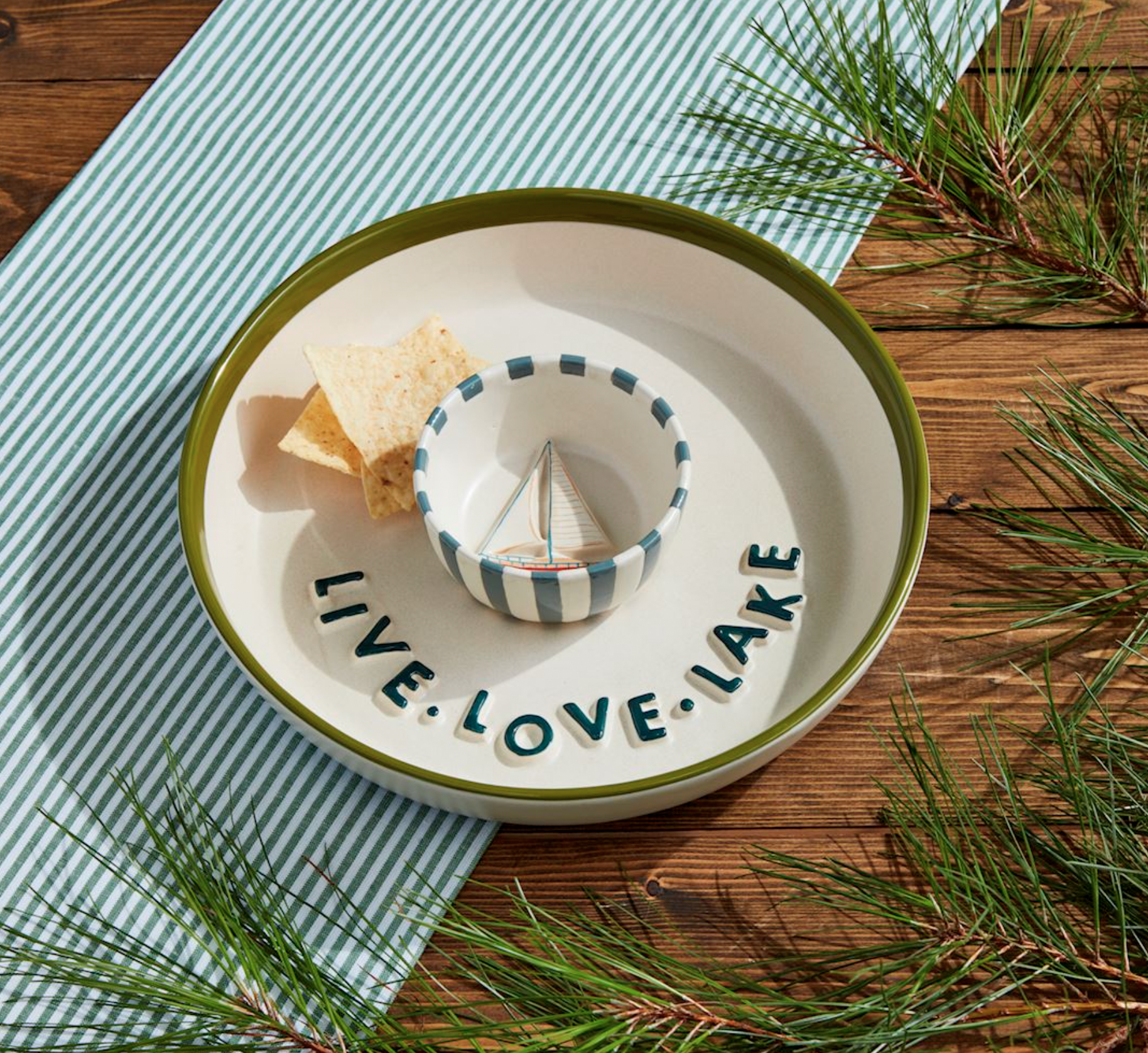 Hand-painted stoneware chip server with attached center dip bowl features chunky textural detail.