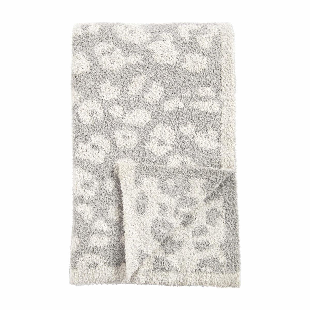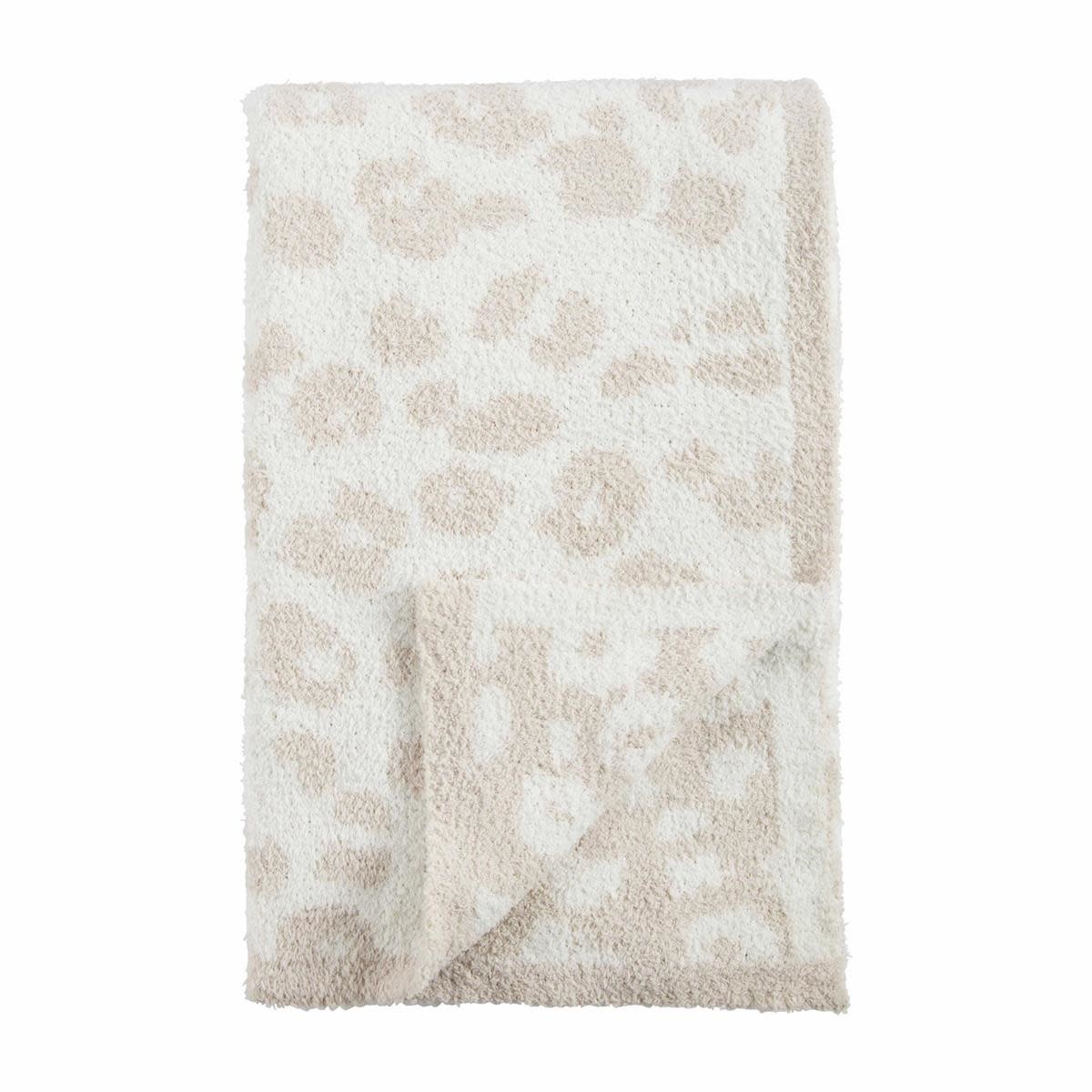 Reversible chenille knit blanket features jacquard leopard pattern and contrast border.