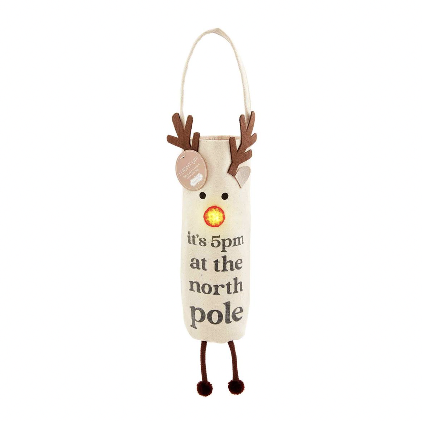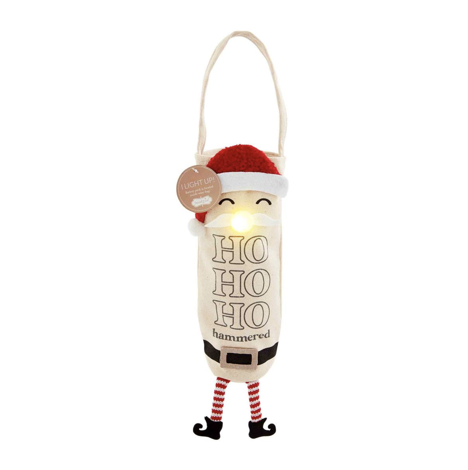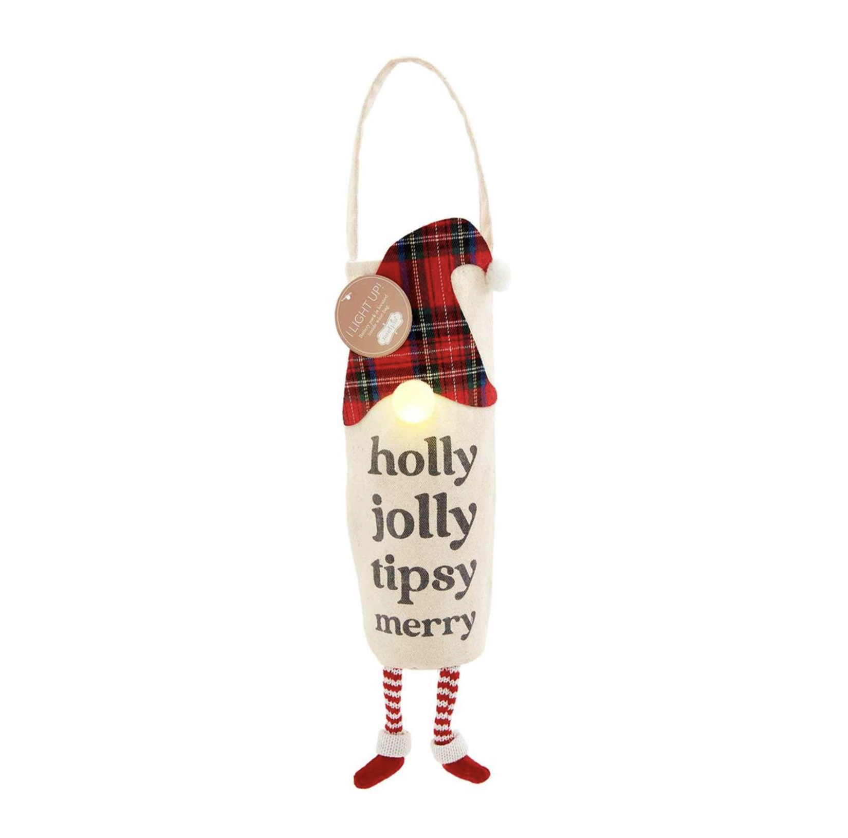 Embellished canvas wine bag with LED light-up facial features and dangle legs. Batteries included