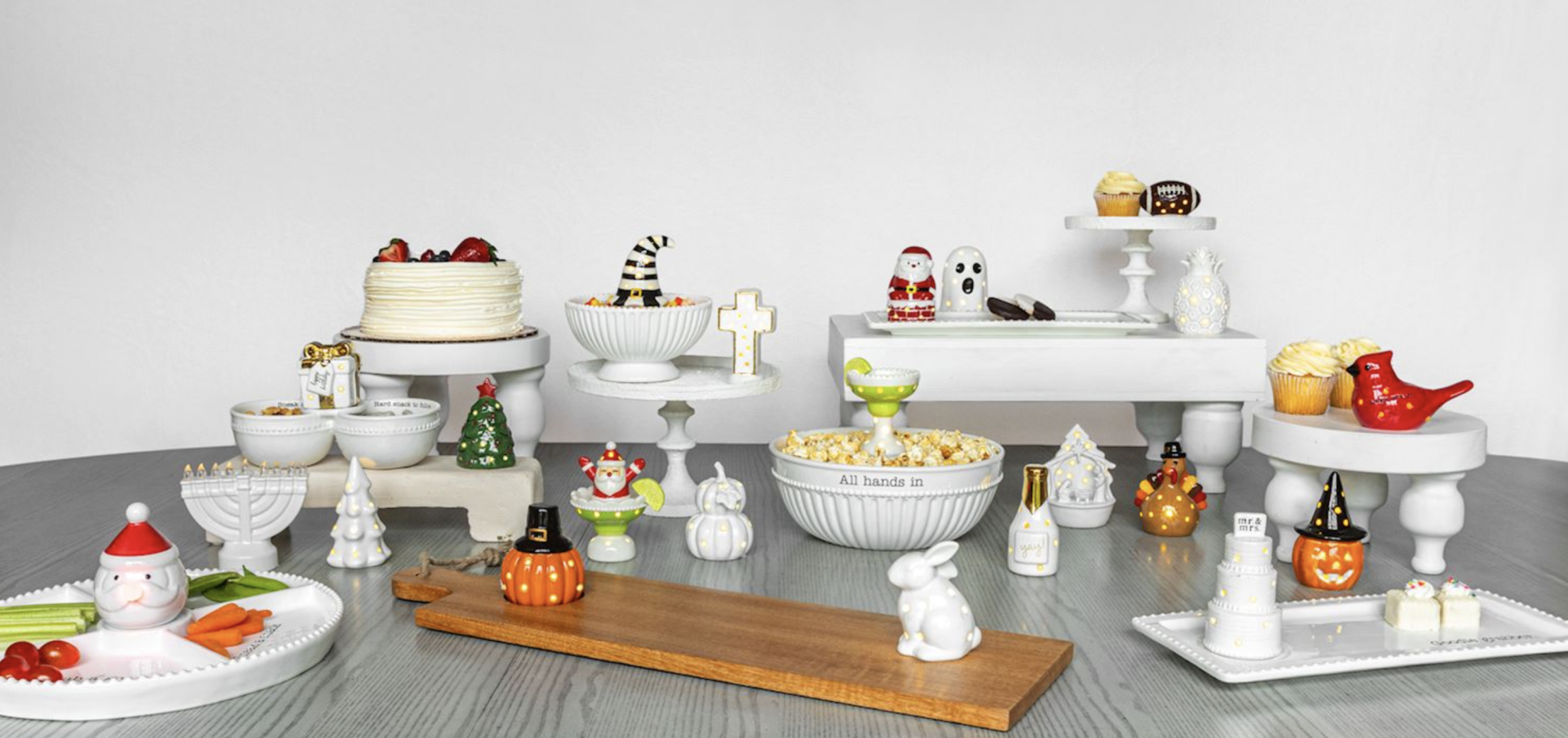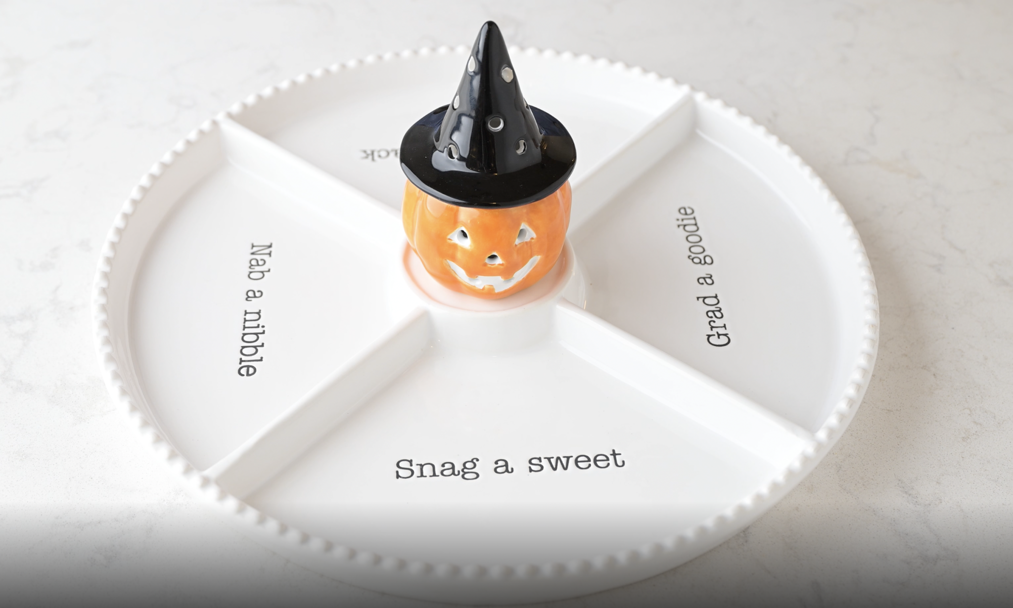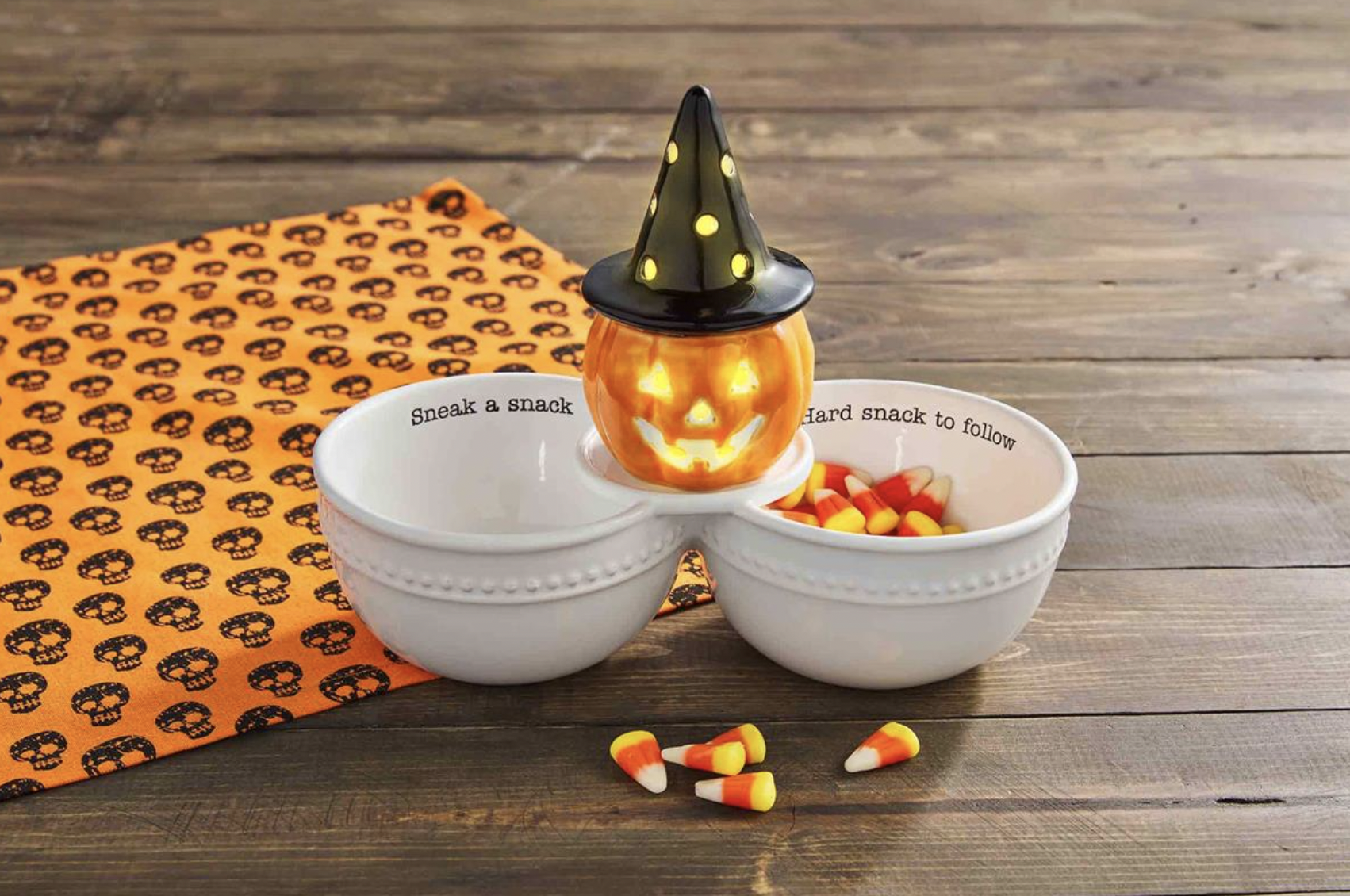 Cut-out ceramic sitter features LED interior lights. Batteries included. SNACK TRAY SOLD SEPARATELY