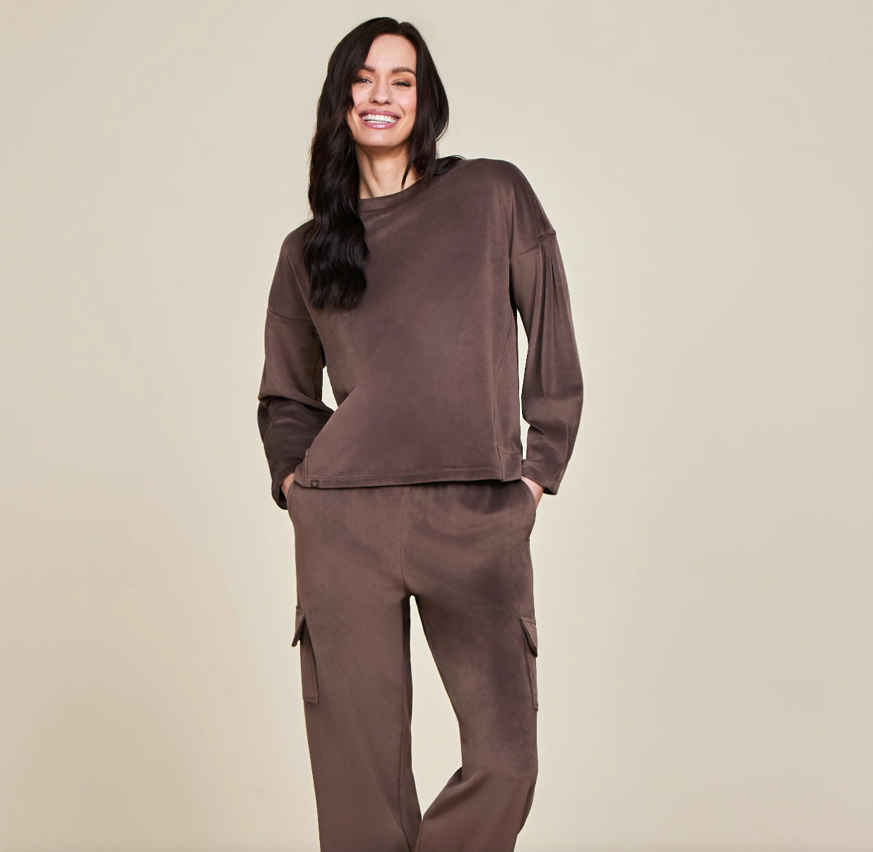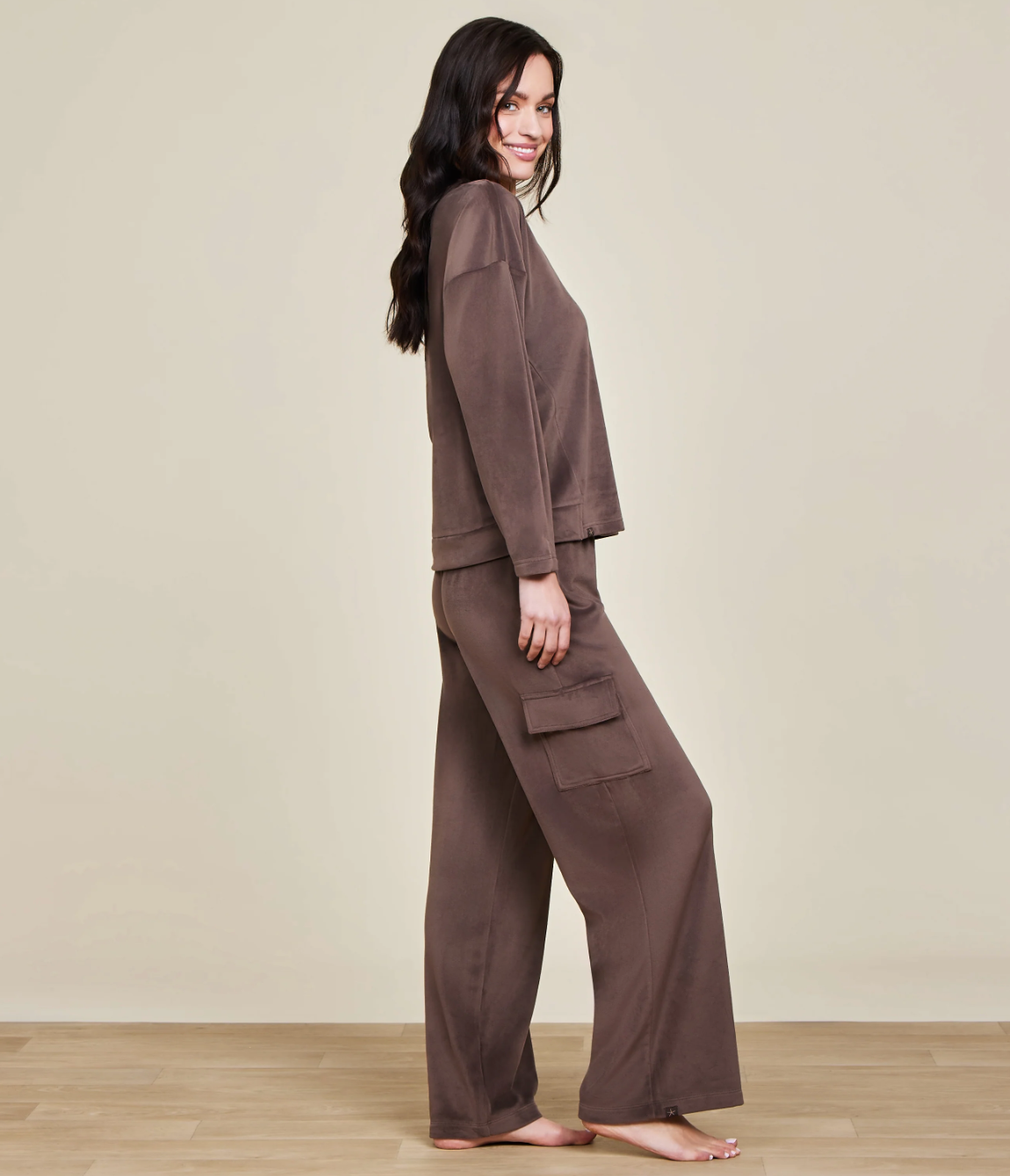 Designed for a modern look, the Barefoot Dreams LuxeChic® Tucked Sweatshirt offers a dropped shoulder pullover style with a wider crew neck fit for ultimate comfort. The forward side seams and tuck detail on the sleeves add a touch of sophistication. Pair it with the LuxeChic® Cargo Pant to complete the set.