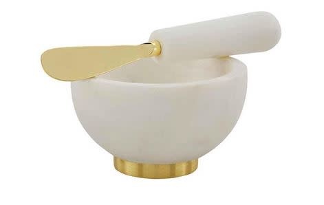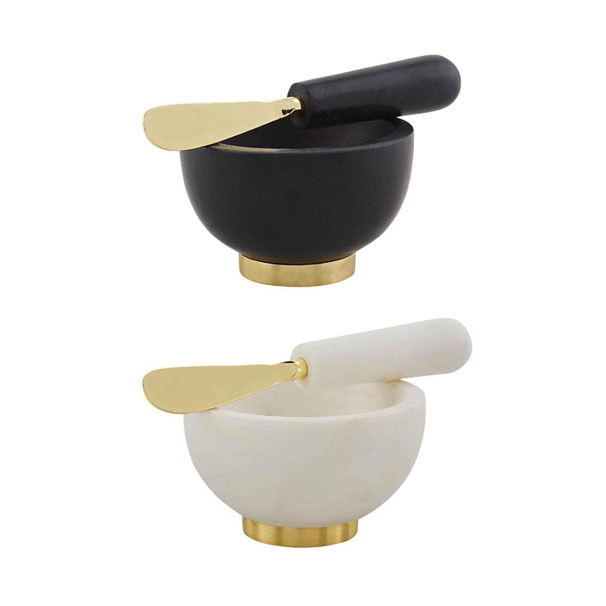 2-piece set. Marble bowl features brass finished stainless steel pedestal. Comes with coordinating spreader.