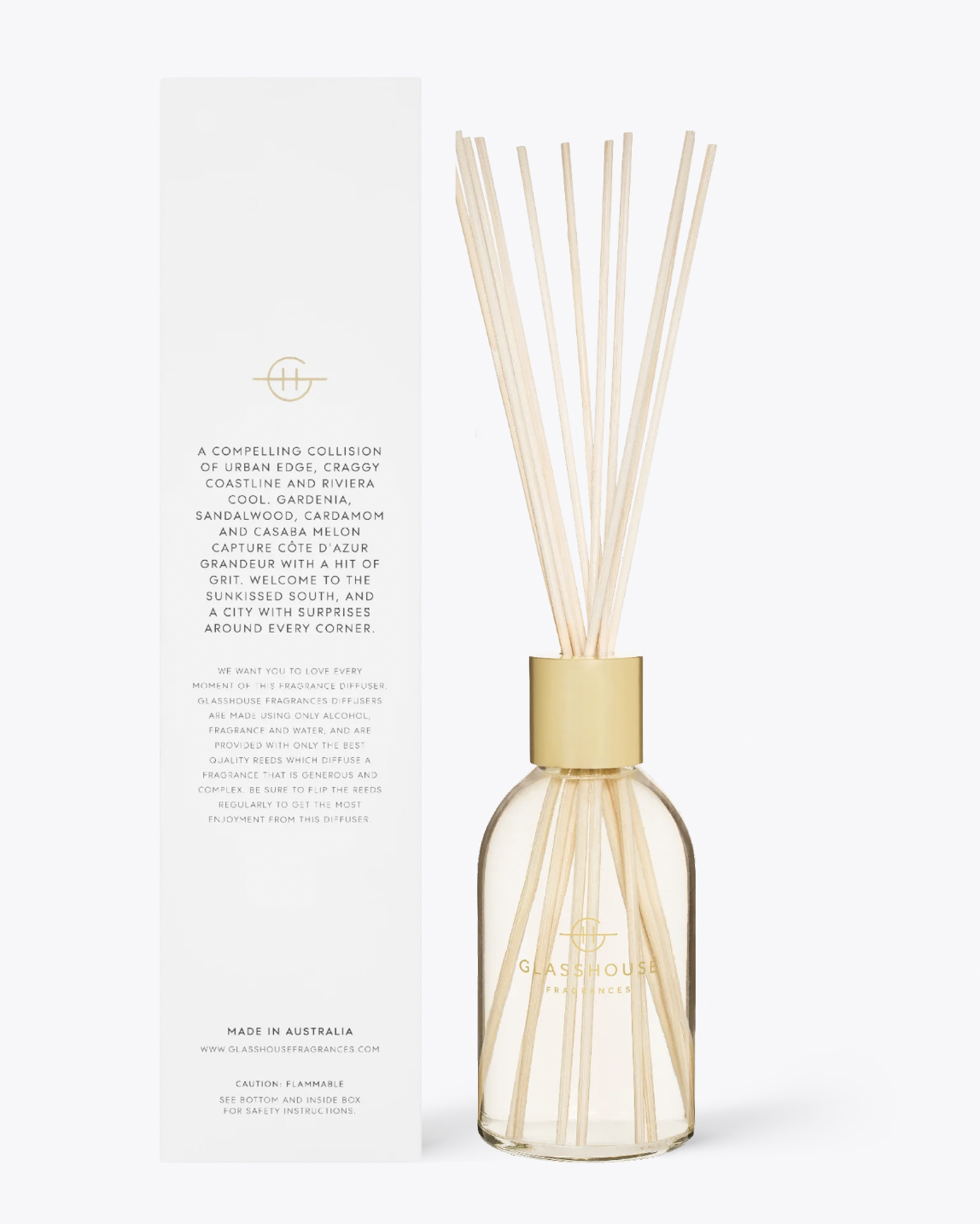 Made using only alcohol, fragrance and water and are provided with only the best quality reeds which diffuse a fragrance that is generous and complex. Made in Australia.