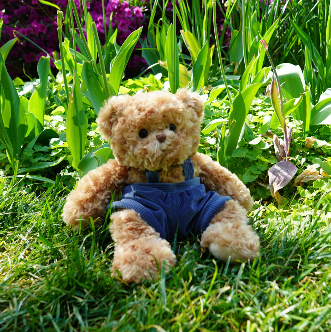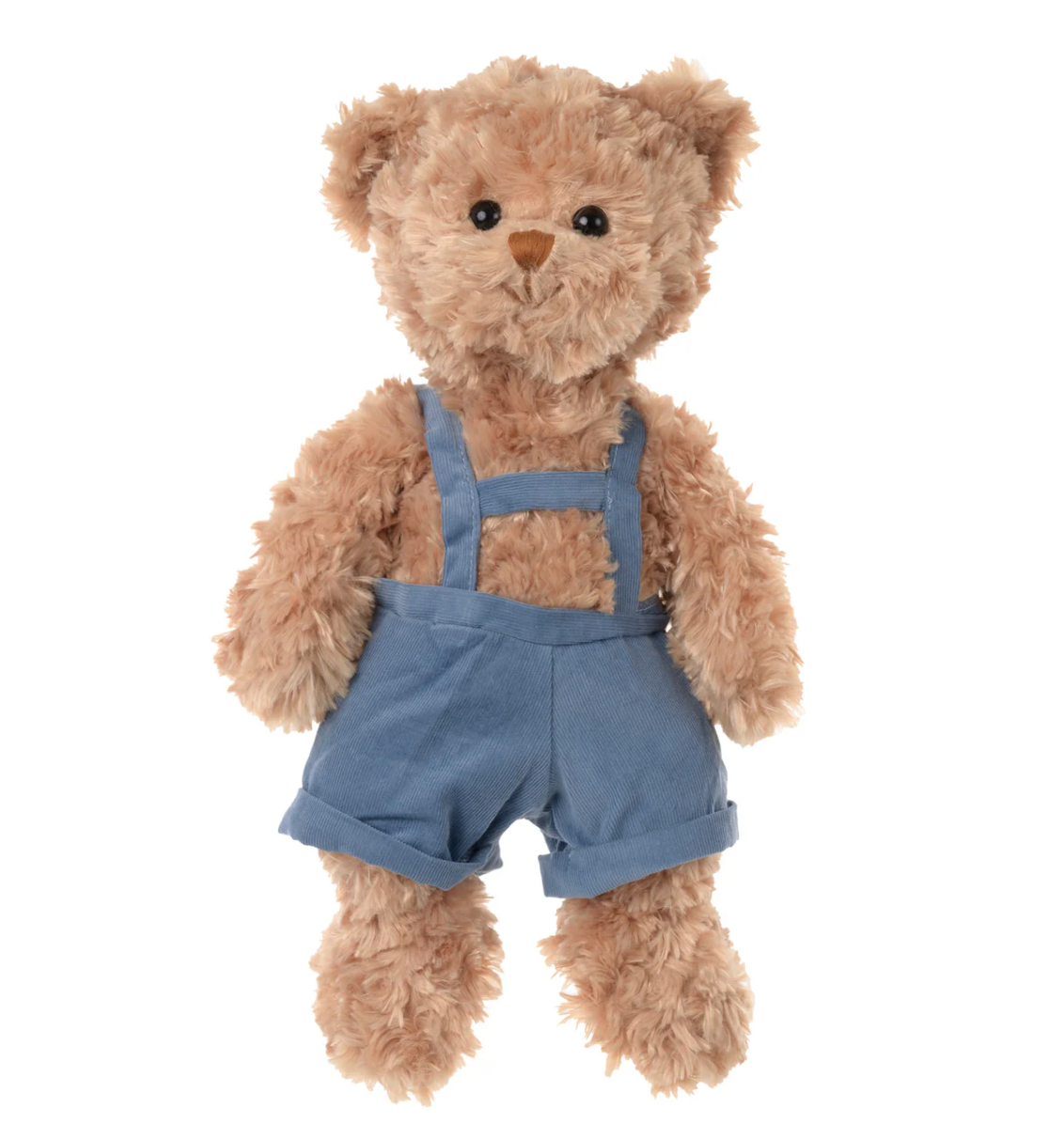 Meet Mavi! His cute ribbed corduroy overalls in denim blue and traditional teddy fur material make him one of our most popular teddy bears. Summer is his favorite season and he loves sunny adventures. His huggable shape and size makes a great gift for any age.