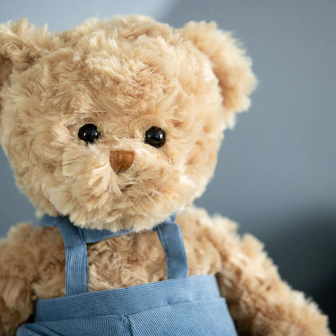 Meet Mavi! His cute ribbed corduroy overalls in denim blue and traditional teddy fur material make him one of our most popular teddy bears.