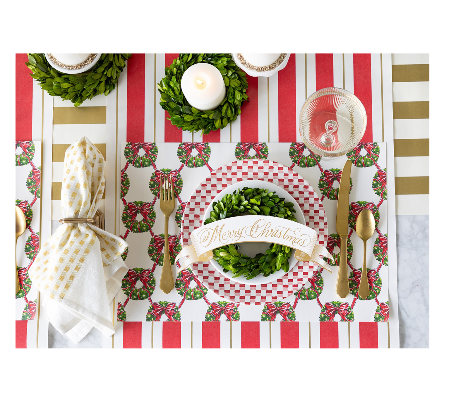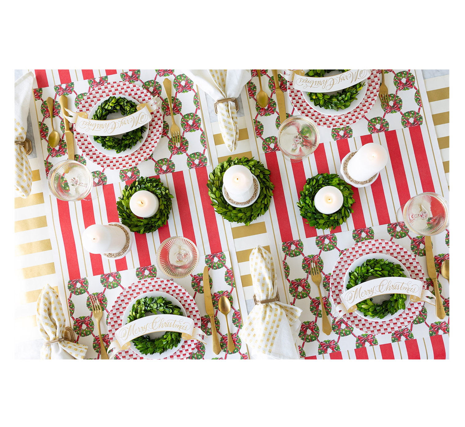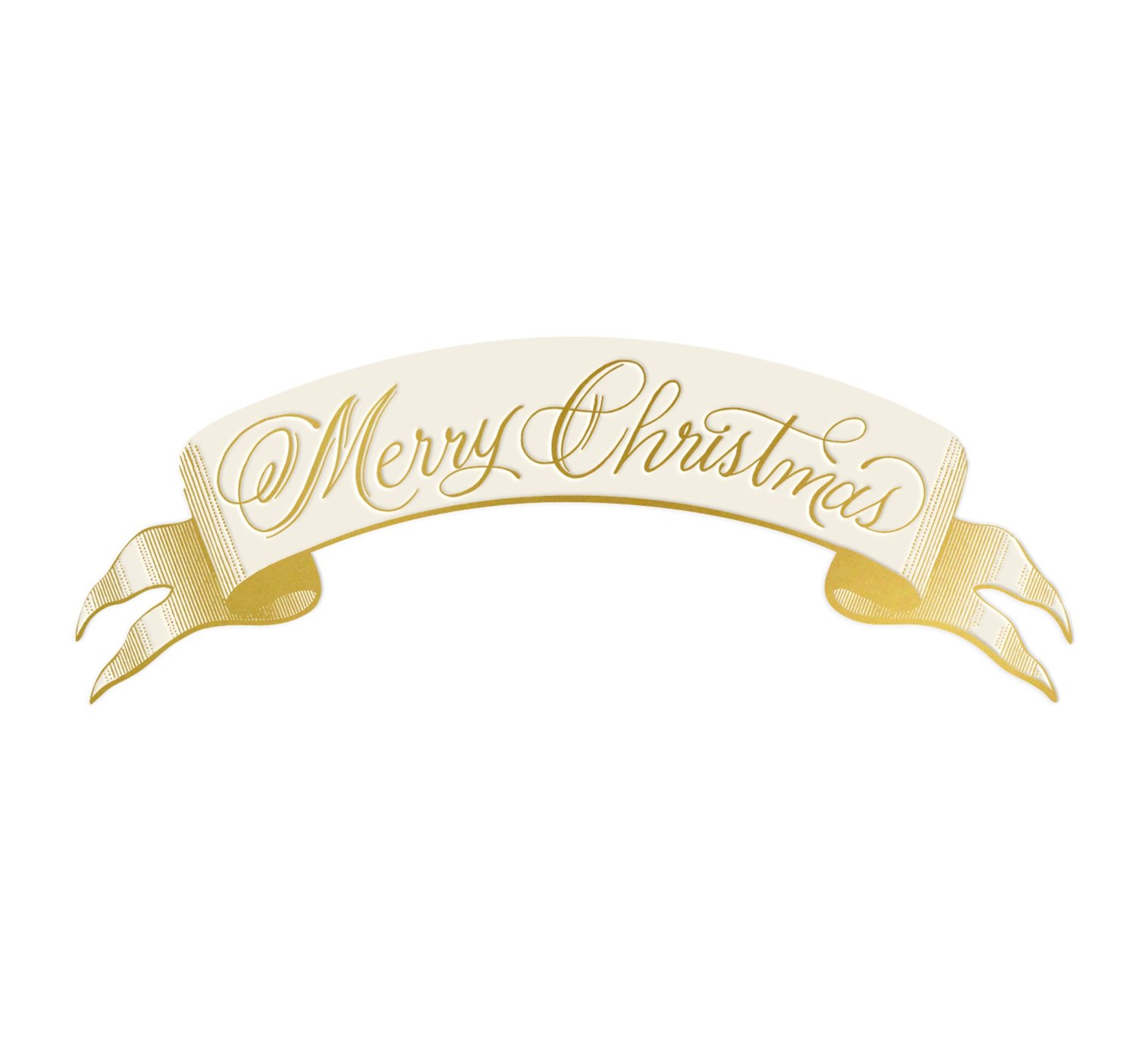 The Merry Christmas Banner Table Accent greets your holiday guests with a warm message. In shiny gold foil, this banner is a thoughtful finishing touch to seasonal table settings and pairs with so many of the Hester & Cook® festive stories.