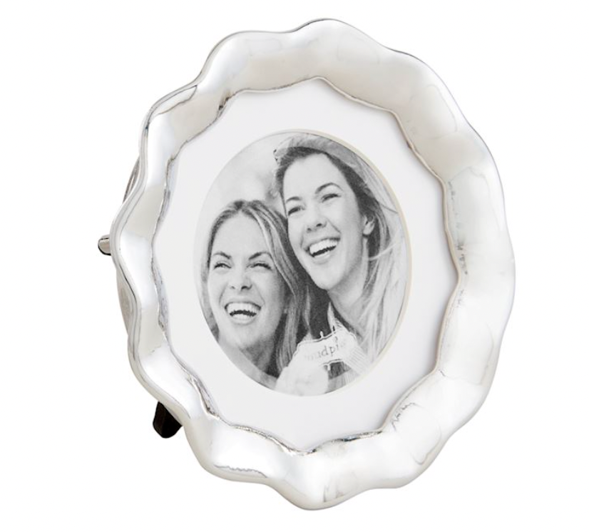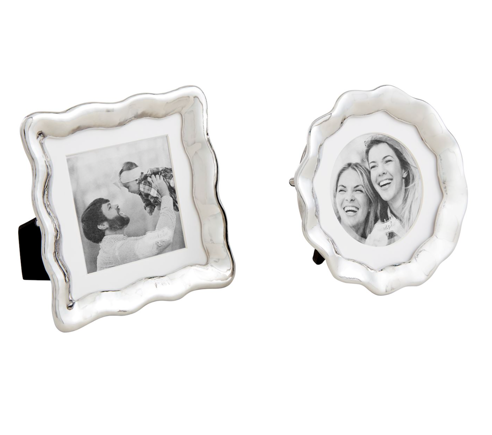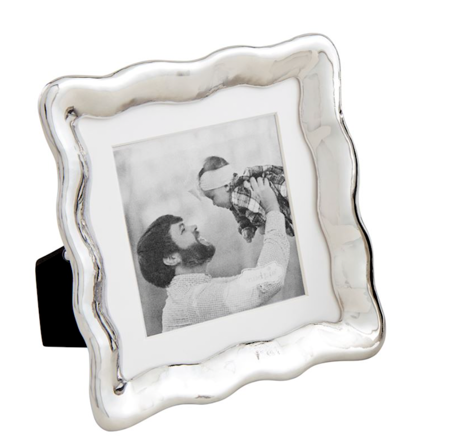 Wavy edge cast aluminum 3" x 3" frame with matting. Easel back.