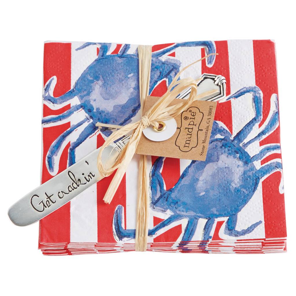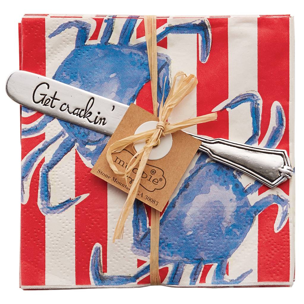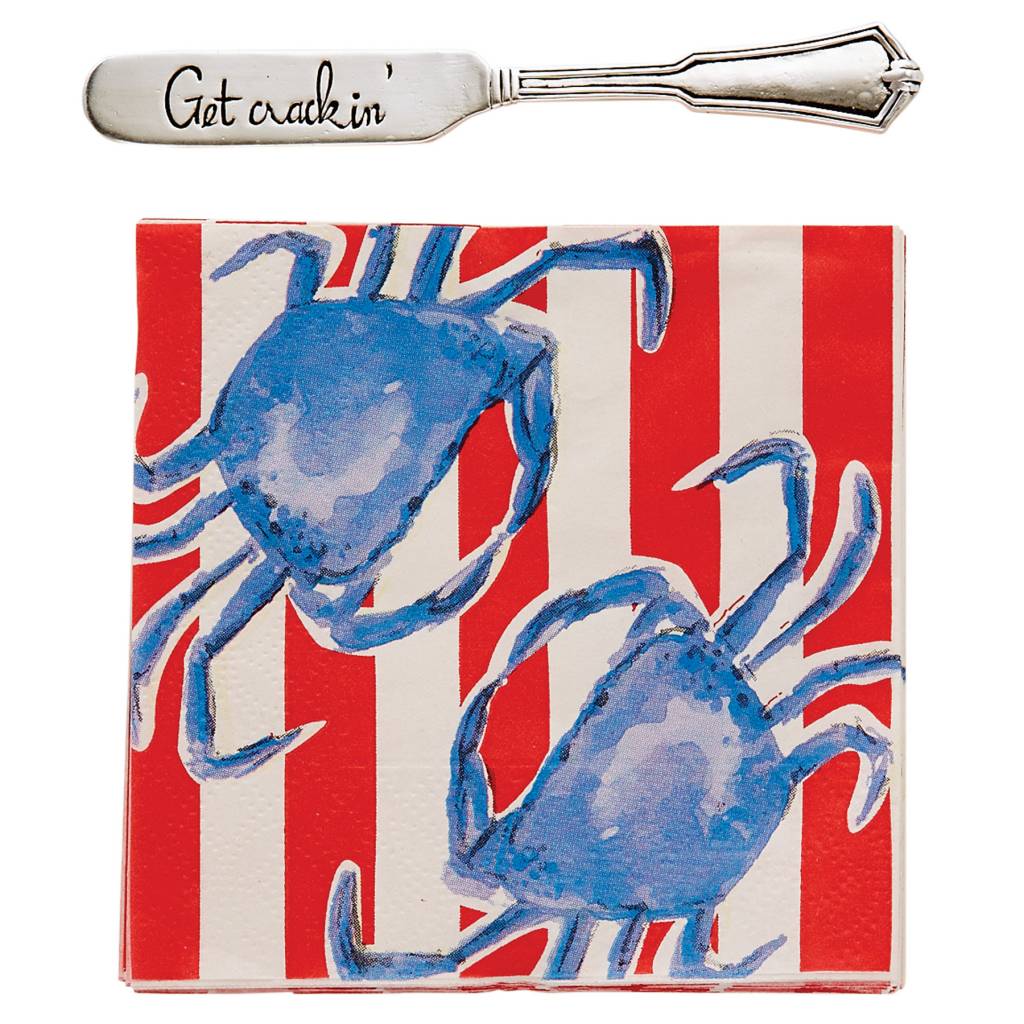 2-PIECE SET. 1 pack of 12 printed paper cocktail napkins arrive tied with stamped "Get crackin'" spreader.