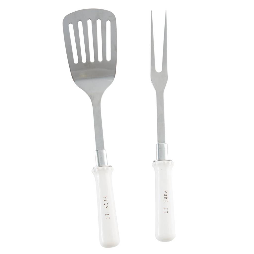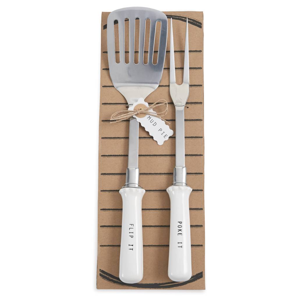 2-PIECE SET. STAINLESS STEEL SPATULA AND FORK GRILLING SET FEATURES CERAMIC HANDLES WITH RESIST "FLIP IT" AND "POKE IT" SENTIMENTS. UTENSILS ARRIVE ON CLEVER "GRILL" DISPLAY CARD.