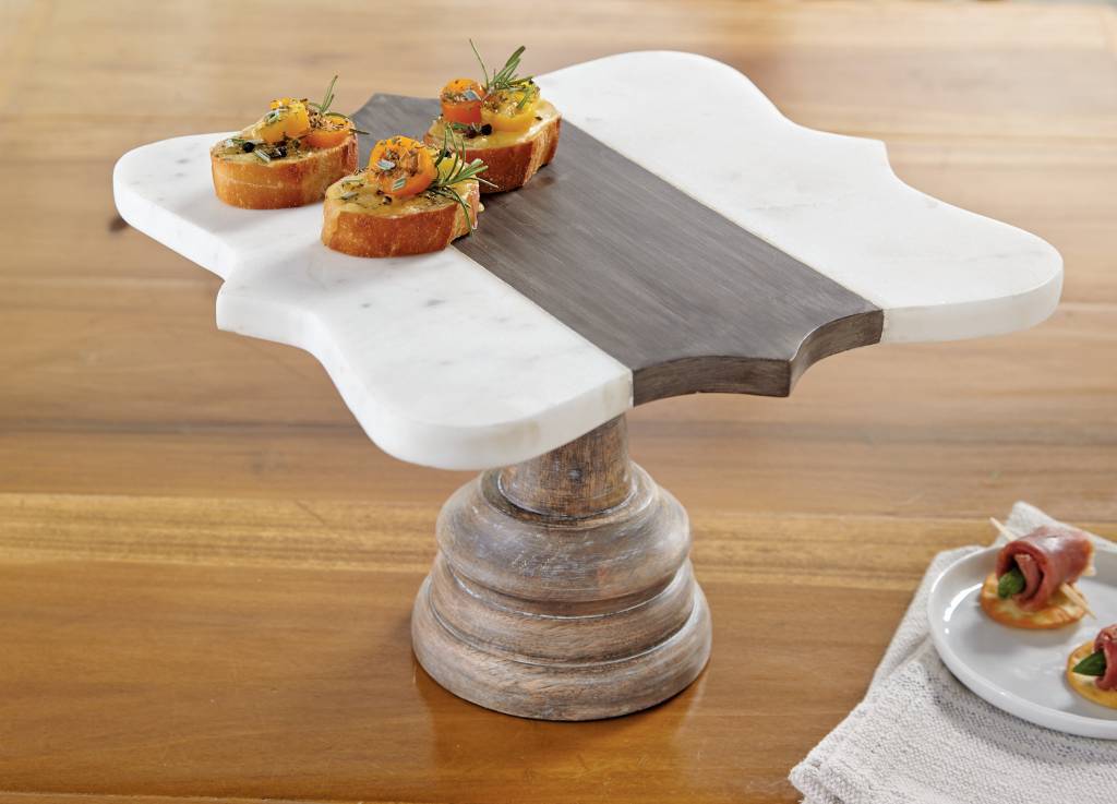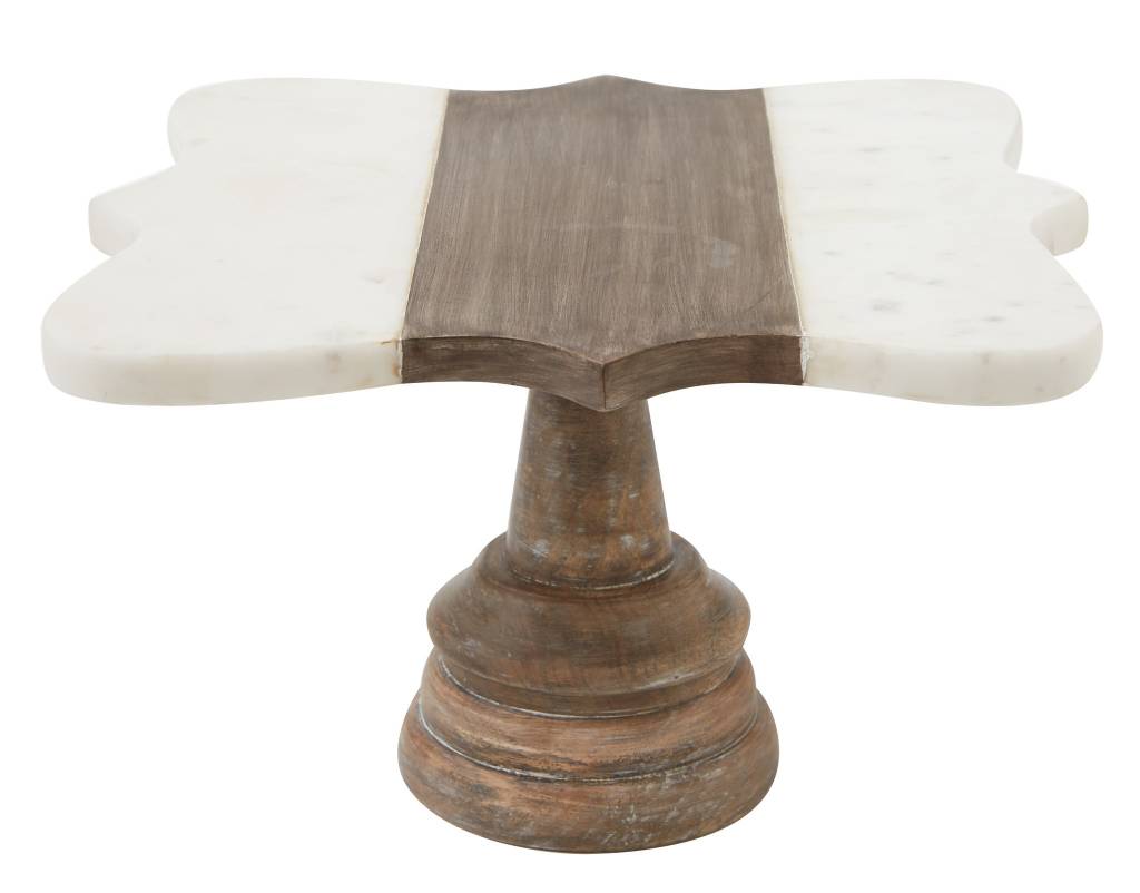Turned mango wood pedestal features white marble and coordinating wood serving surface.