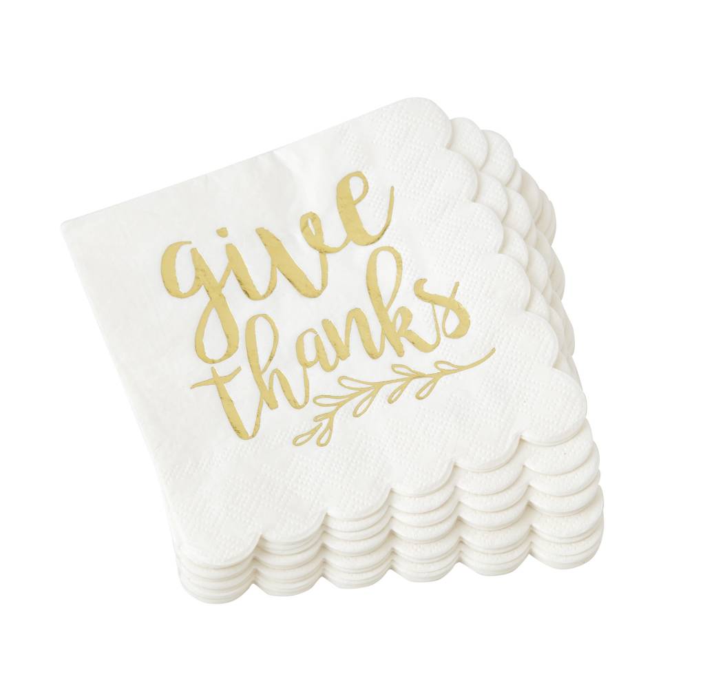 PAPER COCKTAIL NAPKINS FEATURE PRINTED AND GOLD FOILED "GIVE THANKS," "THANKFUL FOR EVERYTHING" OR "GRATEFUL THANKFUL BLESSED" SENTIMENTS AND SCALLOPED EDGE DETAIL. NAPKINS ARE PACKAGED IN SETS OF 20. EACH STYLE SOLD SEPARATELY. 5" SQUARE.