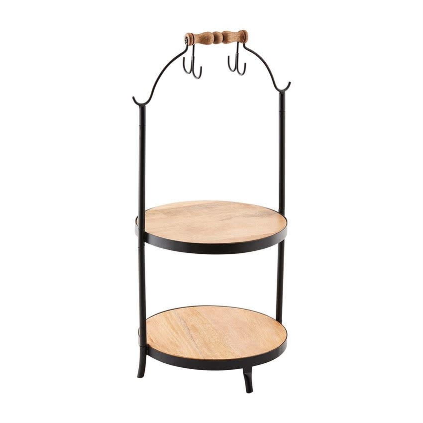Two-tier mango wood and iron stand features hooks to hold mugs or cups.