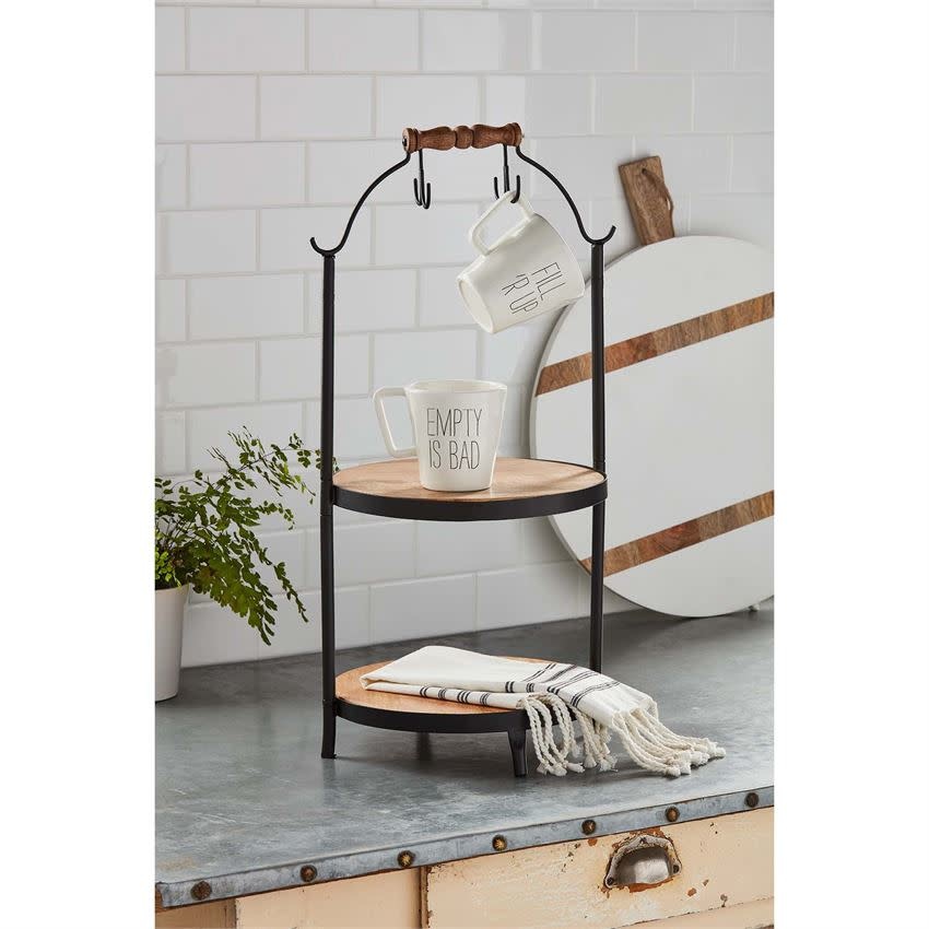 Two-tier mango wood and iron stand features hooks to hold mugs or cups