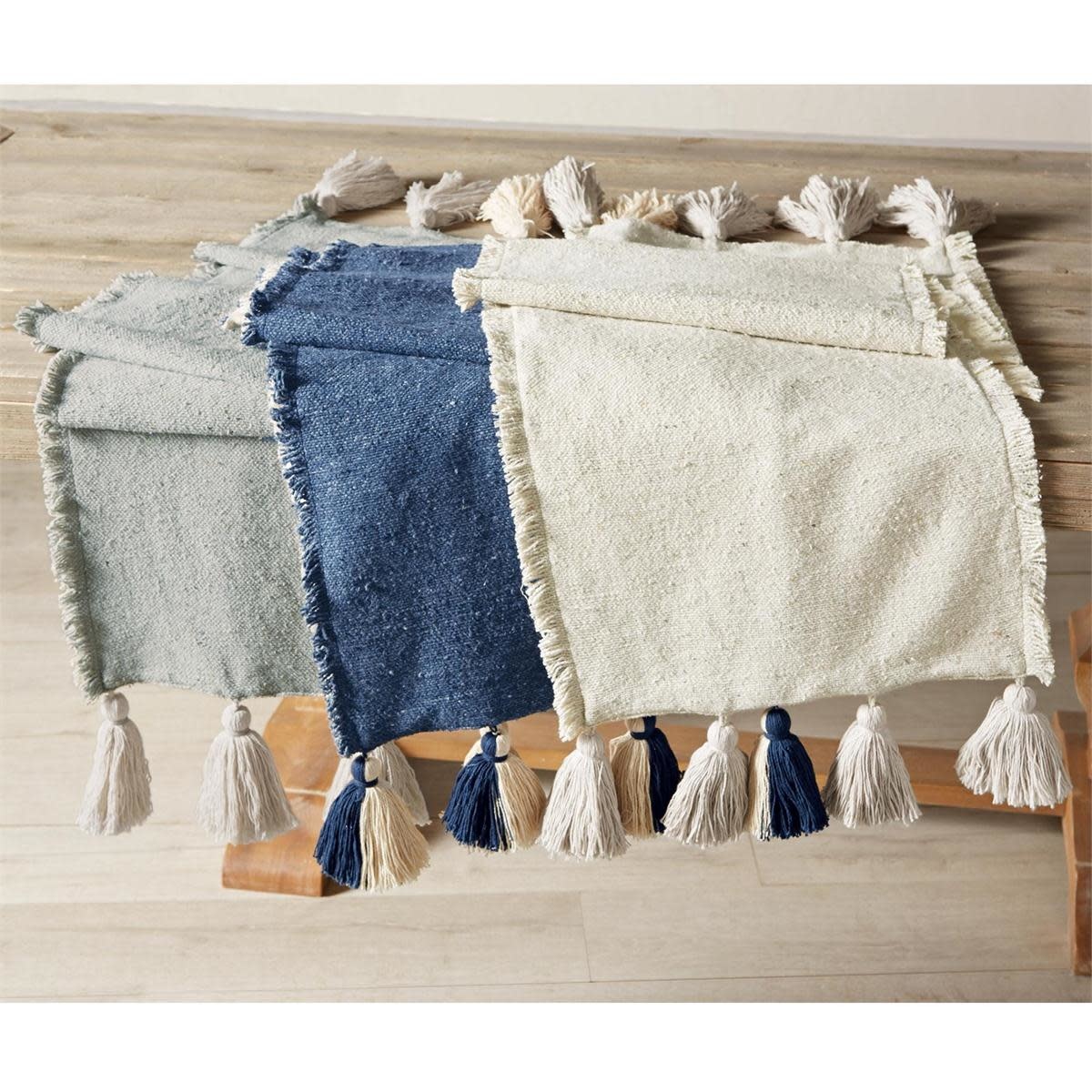 Ponchaa cotton table runner features fringe trim with chunky tassel detail.