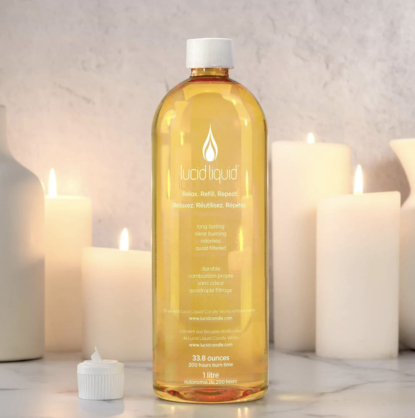 Lucid Liquid is highest grade liquid paraffin, filtered for even greater purity. It burns slow and clean and gives over 200 hours of burn time with Lucid Candles.