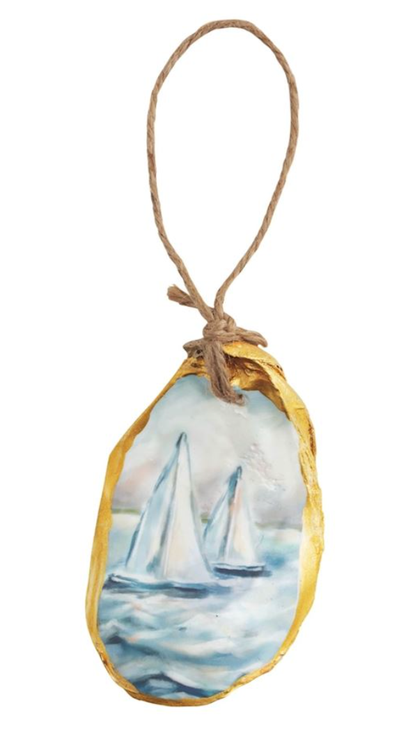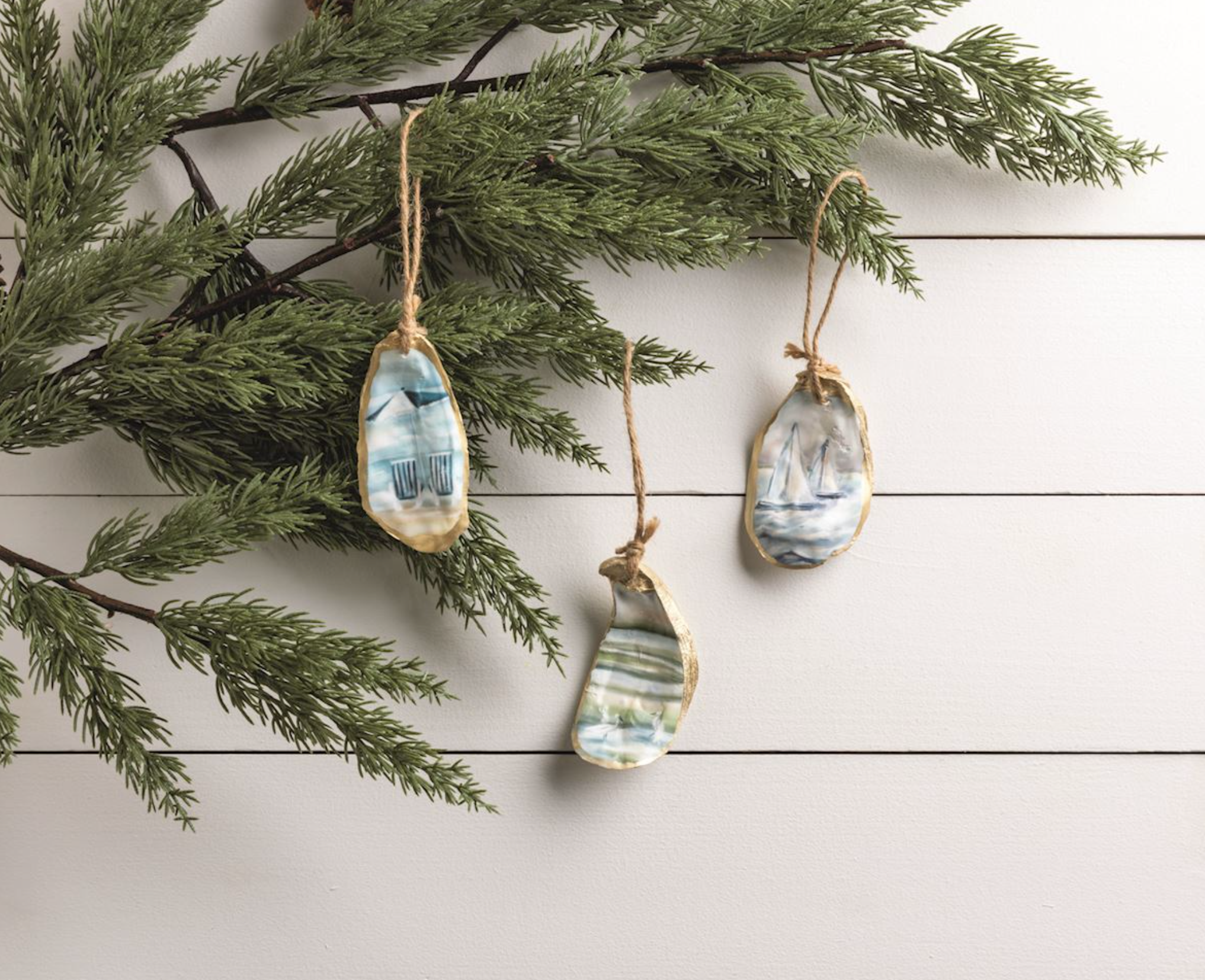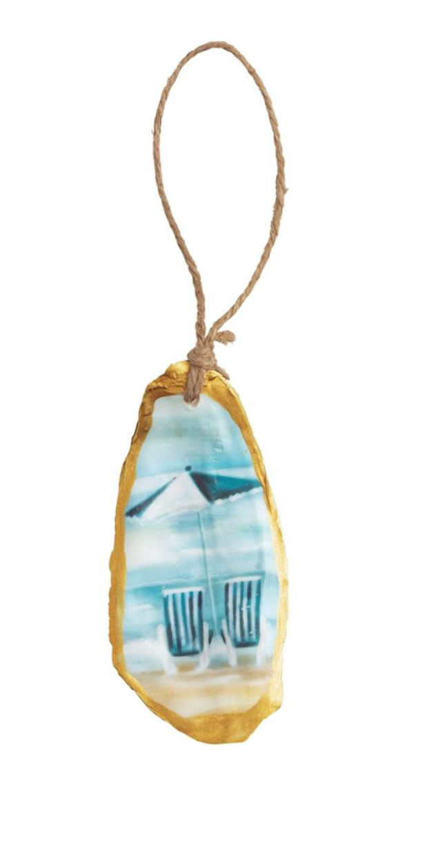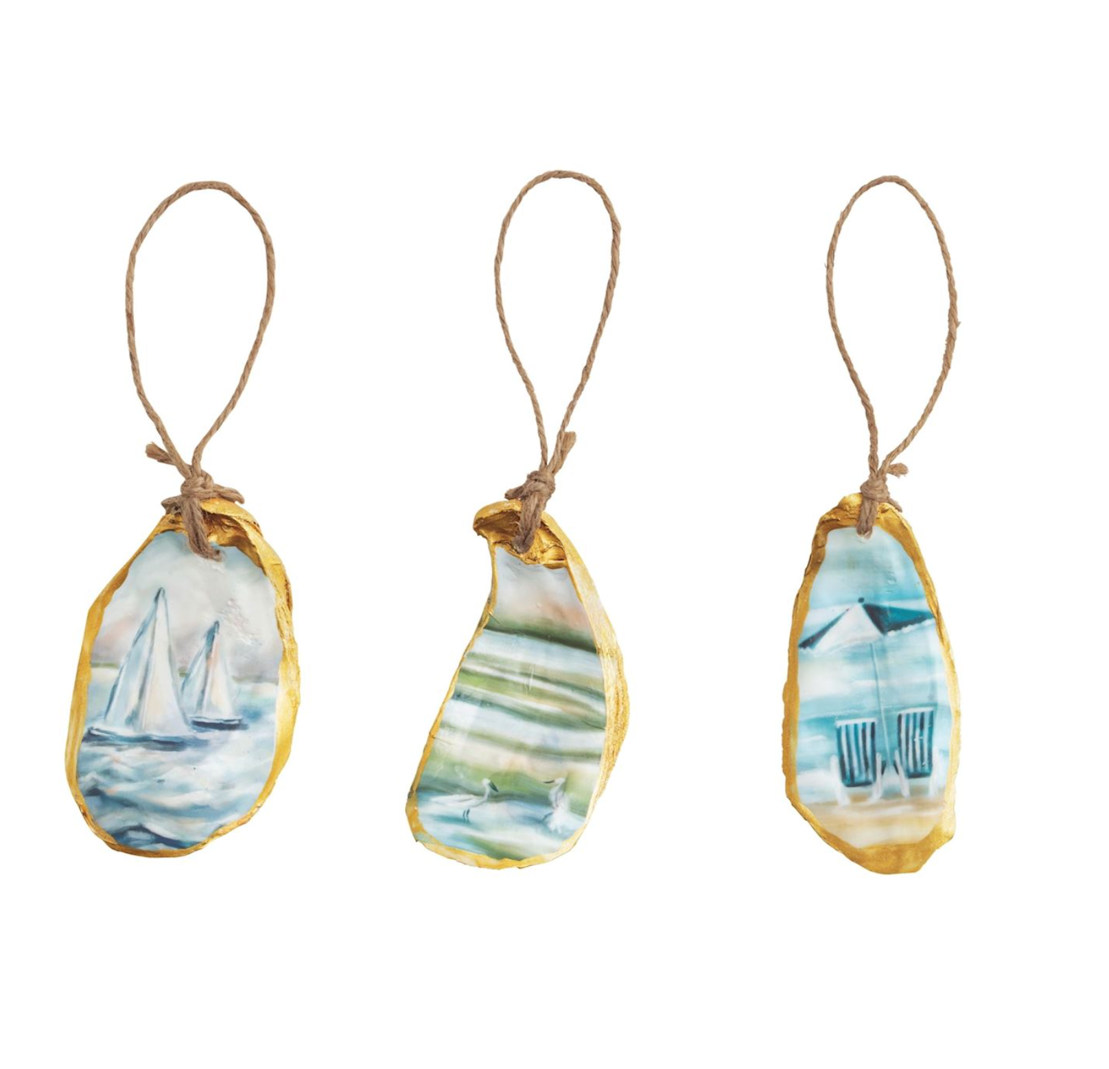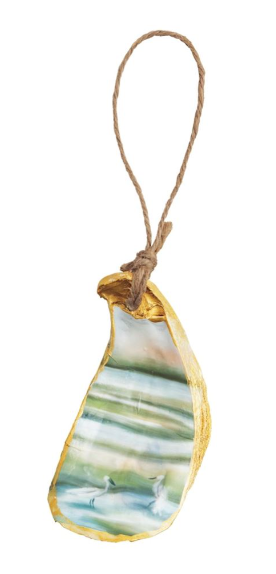 Oyster shell ornament with artwork interior scene and jute hanger.