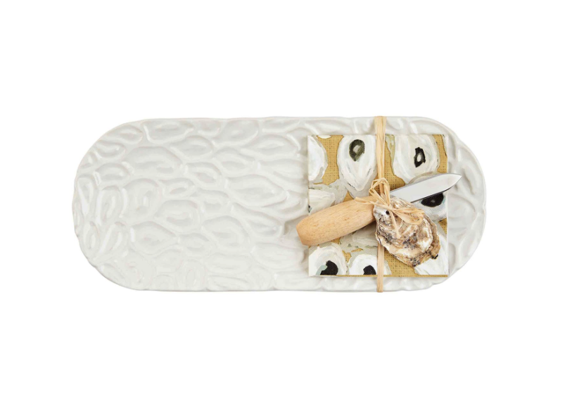 3-piece set. Stoneware oyster textured tray. Comes with pack of 12 cocktail napkins and wood and stainless oyster knife.