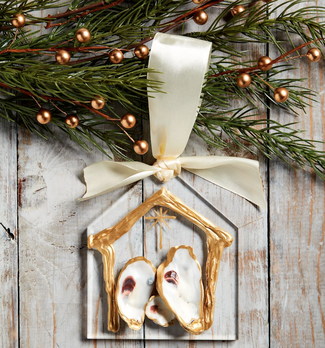 Acrylic plaque features hand-painted oyster Nativity scene and satin ribbon hanger.