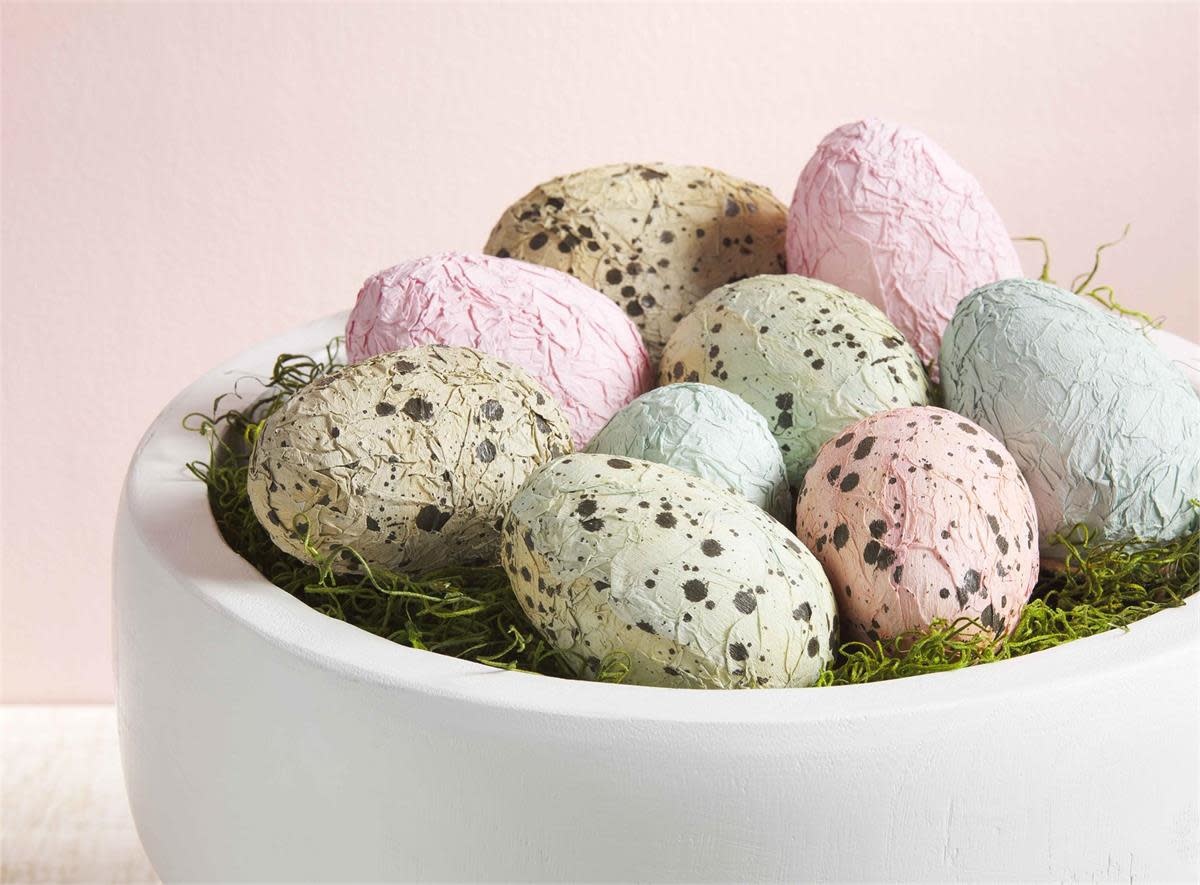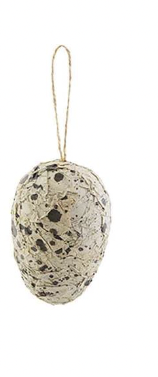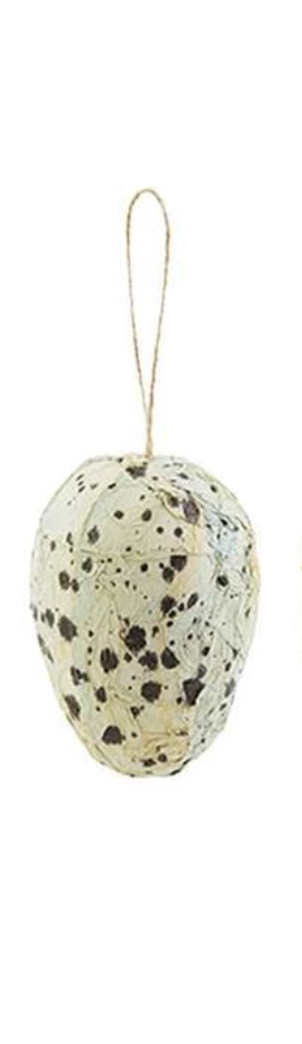 Paper mâche egg with jute rope hanger. Can be used as basket/bowl filler or hung on tree/around house as décor. For indoor use only.