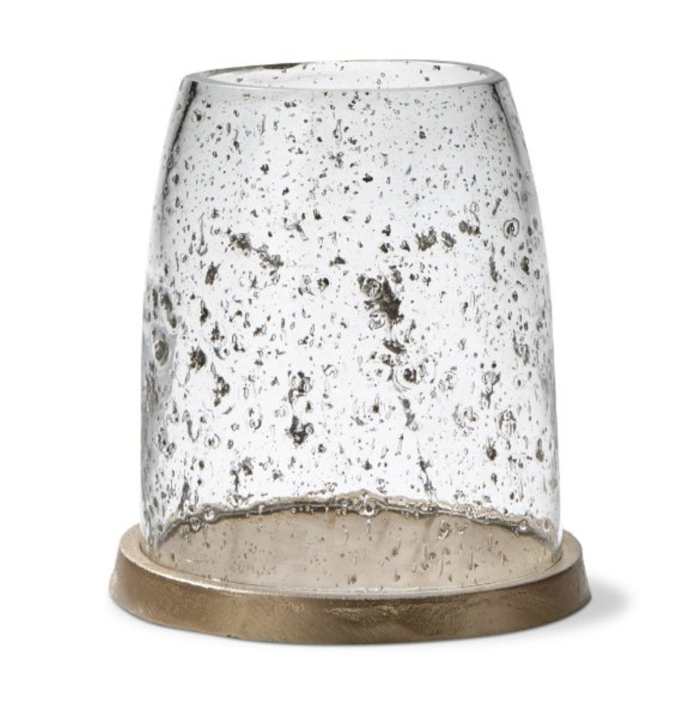 illuminate your space with our stunning cabo hurricane. handcrafted by artisans using blown glass techniques, it's the perfect accent piece for any room. whether you use it to light up your candles or as a stand-alone or filled decor piece, this hurricane is sure to make a style statement. features cast metal bottom. holds up to a 3 x 4 pillar candle, sold separately.