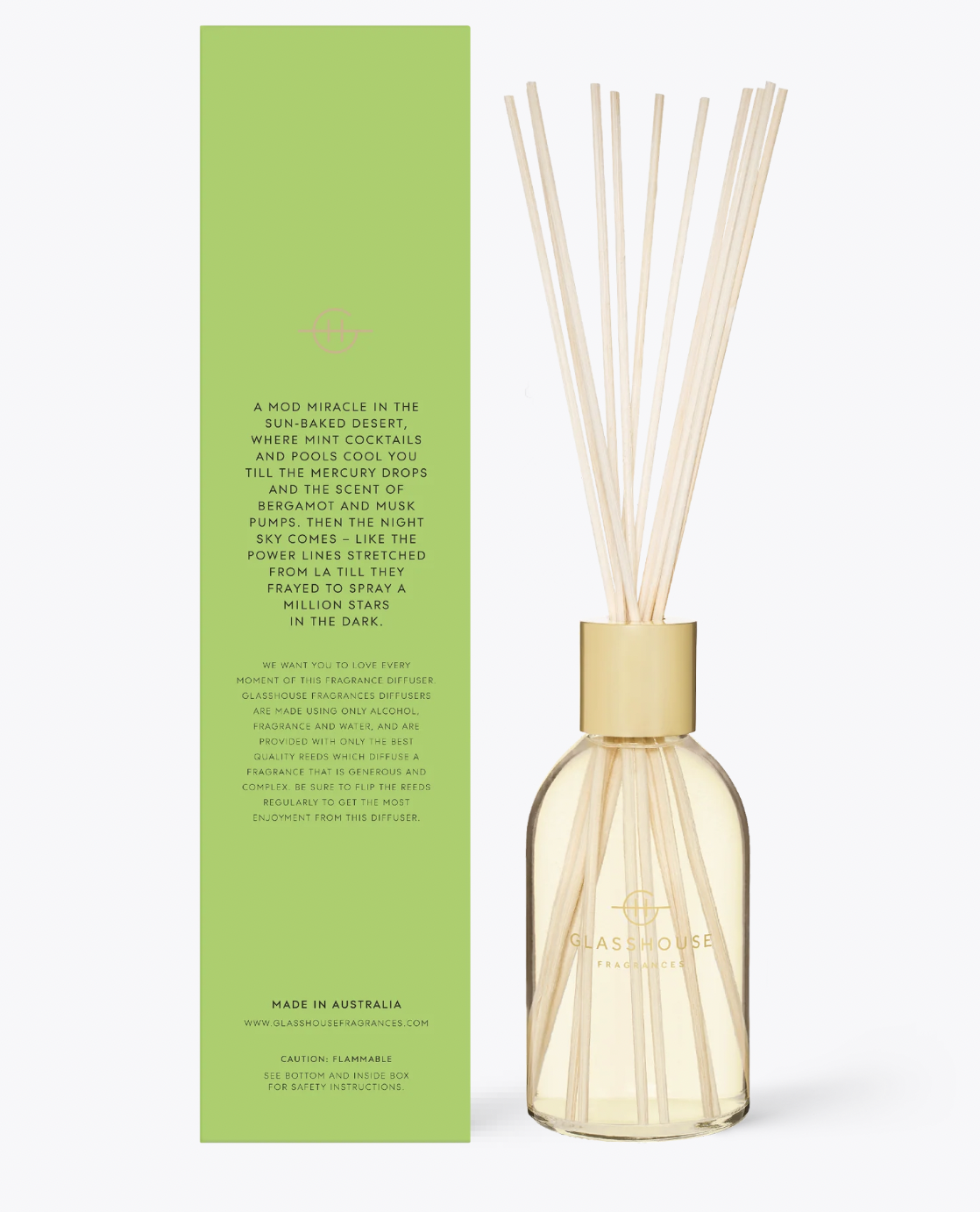 Made using only alcohol, fragrance and water and are provided with only the best quality reeds which diffuse a fragrance that is generous and complex. Made in Australia.