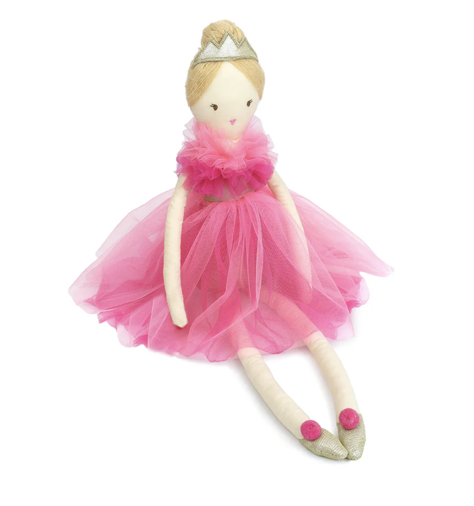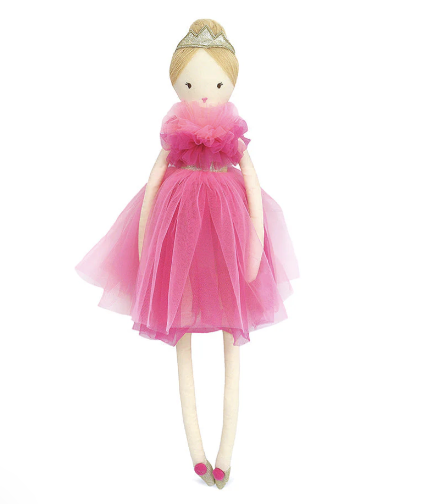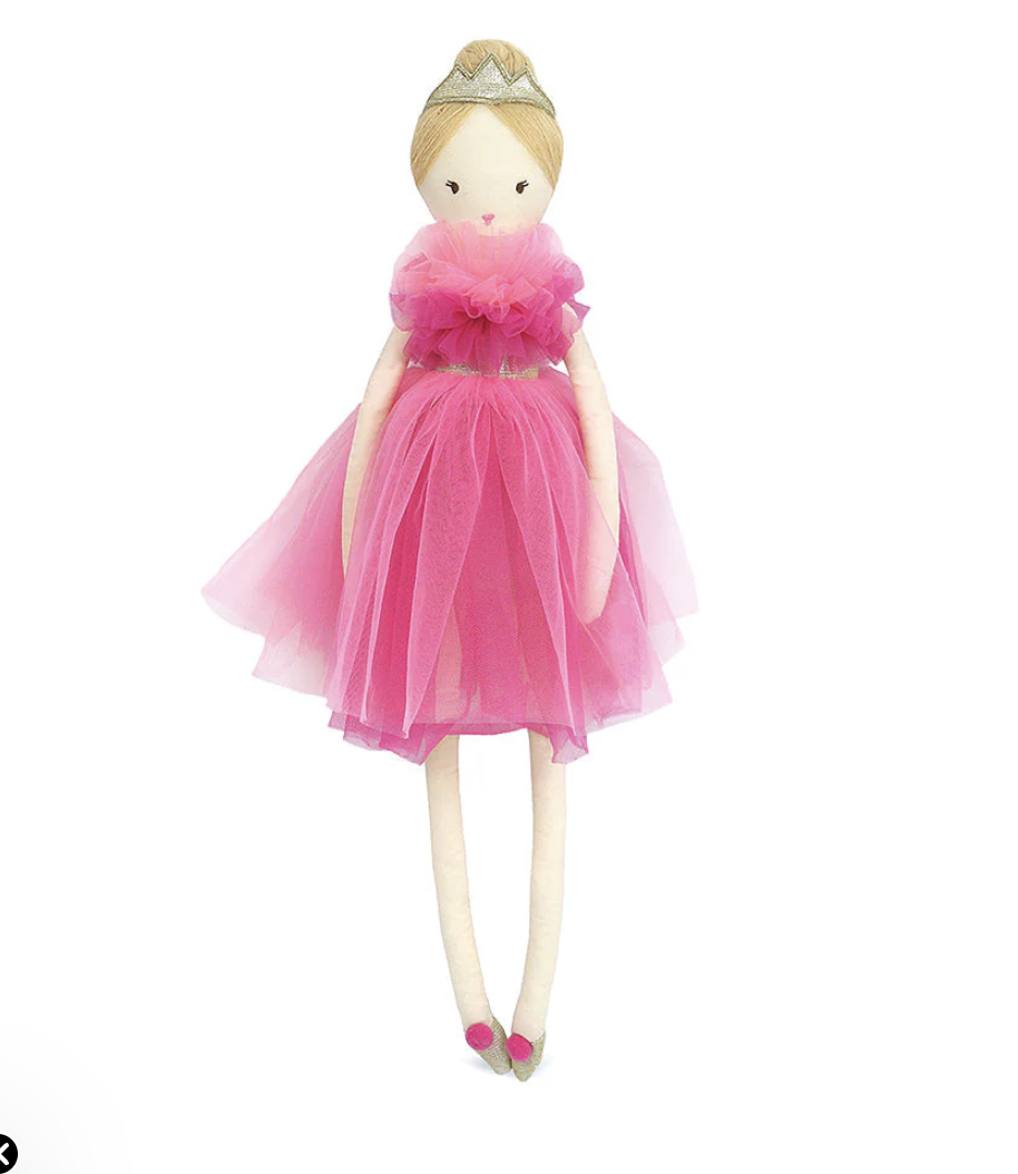 Pretty in hot pink! This Mon Ami® Princess Sophia Soft Doll rules any playroom with her statement-making style. Dressed to impress in a frothy fuchsia tulle dress and pink pom-pom slippers with a gold crown perched in her sleek chignon, this princess doll is ready for hours of imaginative play. This sophisticated soft doll is also easy to snuggle, whether a movie night or story time is on the agenda. The little girl in your life will be thrilled to welcome her royal highness princess doll into her kingdom.