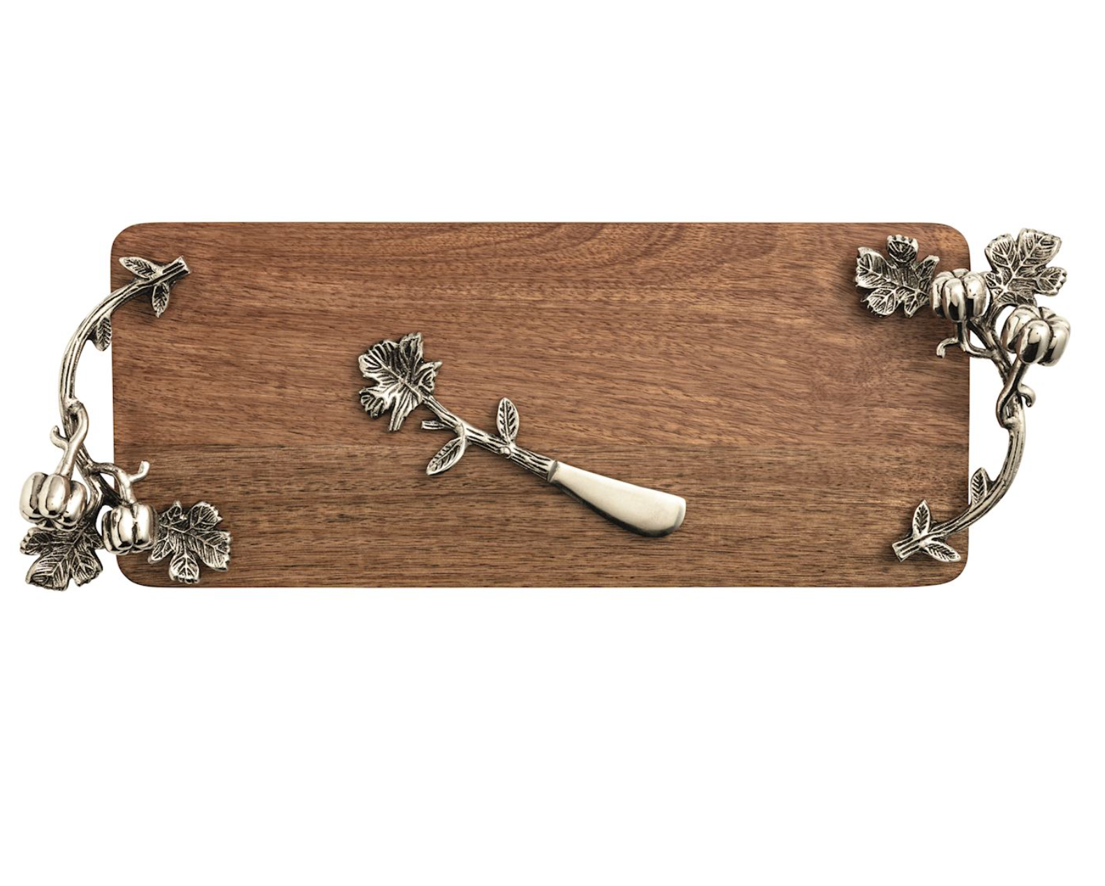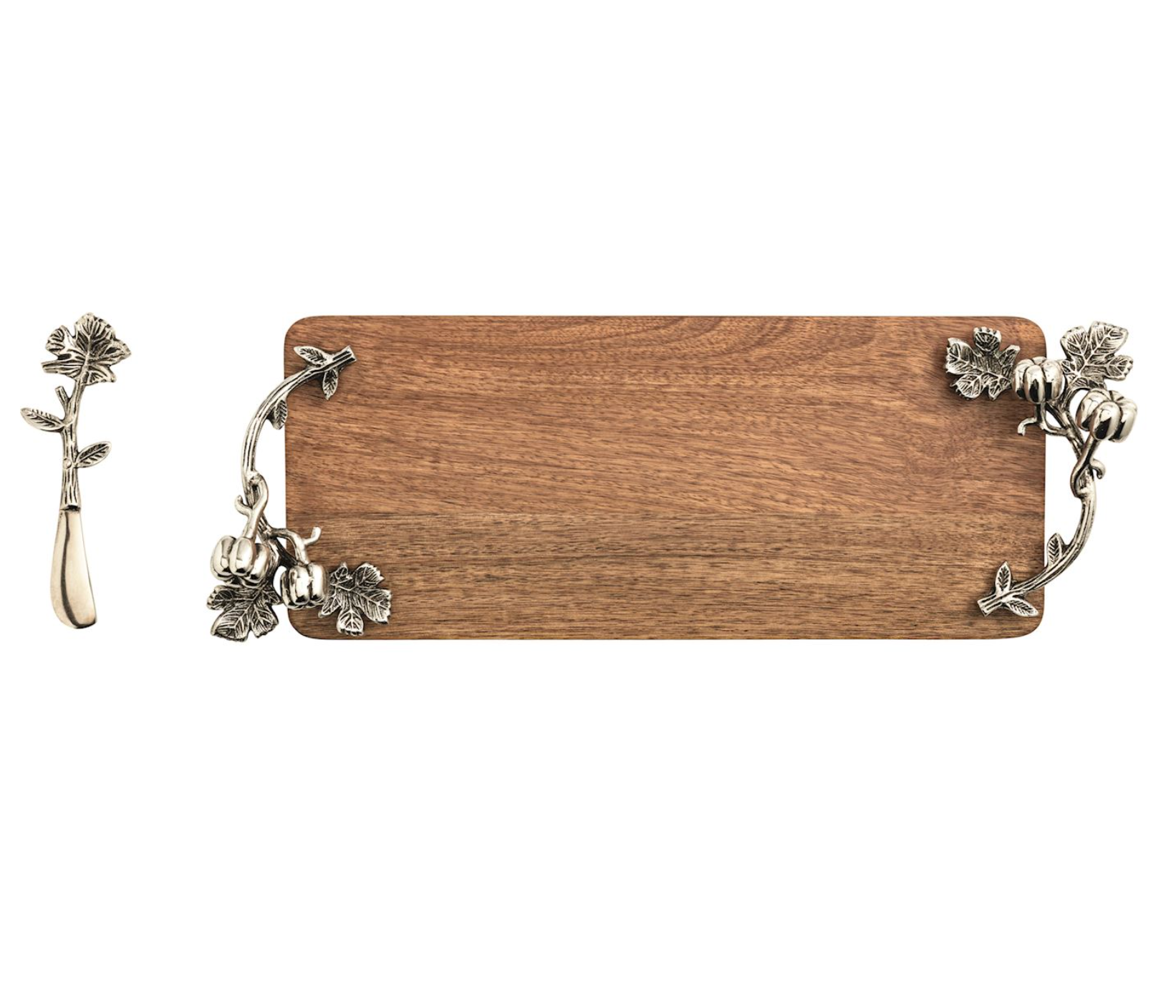 2-piece set. Mango wood board features cast aluminum sculpted handles. Comes with stainless steel spreader with coordinating cast aluminum handle.