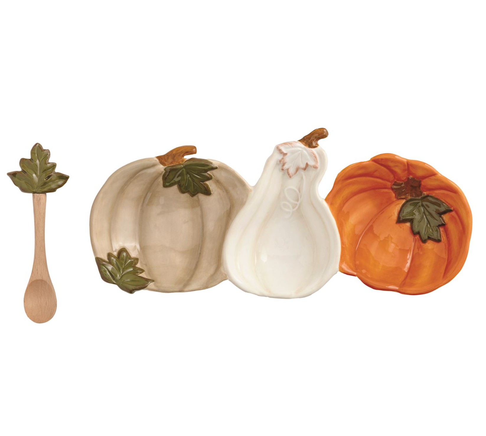 2-piece set. Stoneware triple dip server with layered stoneware leaves. Comes with mango wood spoon with stoneware leaf handle.