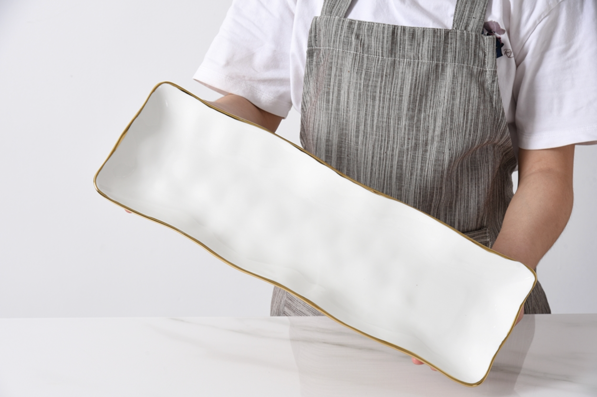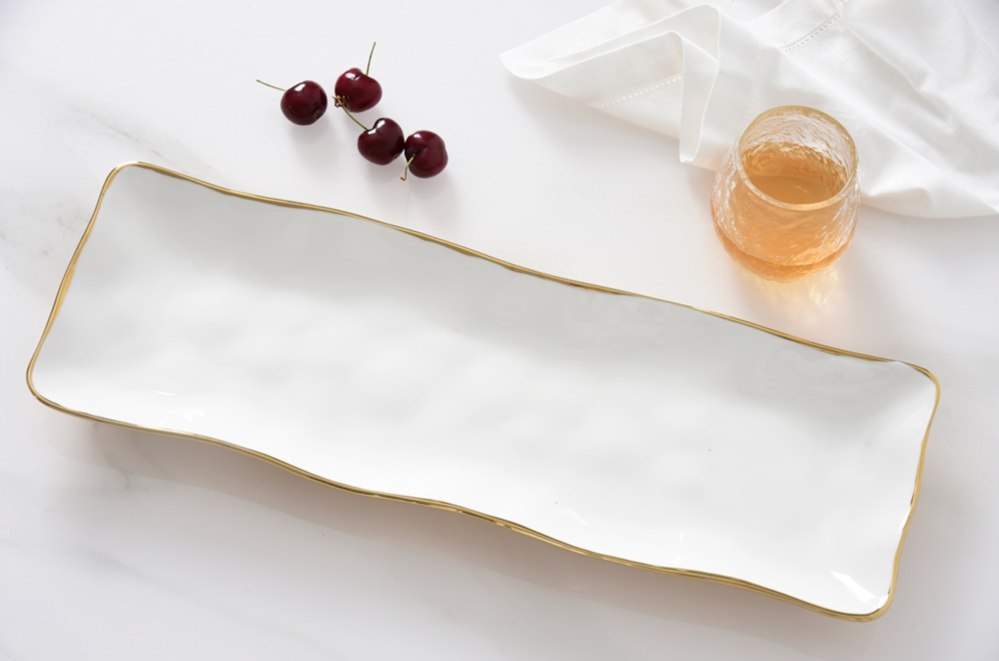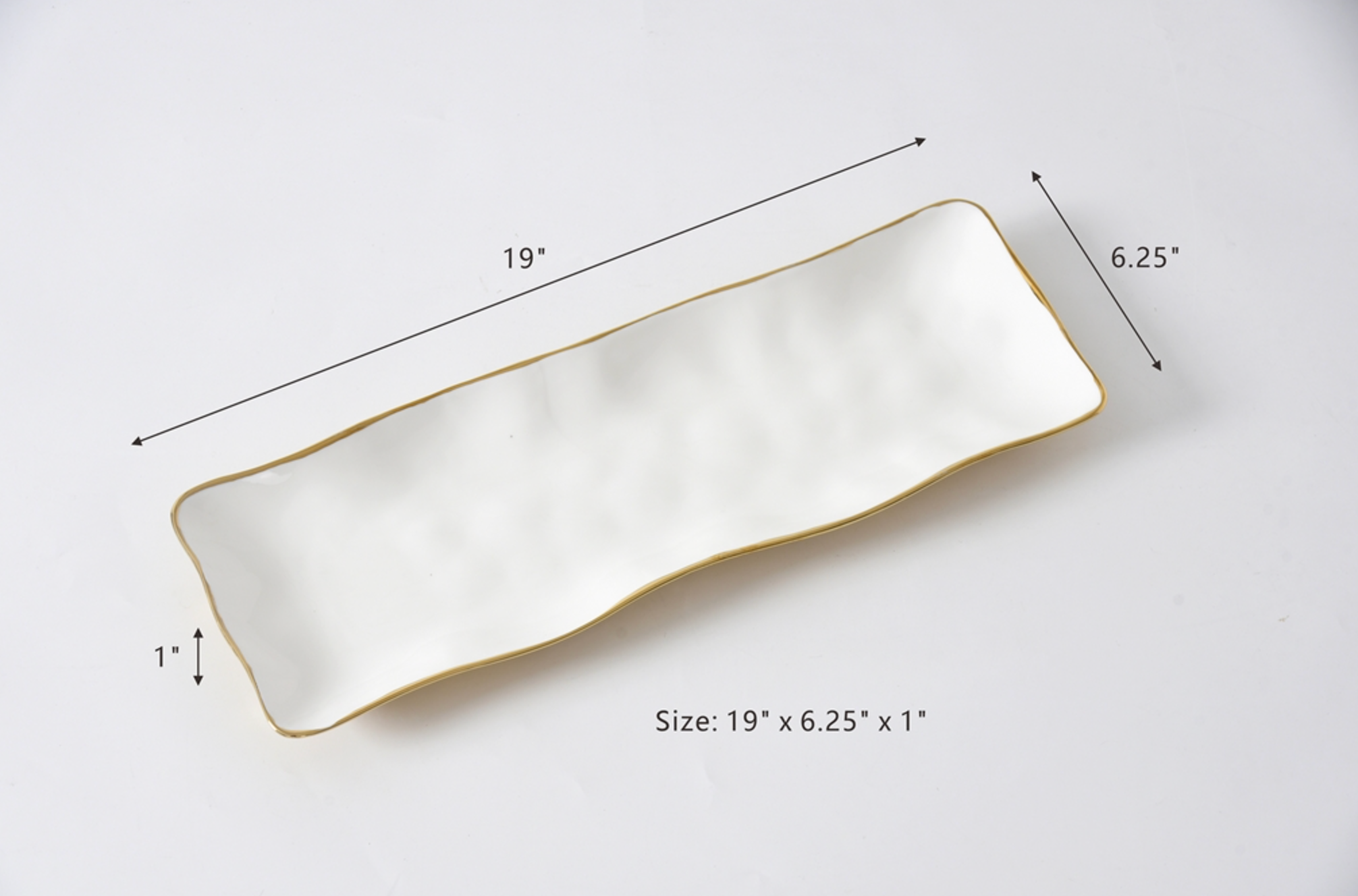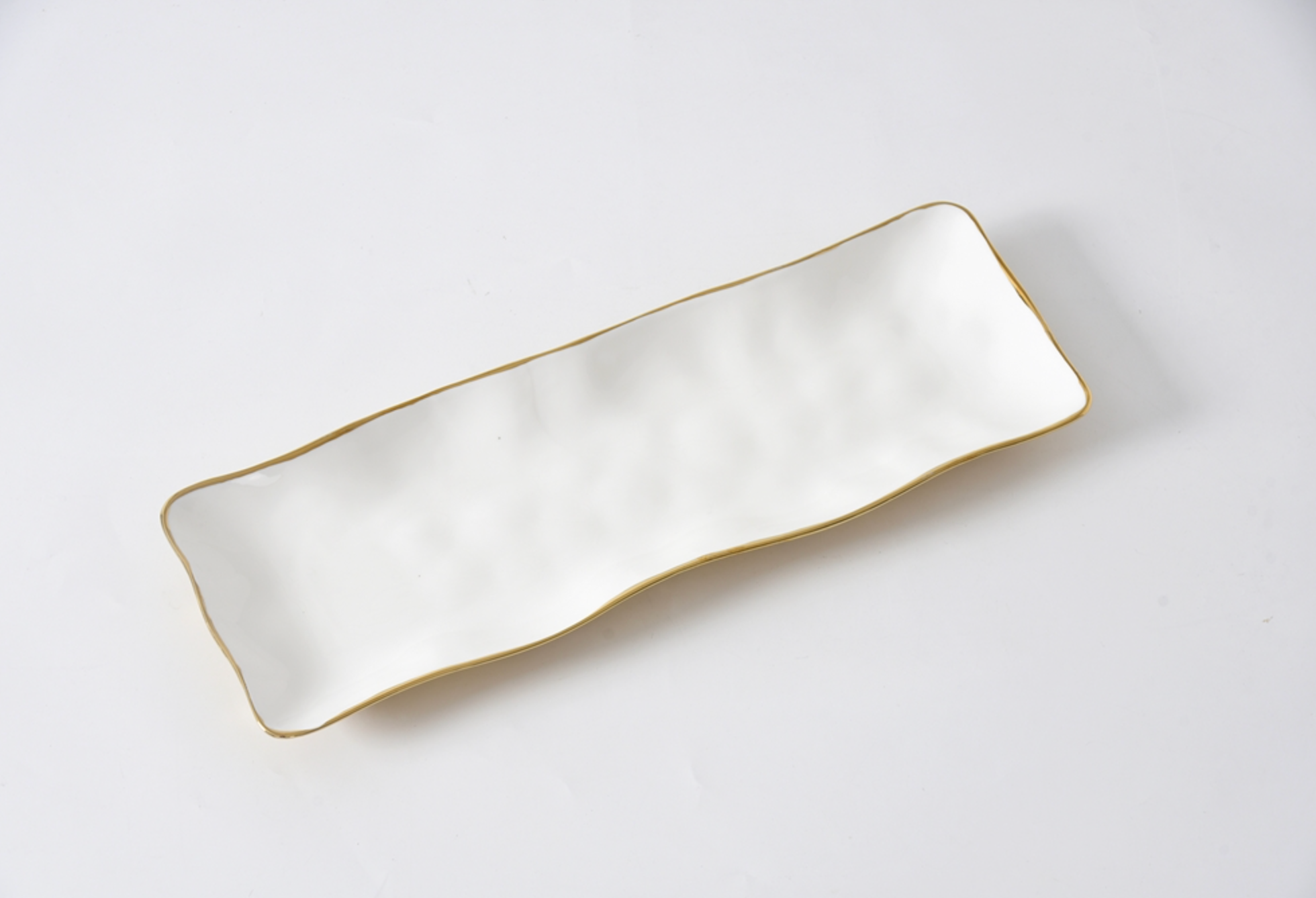 Rectangular Serving Piece from the Moonlight Collection. An incredibly versatile all-purpose serving platter makes an easy transition from oven to table. Show off your delicious appetizers, side dishes and desserts on this beautiful platter! Crafted in a luxurious white high-fired porcelain and dazzling gold. Food safe, dishwasher safe, oven safe to 500°. Tarnish and stain-free. Easy Care.