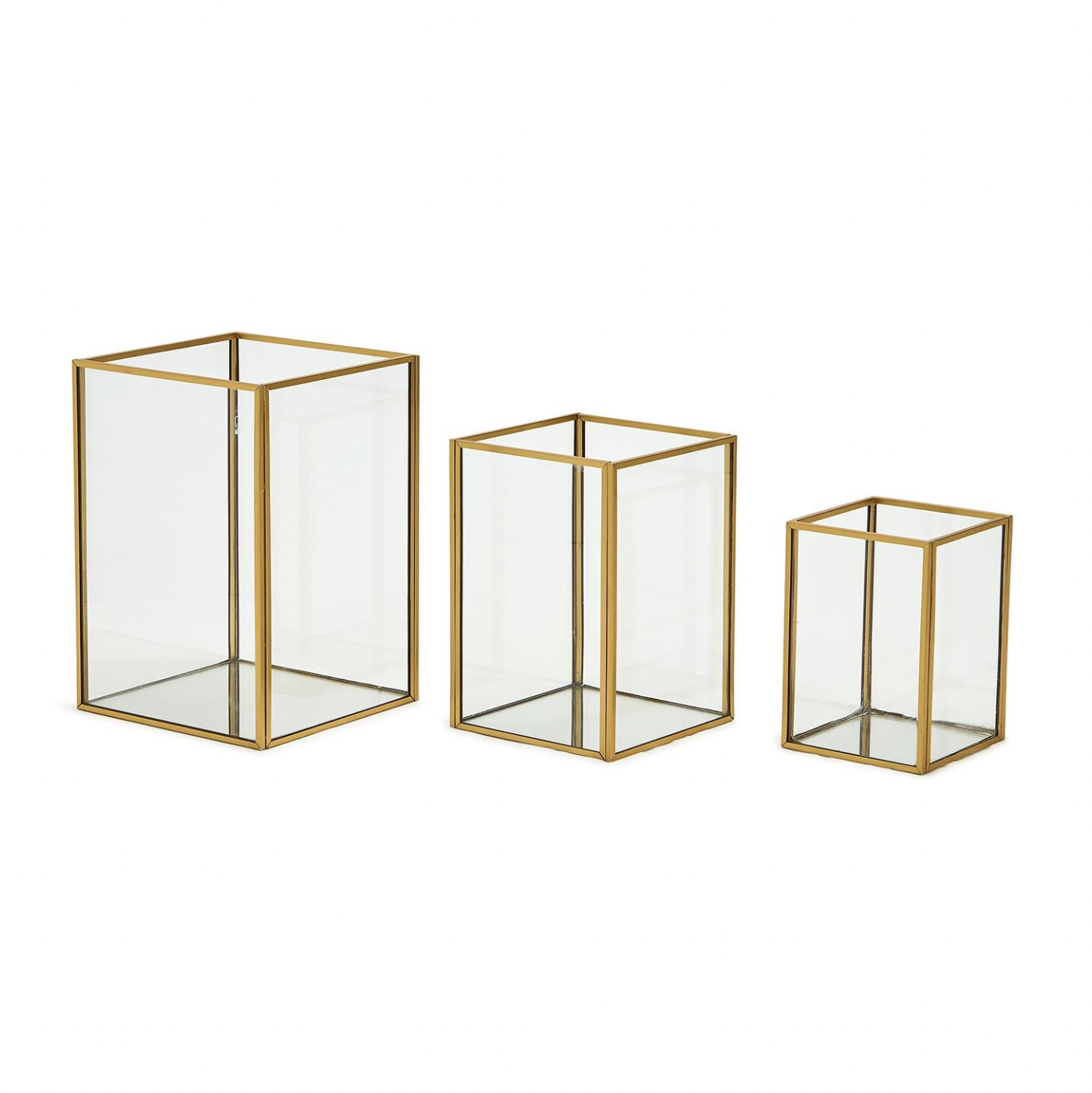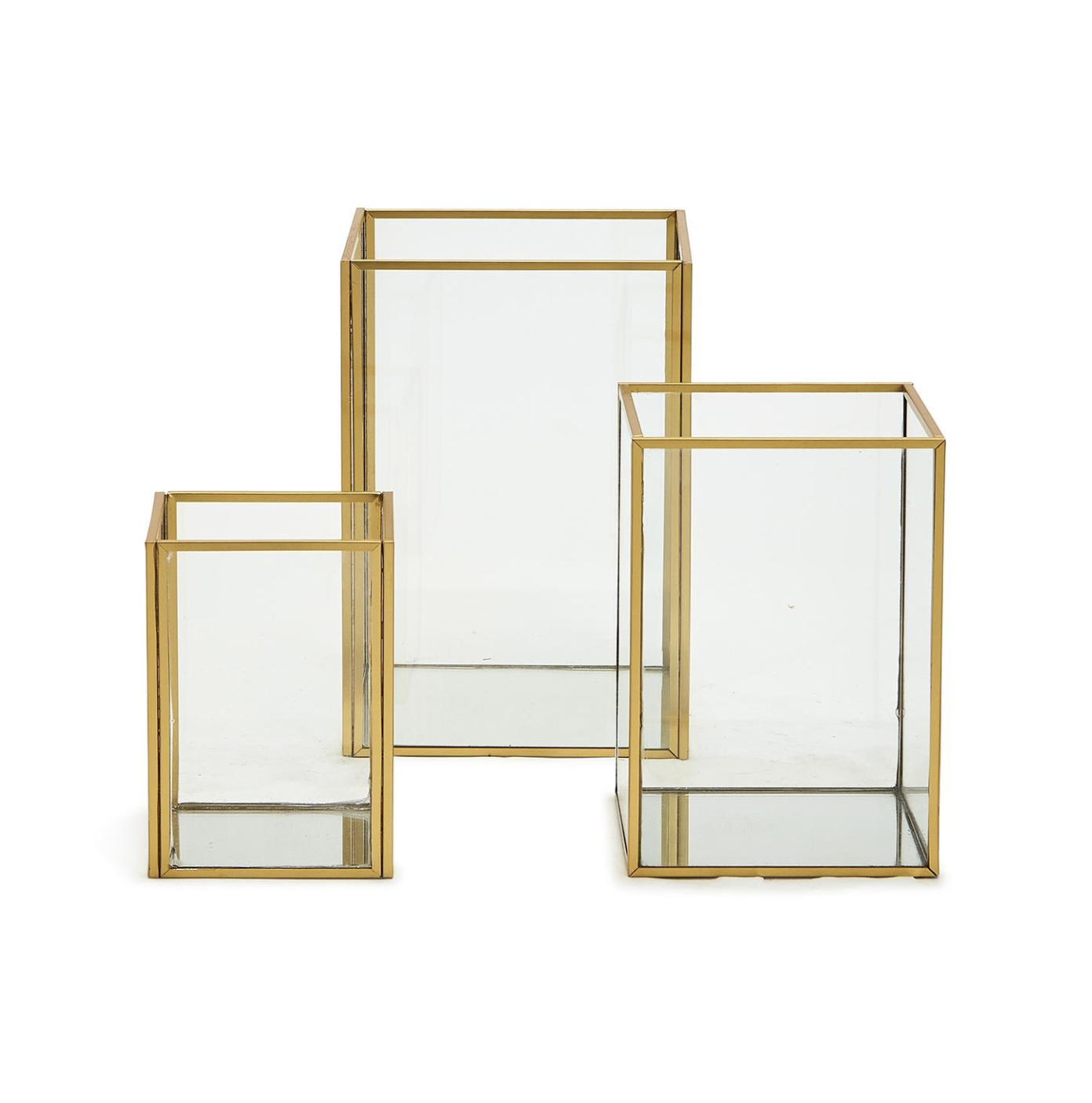 These exquisite gold-trimmed windowed vases are the perfect place for flowers and greenery creating an inspiring 360-degree display of beauty. Meticulously crafted with a sleek metal edge, these vases are designed in a perfect balanced shape, making flower arranging an effortless endeavor. The mirrored base adds a touch of enchantment as it beautifully reflects the contents within. Versatility becomes second nature as these vases effortlessly transform into candle holders, flower vases, or elegant showcases for your beloved treasures. Embrace the captivating beauty of this remarkable addition to your home, where functionality meets timeless design, creating a space that exudes refined elegance and charm.