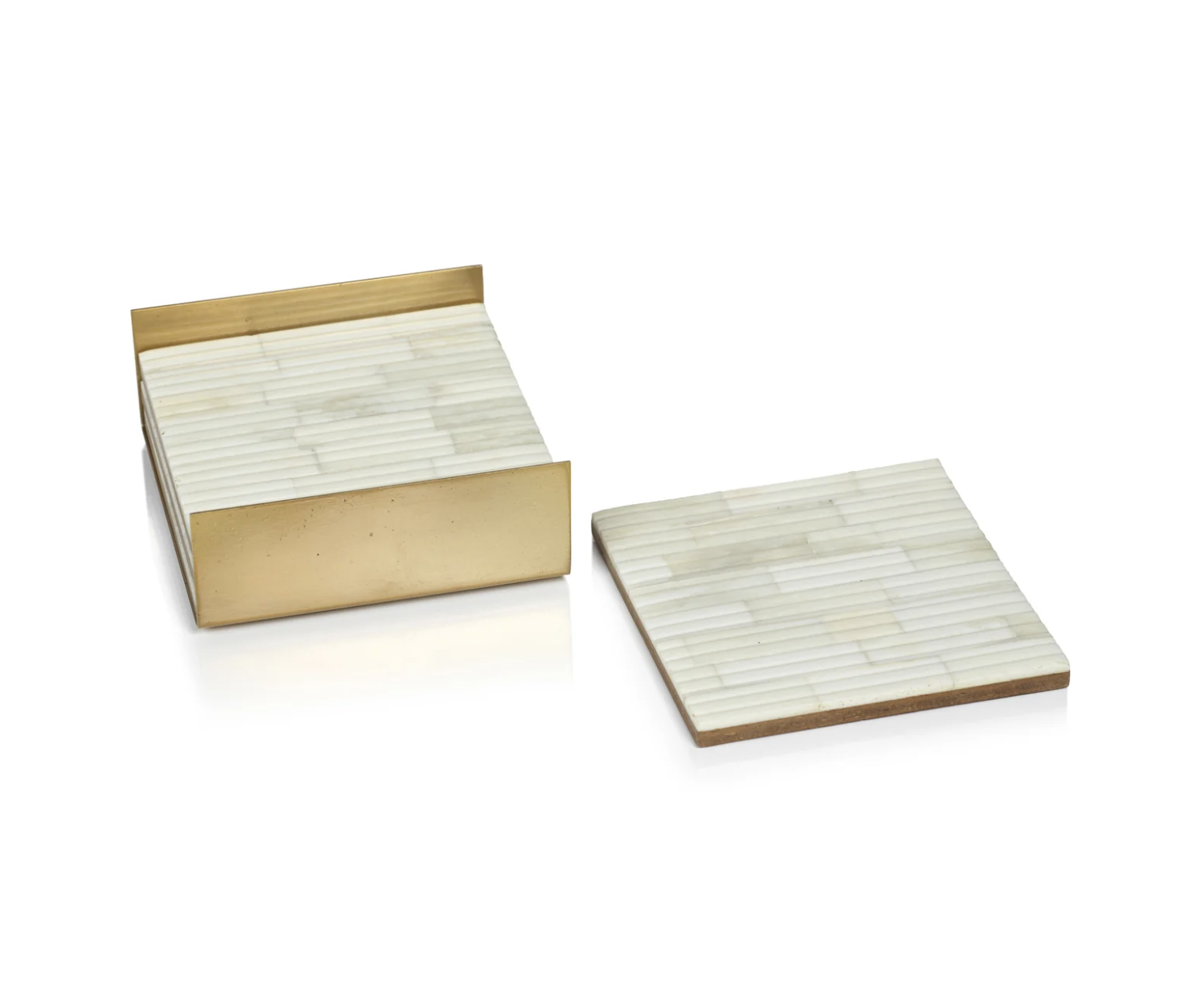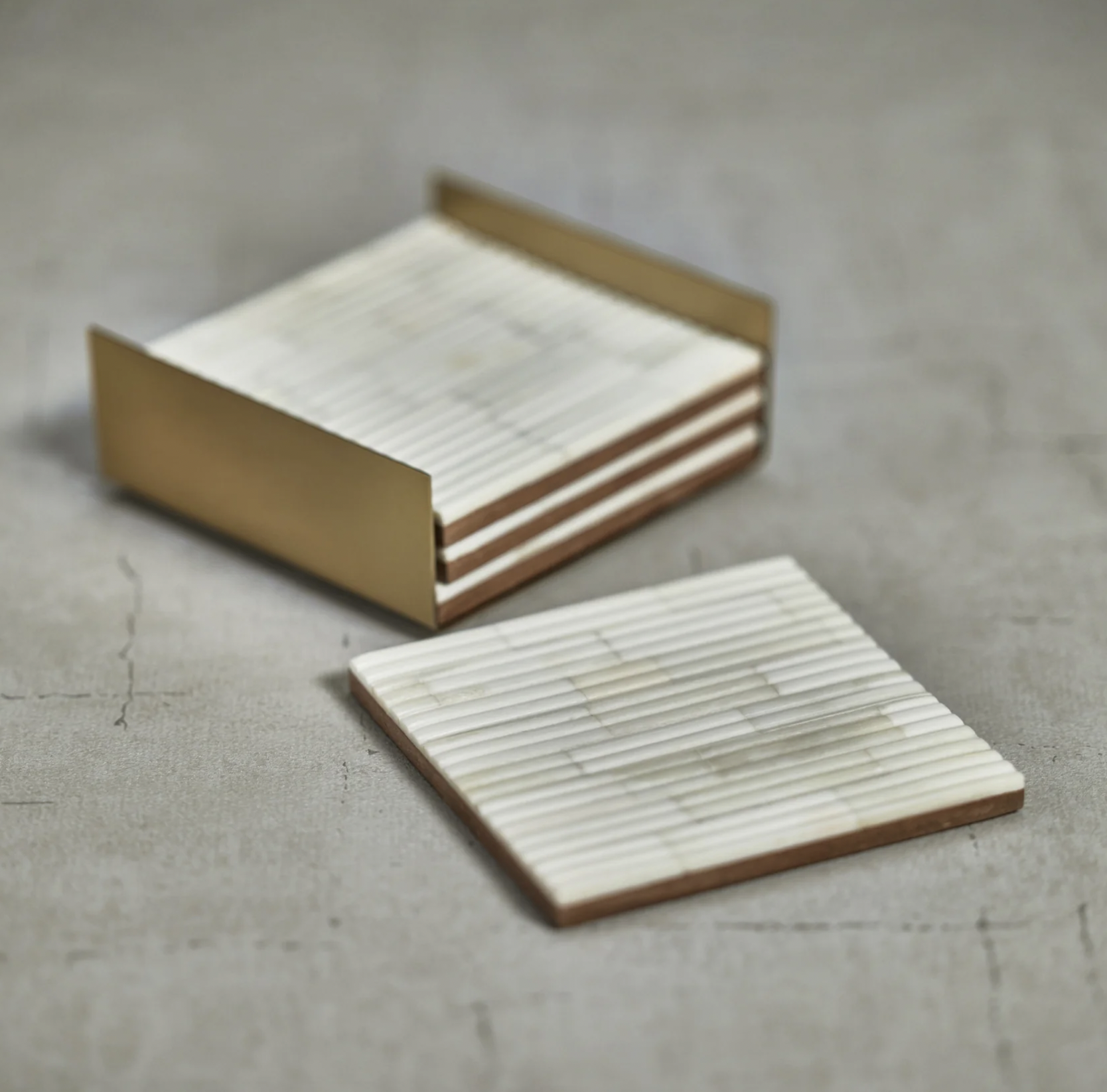 Ribbed Bone Coasters - Set of 4 in Metal Tray - White