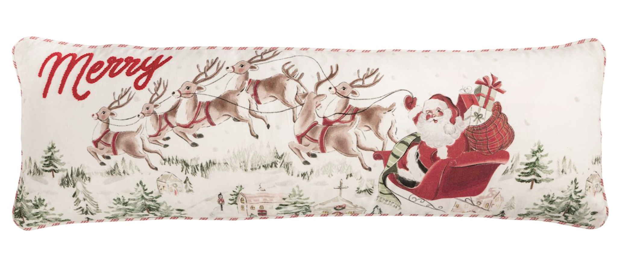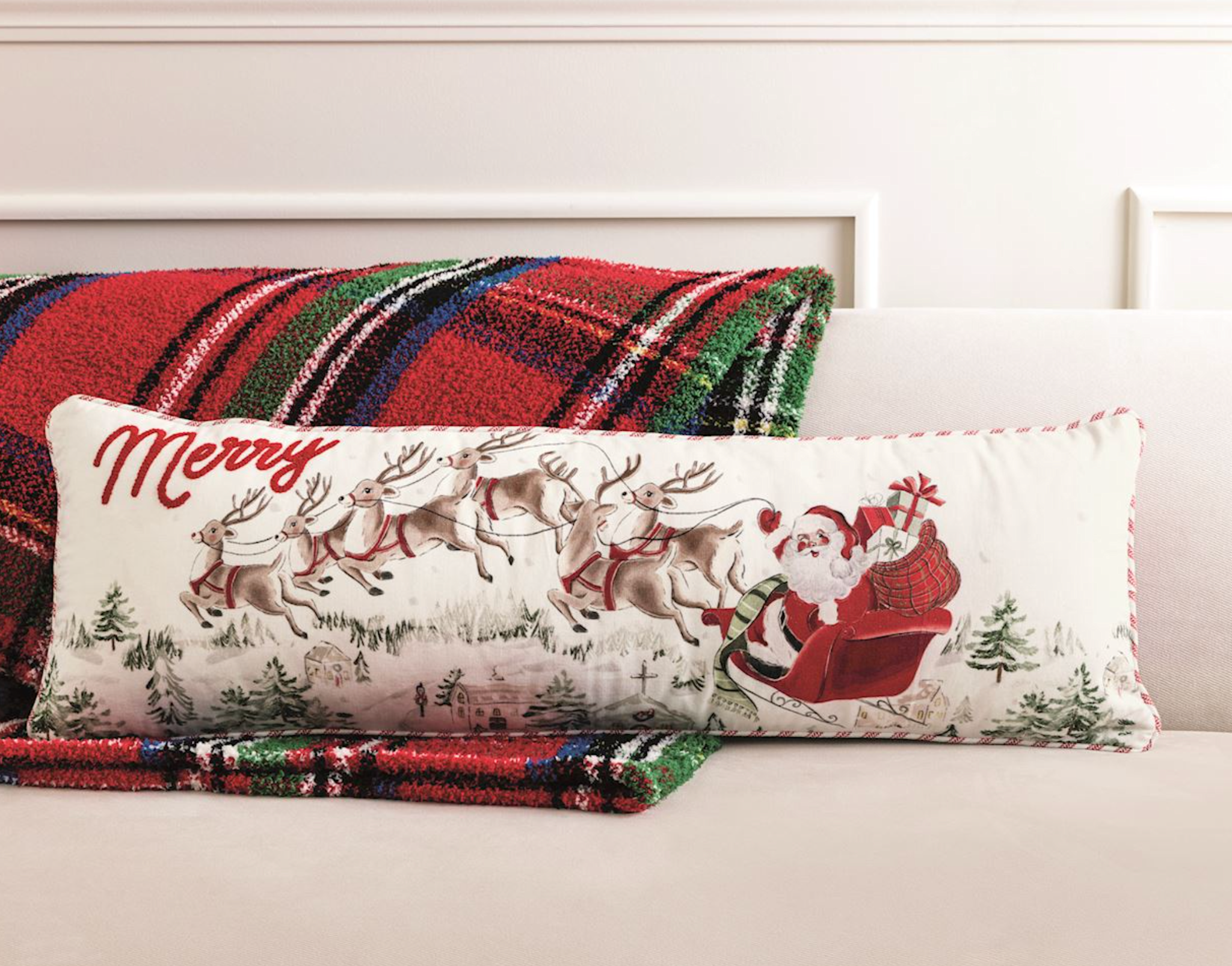 Embroidered canvas long pillow features striped piped edge, woven tartan backing and zipper closure.